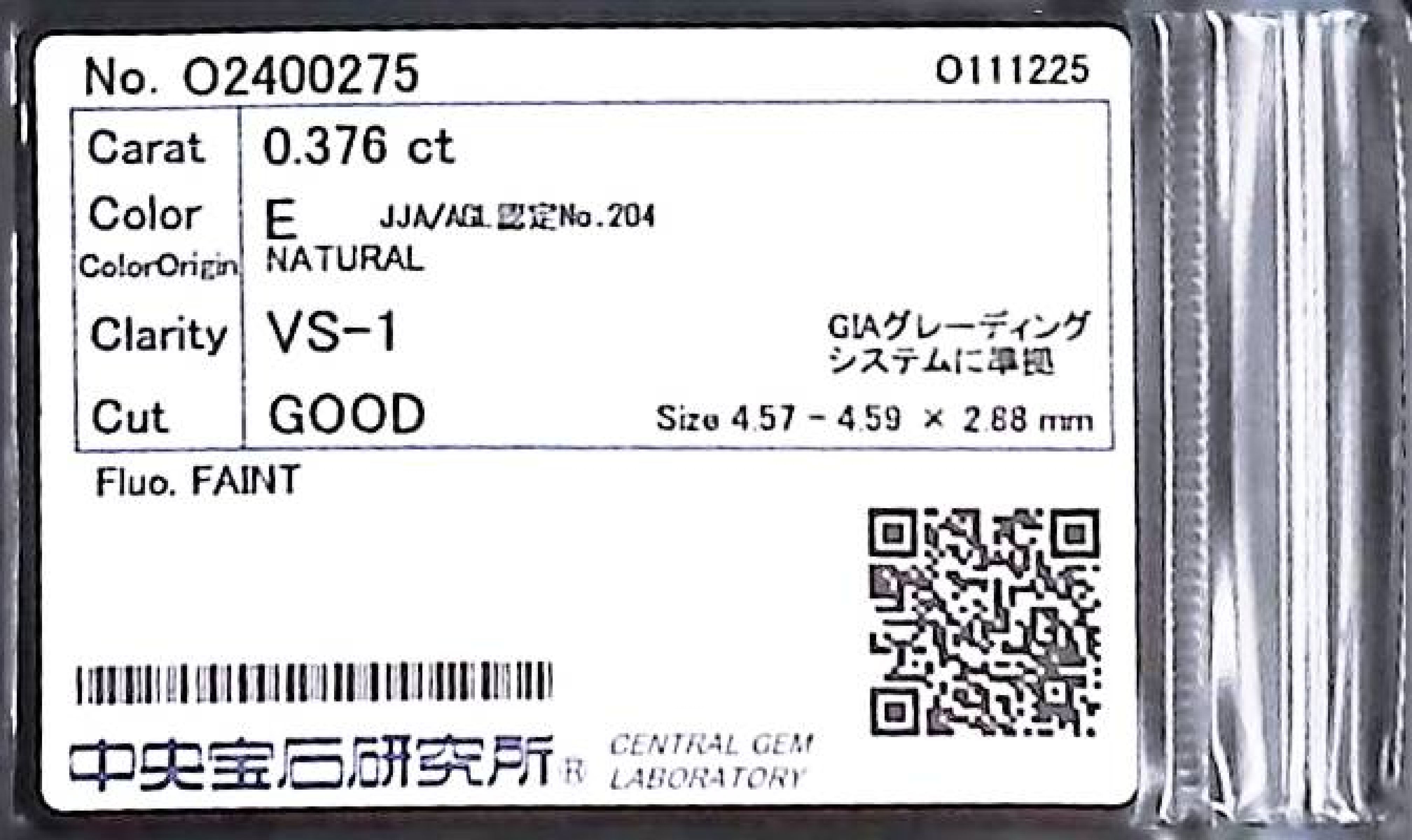 (10980_0312)0.376ct E VS-1 GOOD/VG/GD FAINT NATURAL 4.57-4.59X2.88mm ダイヤ・ルース