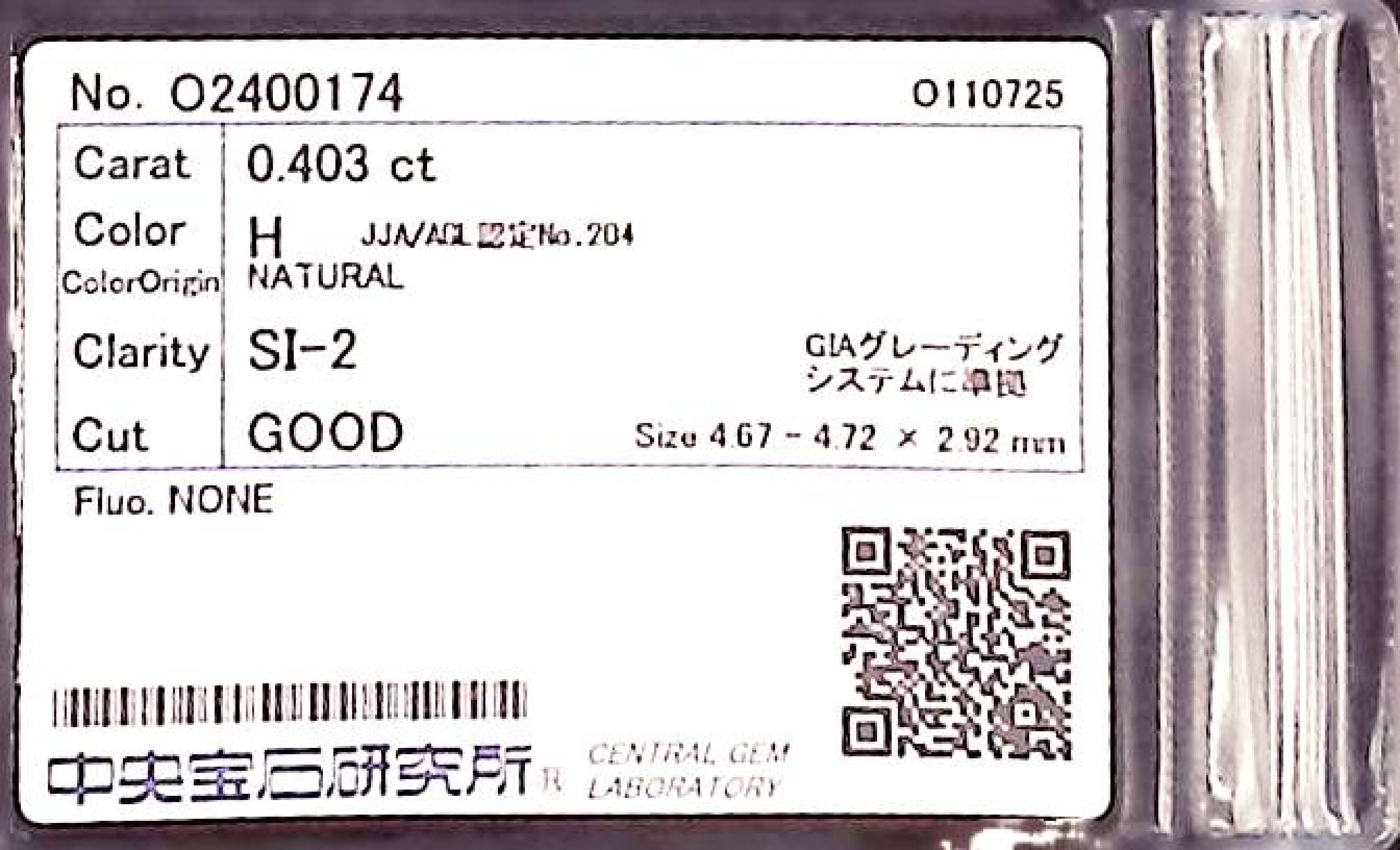 (10980_0339)0.403ct H SI-2 GOOD/GD/GD NONE NATURAL 4.67-4.72X2.92mm ダイヤ・ルース