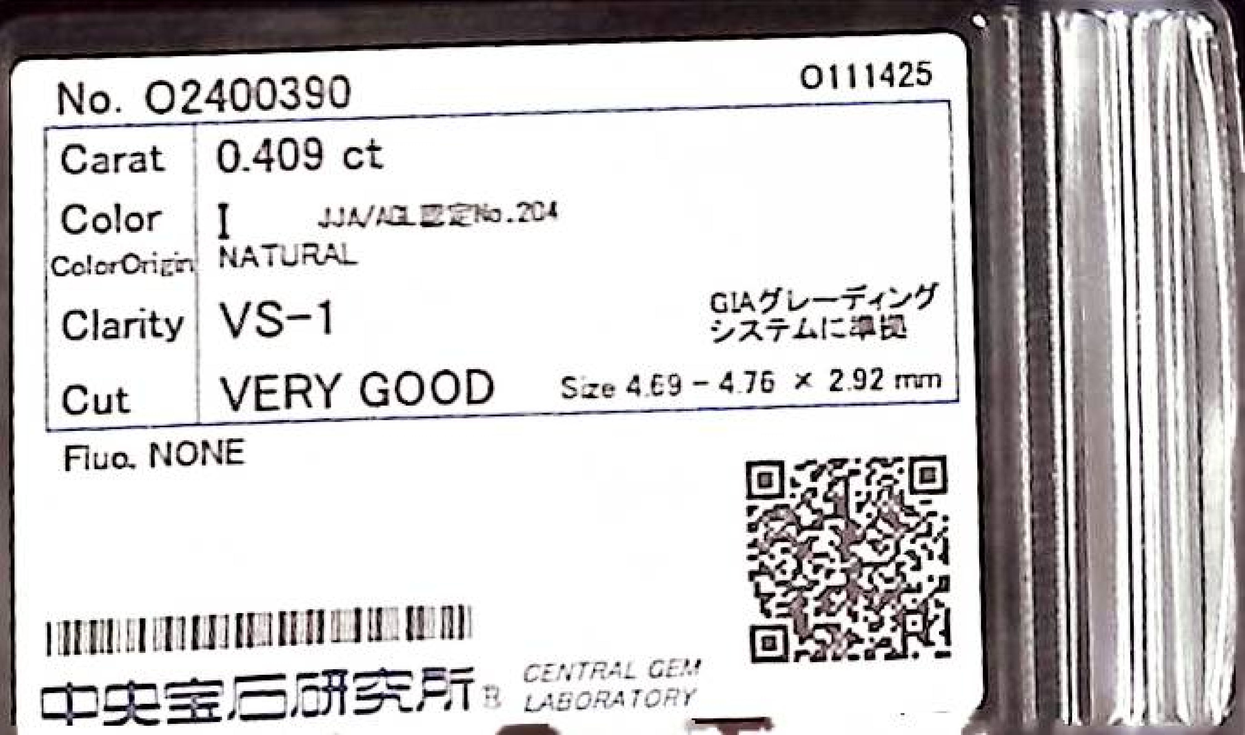 (10980_0349)0.409ct I VS-1 VERY GOOD/VG/GD NONE NATURAL 4.69-4.76X2.92mm ダイヤ・ルース
