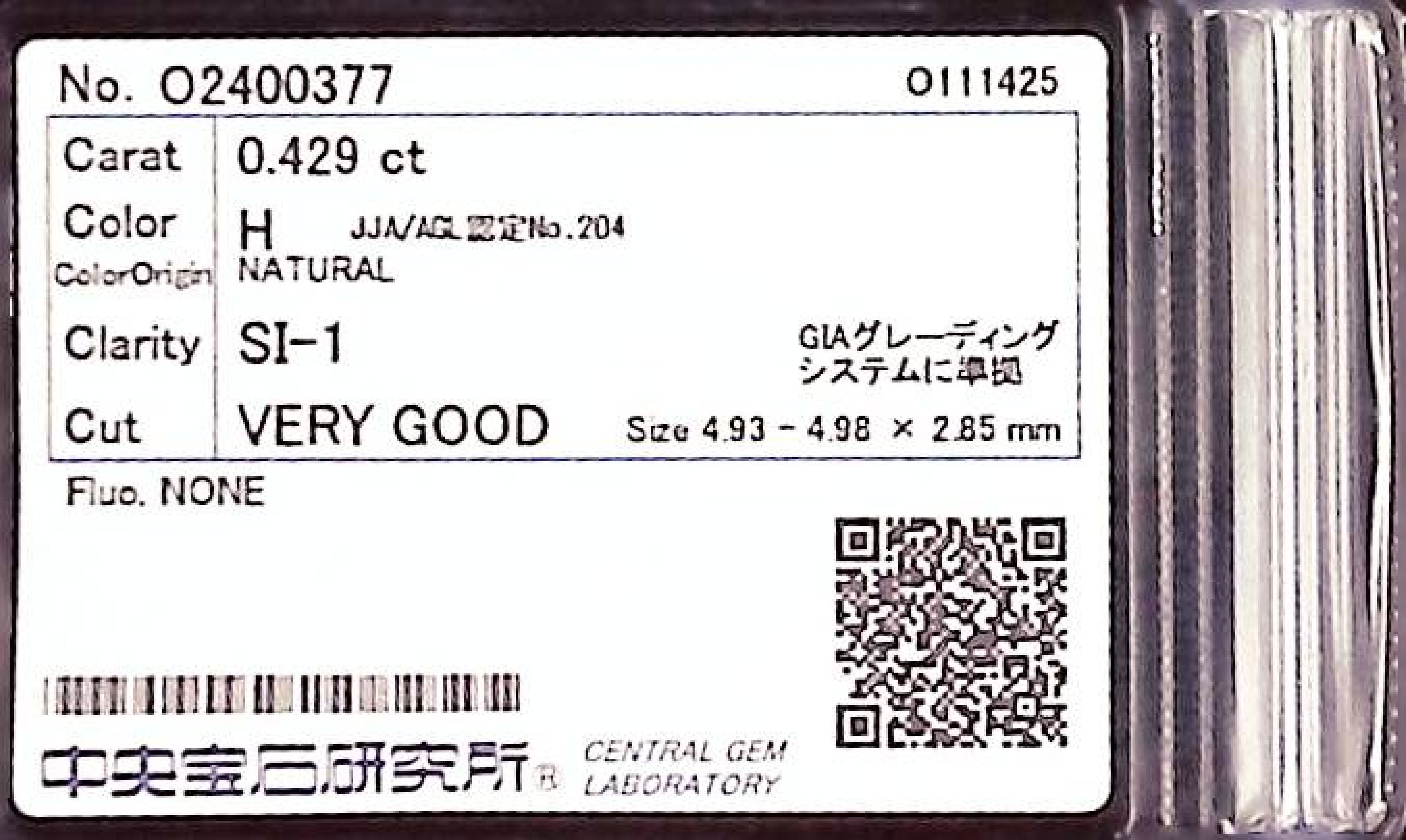 (10980_0370)0.429ct H SI-1 VERY GOOD/GD/GD NONE NATURAL 4.93-4.98X2.85mm ダイヤ・ルース
