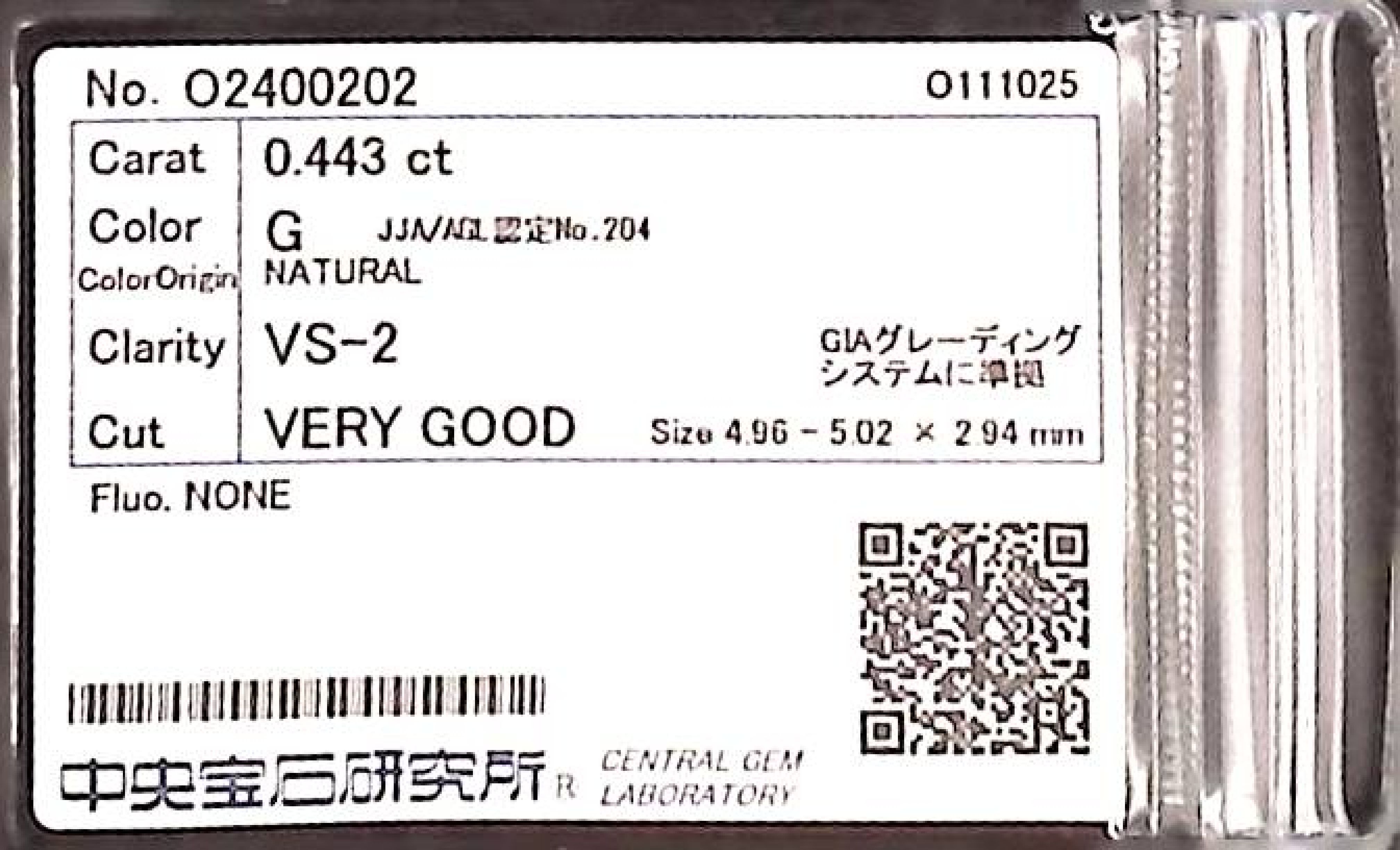 (10980_0385)0.443ct G VS-2 VERY GOOD/VG/VG NONE NATURAL 4.96-5.02X2.94mm ダイヤ・ルース