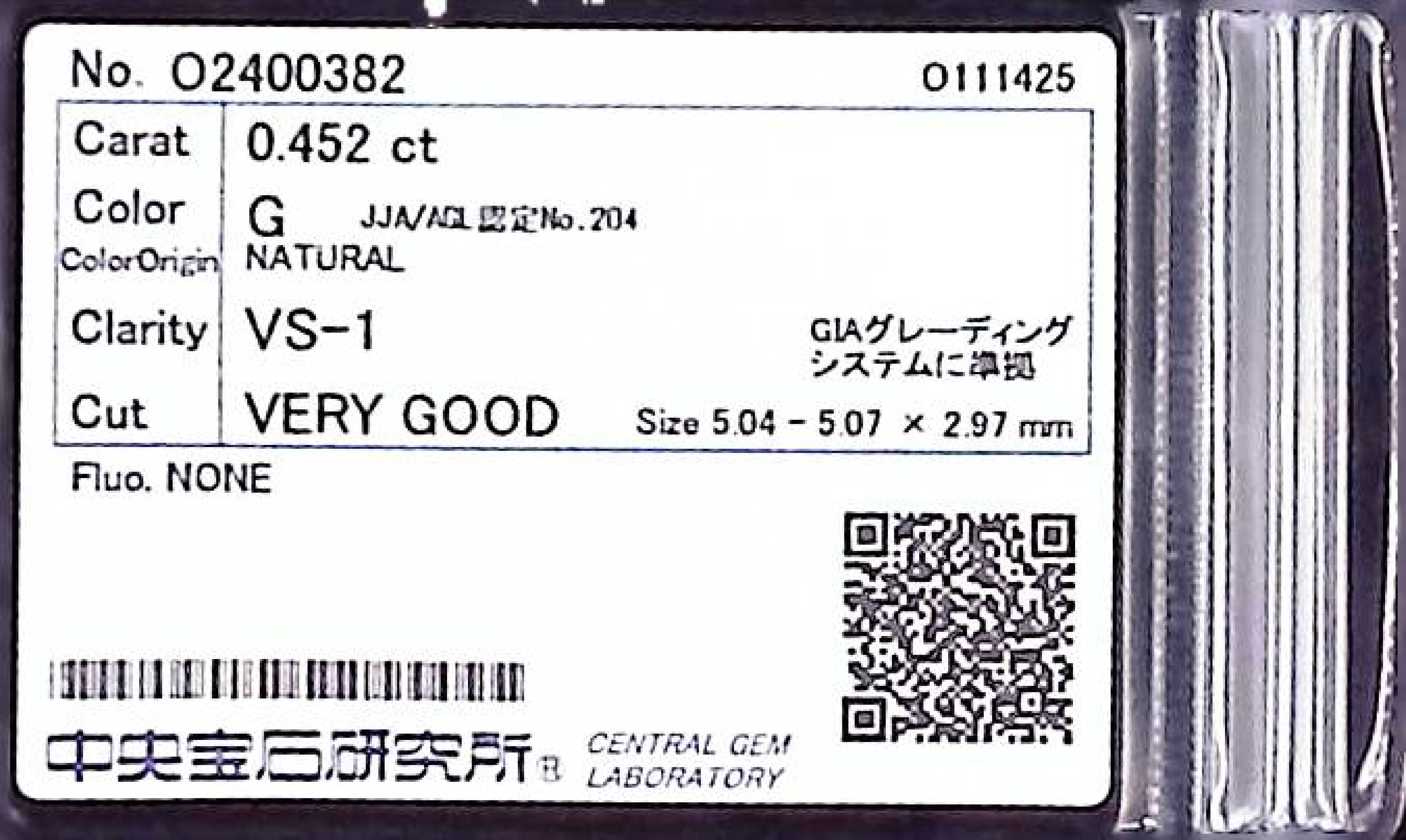 (10980_0387)0.452ct G VS-1 VERY GOOD/VG/GD NONE NATURAL 5.04-5.07X2.97mm ダイヤ・ルース