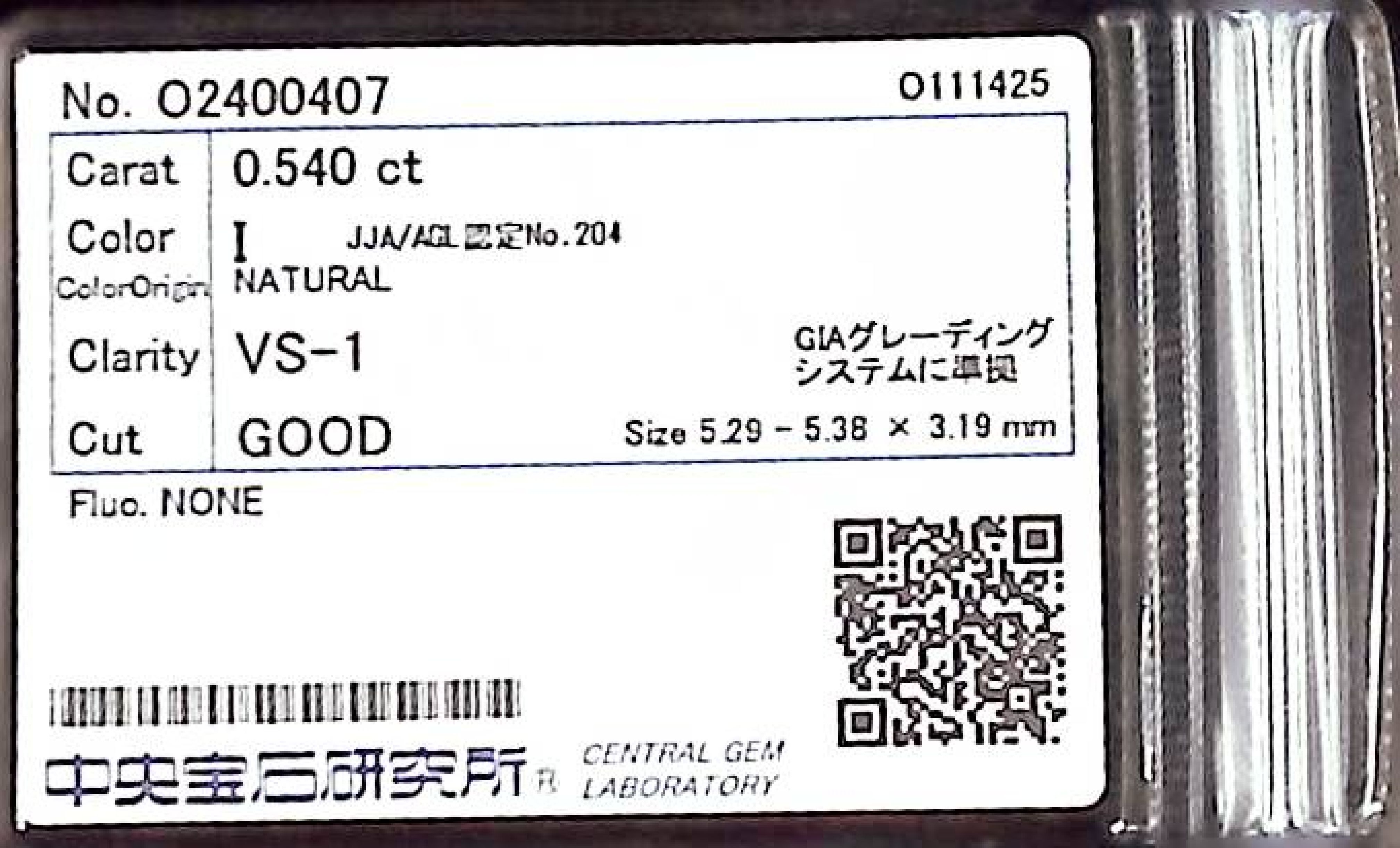 (10980_0446)0.540ct I VS-1 GOOD/GD/GD NONE NATURAL 5.29-5.38X3.19mm ダイヤ・ルース