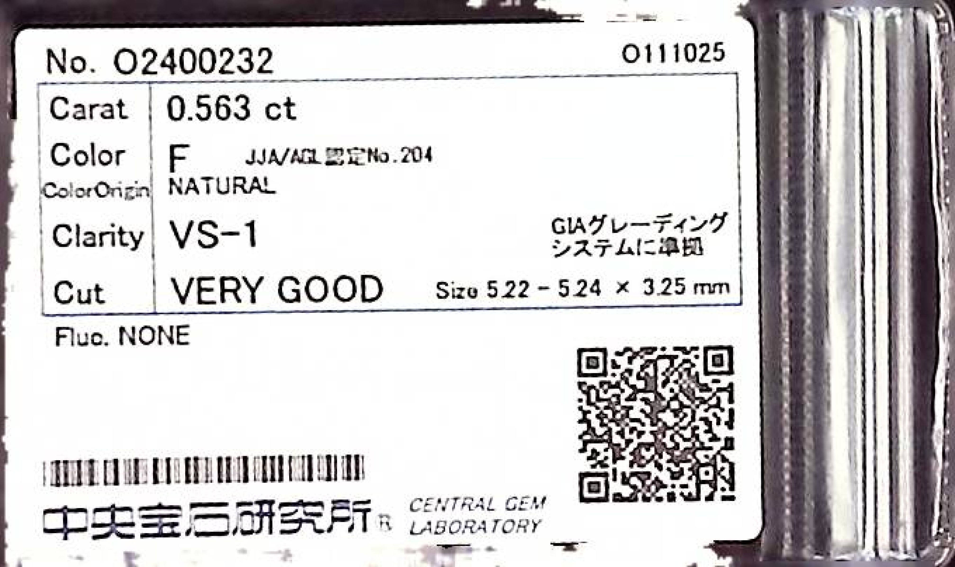 (10980_0457)0.563ct F VS-1 VERY GOOD/VG/GD NONE NATURAL 5.22-5.24X3.25mm ダイヤ・ルース
