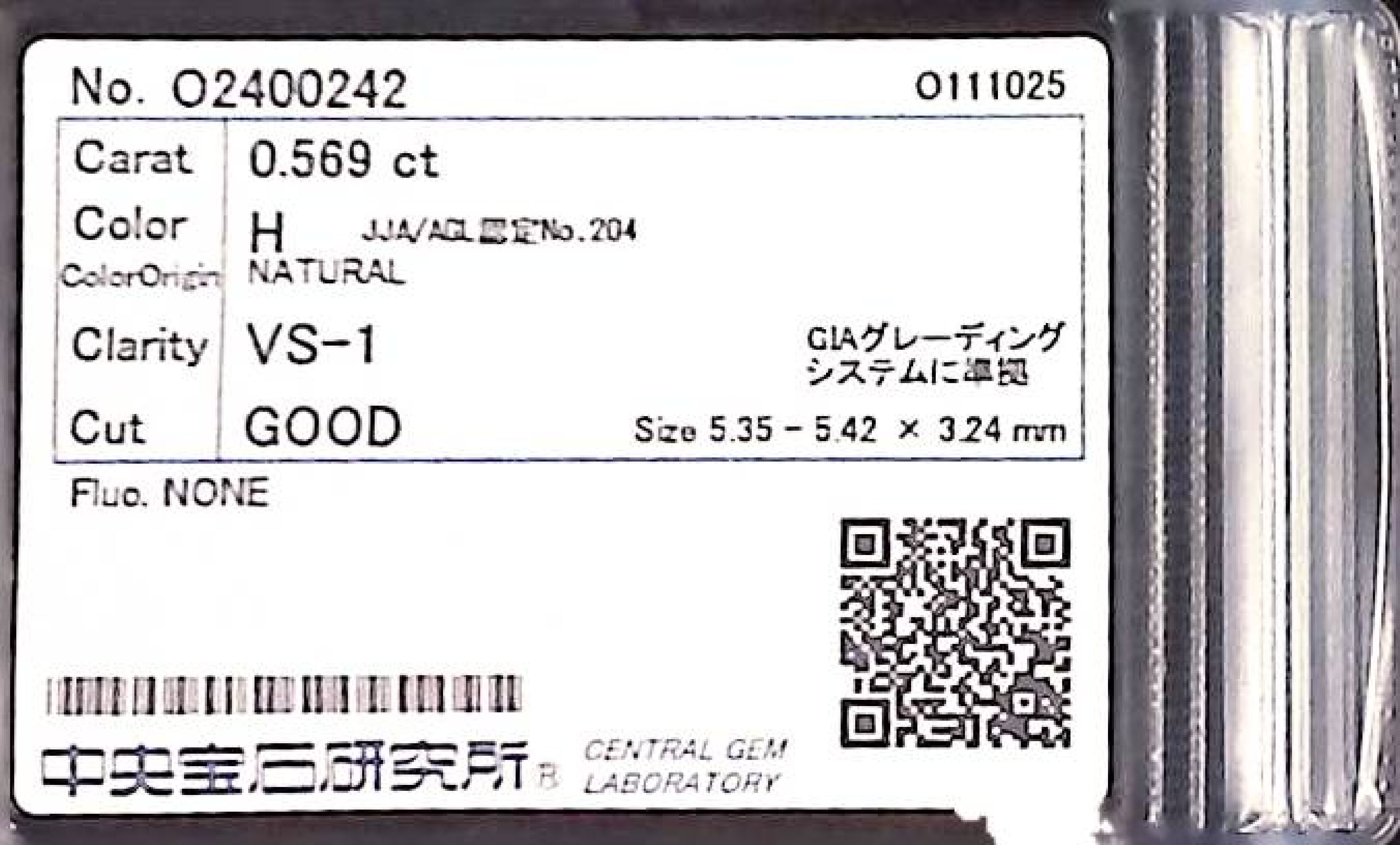 (10980_0460)0.569ct H VS-1 GOOD/VG/GD NONE NATURAL 5.35-5.42X3.24mm ダイヤ・ルース