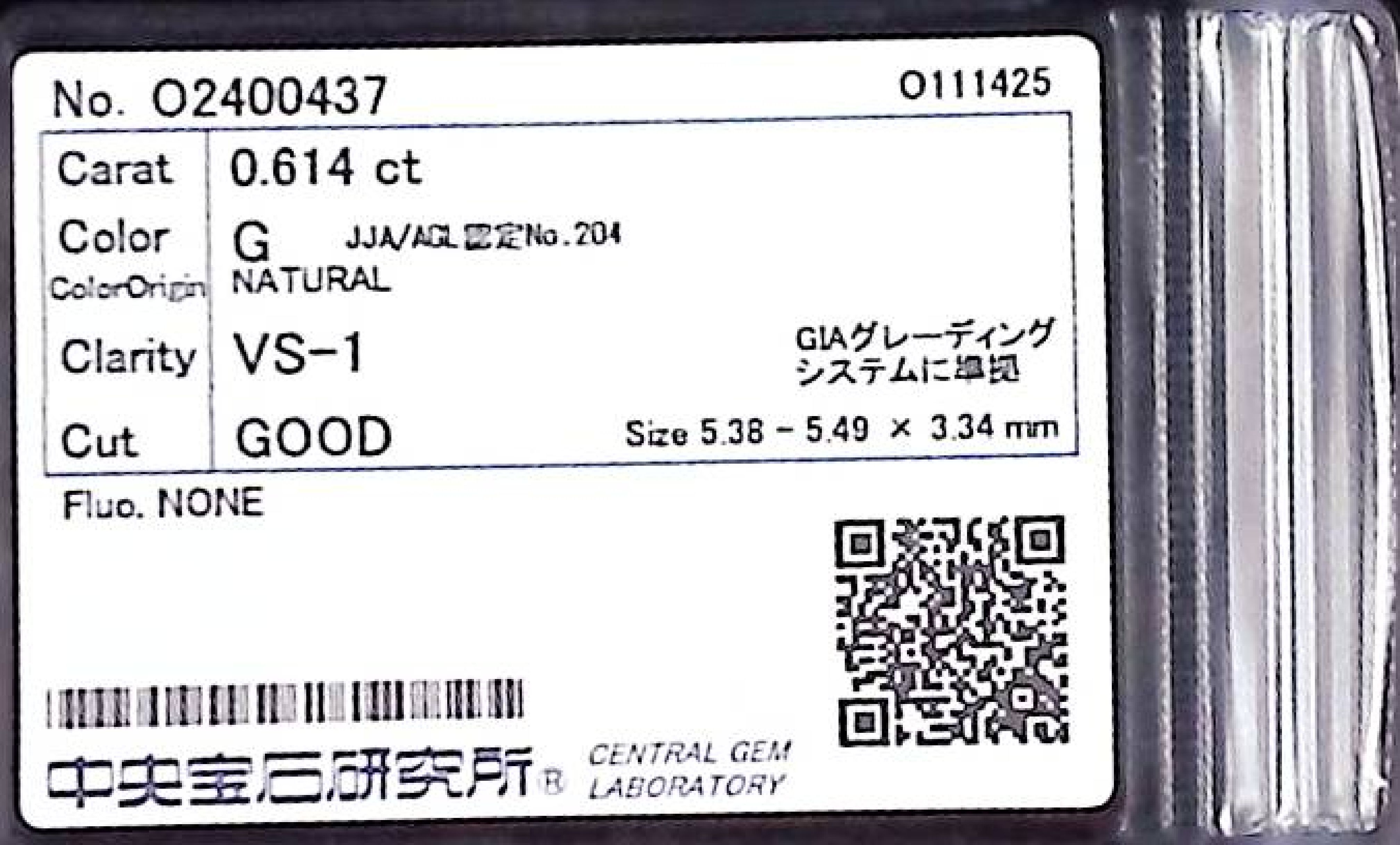 (10980_0475)0.614ct G VS-1 GOOD/GD/GD NONE NATURAL 5.38-5.49X3.34mm ダイヤ・ルース