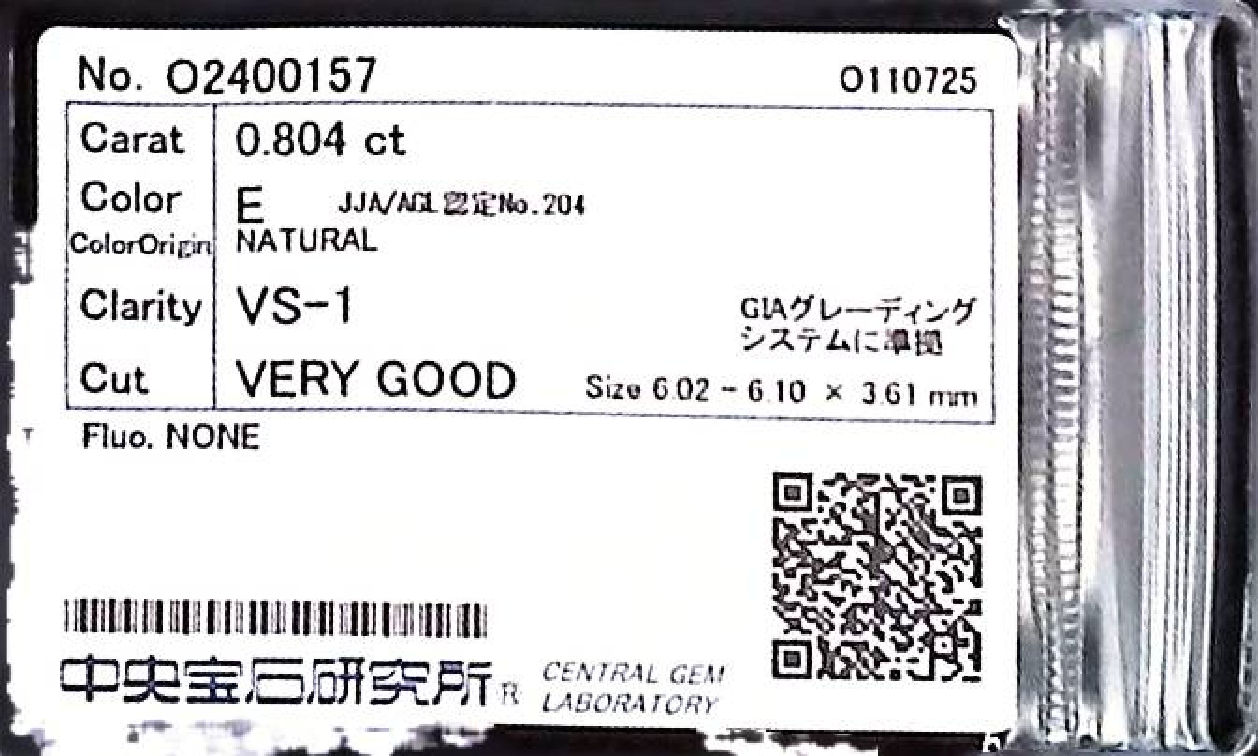 (10980_0520)0.804ct E VS-1 VERY GOOD/VG/GD NONE NATURAL 6.02-6.10X3.61mm ダイヤ・ルース