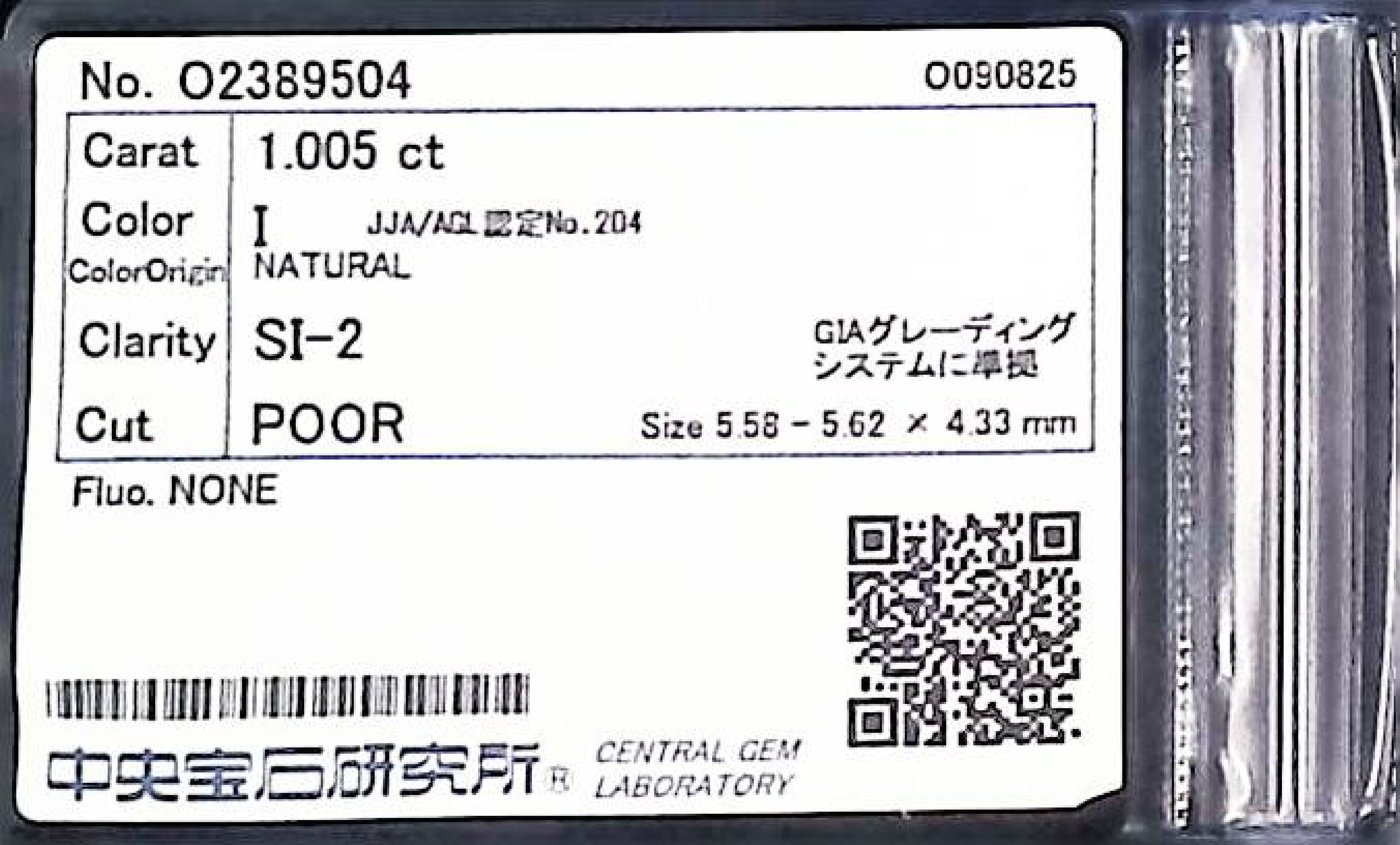 (10980_0536)1.005ct I SI-2 POOR/GD/FR NONE NATURAL 5.58-5.62X4.33mm ダイヤ・ルース