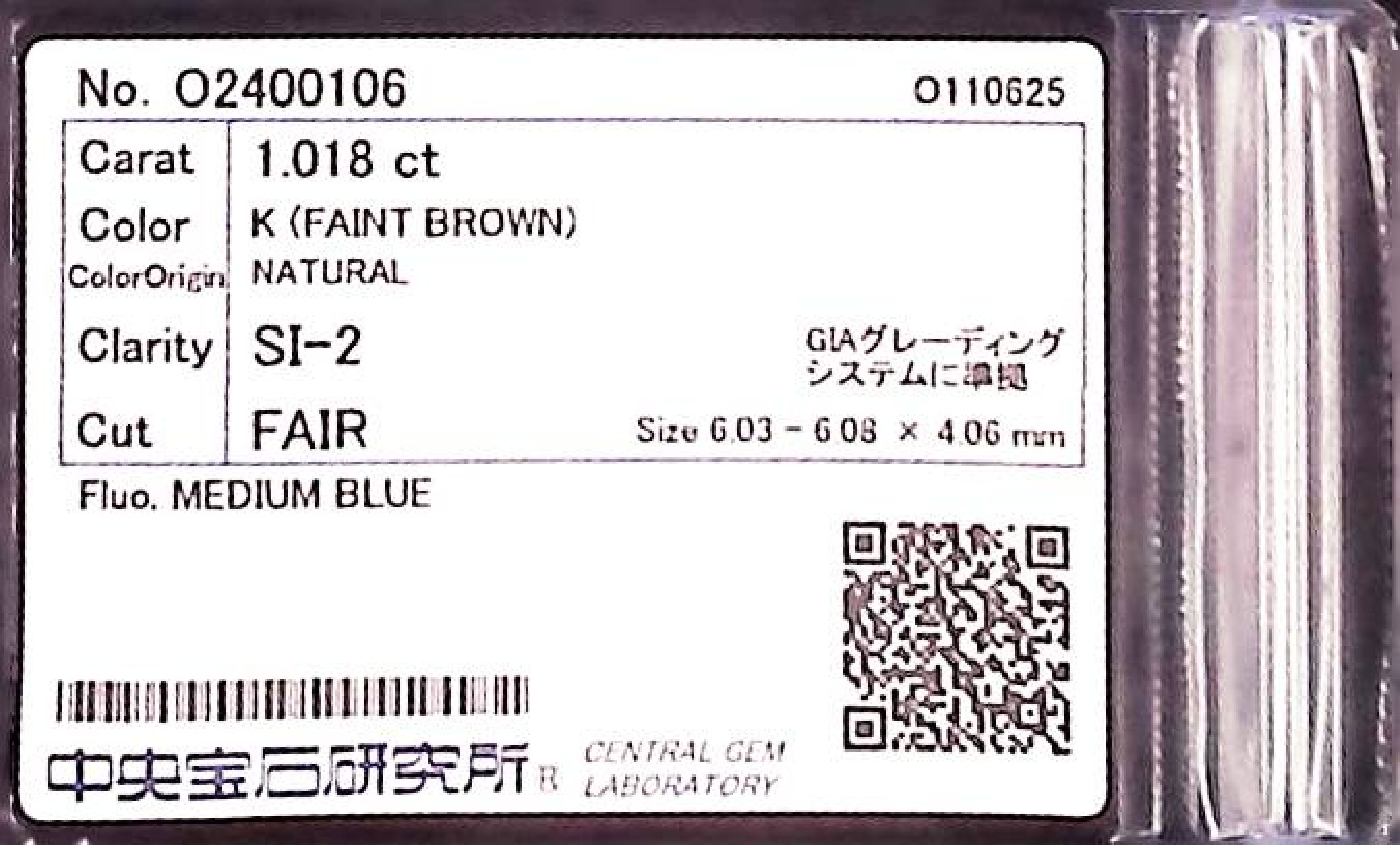 (10980_0547)1.018ct K )FAINT BROWN SI-2 FAIR/GD/FR MEDIUM BLUE NATURAL 6.03-6.08X4.06mm ダイヤ・ルース