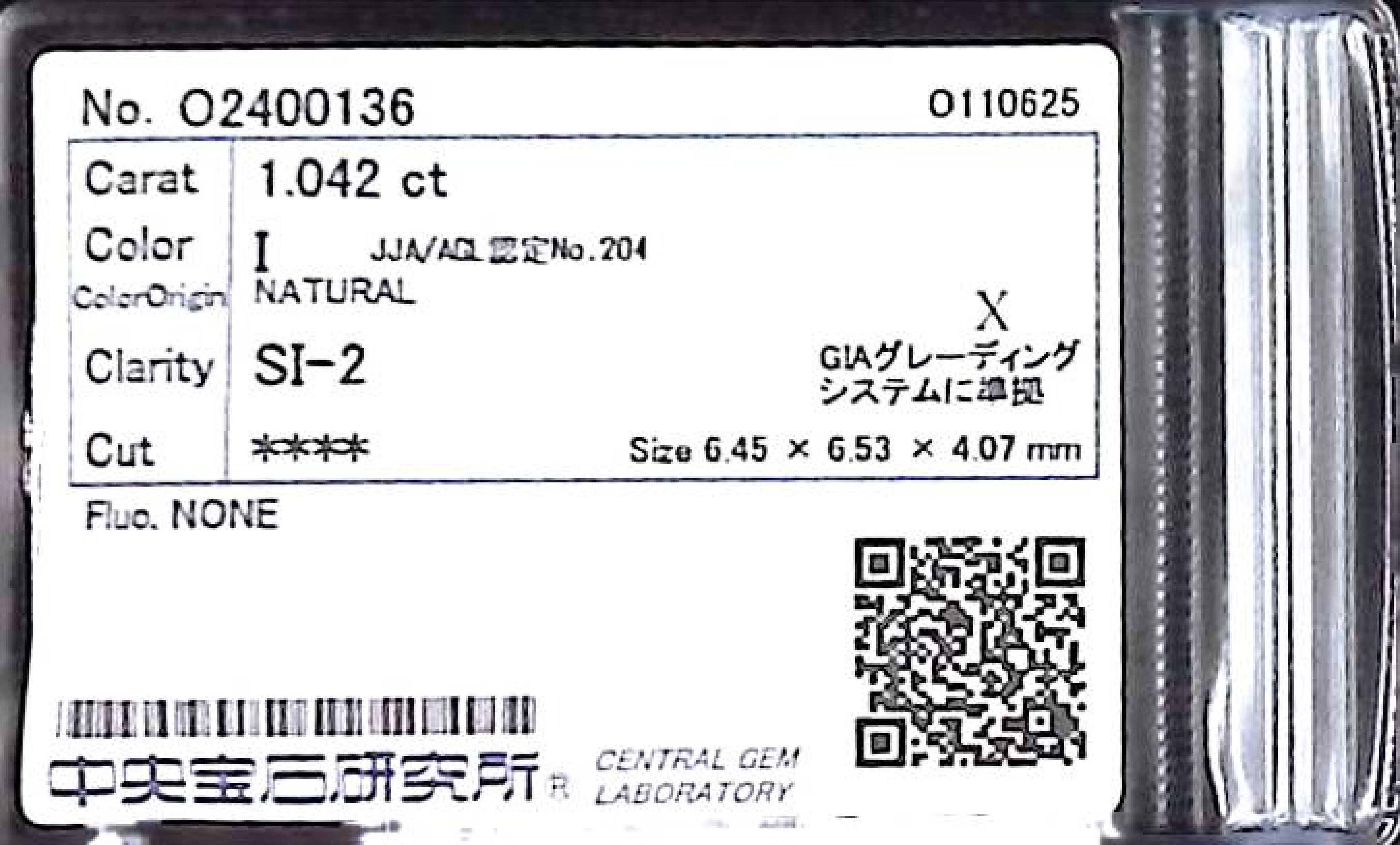 (10980_0566)1.042ct I SI-2 ****/FR/GD NONE NATURAL 6.45-6.53X4.07mm X ダイヤ・ルース