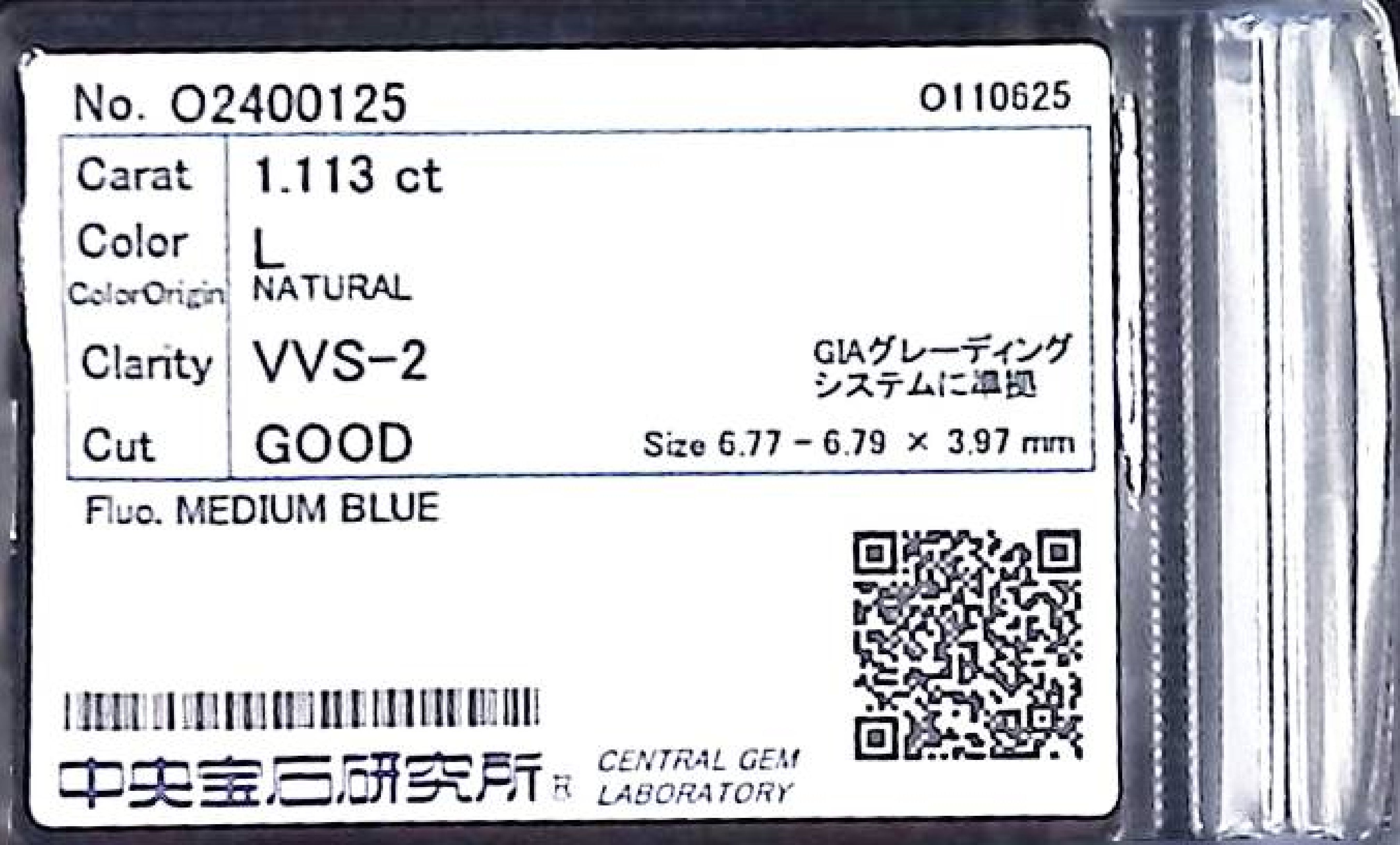 (10980_0582)1.113ct L VVS-2 GOOD/VG/GD MEDIUM BLUE NATURAL 6.77-6.79X3.97mm ダイヤ・ルース