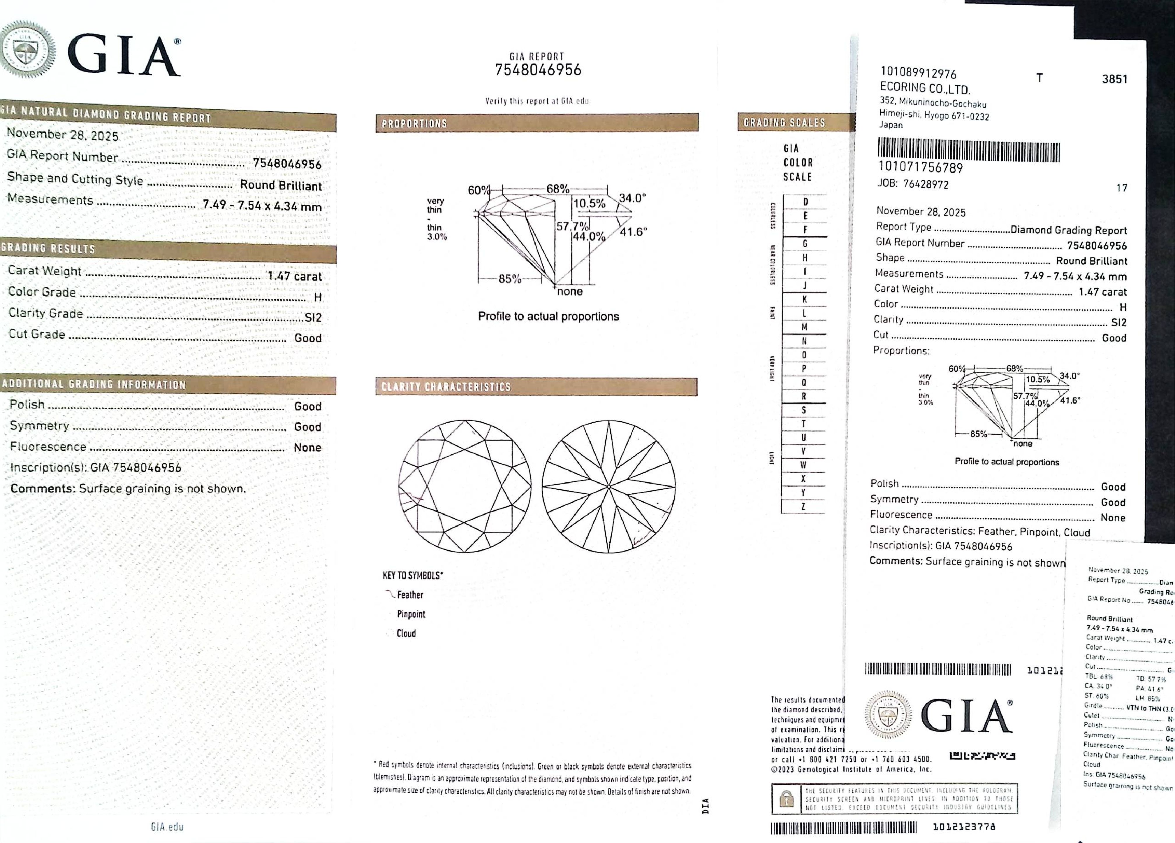 (10980_0596)1.47ct H SI-2 Good/GD/GD None NATURAL 7.49-7.54X4.34mm GIA ダイヤ・ルース