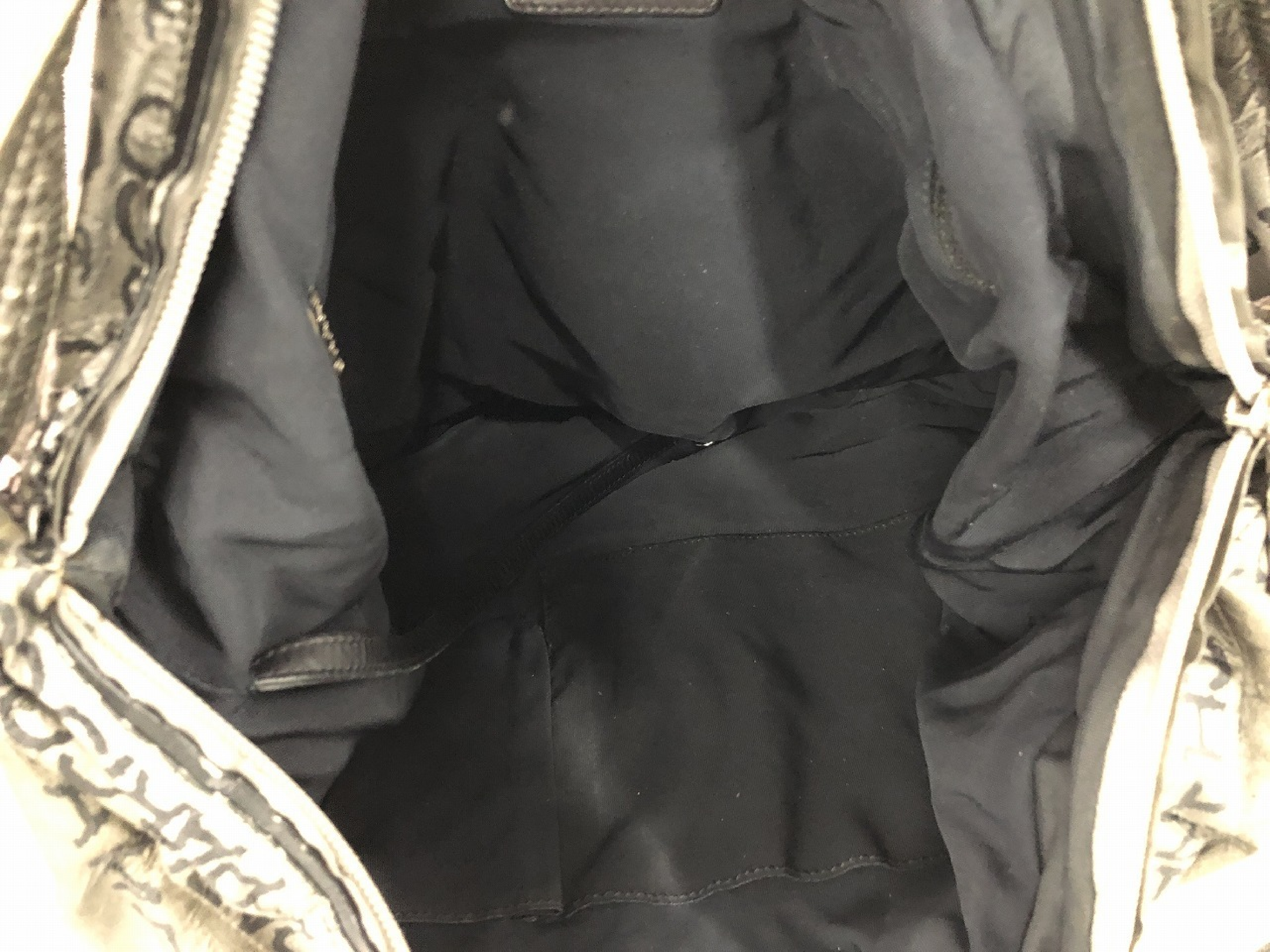 全体ヤケ擦れ汚れ変色(中) 浮きシワ(大) べたつき感有 間口レザー剥がれ(中) 持ち手ヤケ汚れ変色(中) べたつき感有 内側ポケット色汚れ(中) ラメ付着有 【シール有