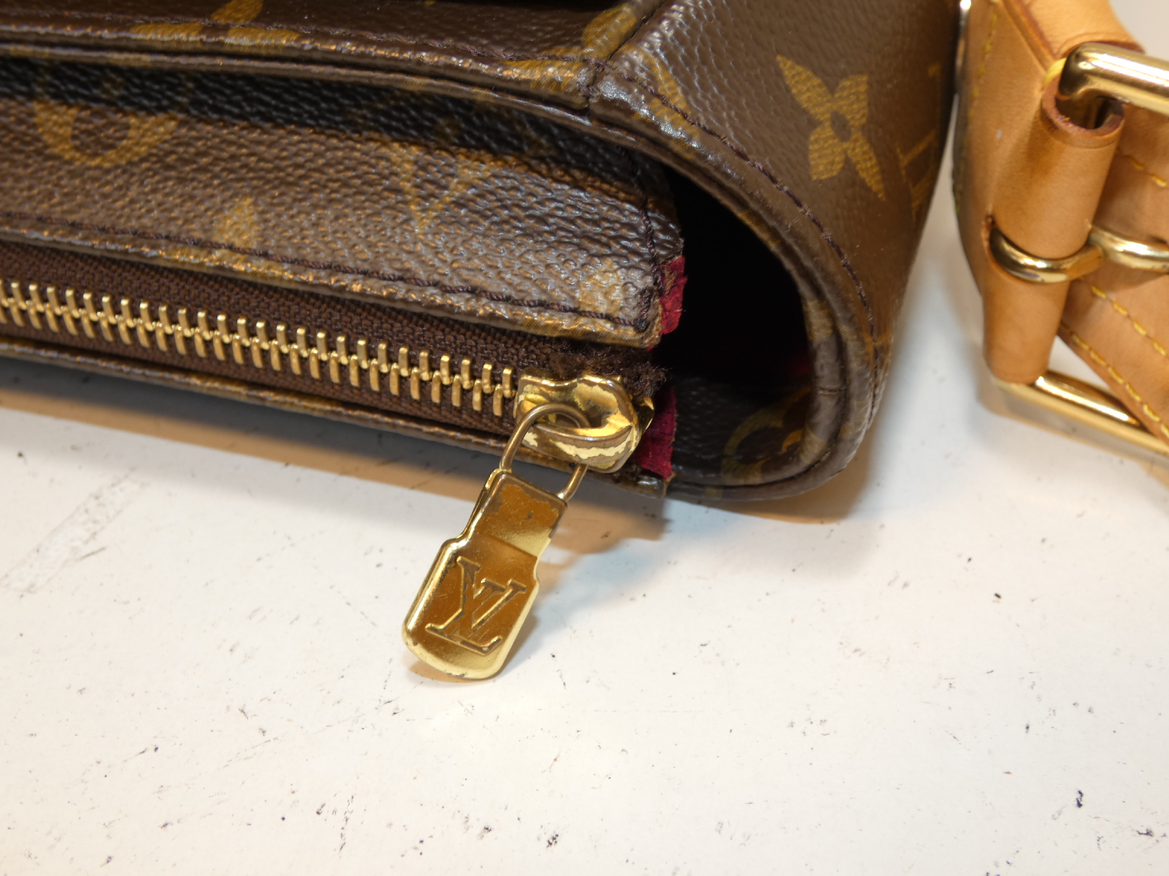 ファスナーレーン破れ有 ヌメ革ヤケシミ(中) 角縁擦れ(中) 金具擦れ剥げ(中) ショルダーヒビ切れ(中) 付け根コバヒビ割れ(中) 内側擦れ汚れシミ(中) におい(中) 外ポケットフラップ内側擦れ押し跡(中) 擦れ汚れ(中) 【シリアル
