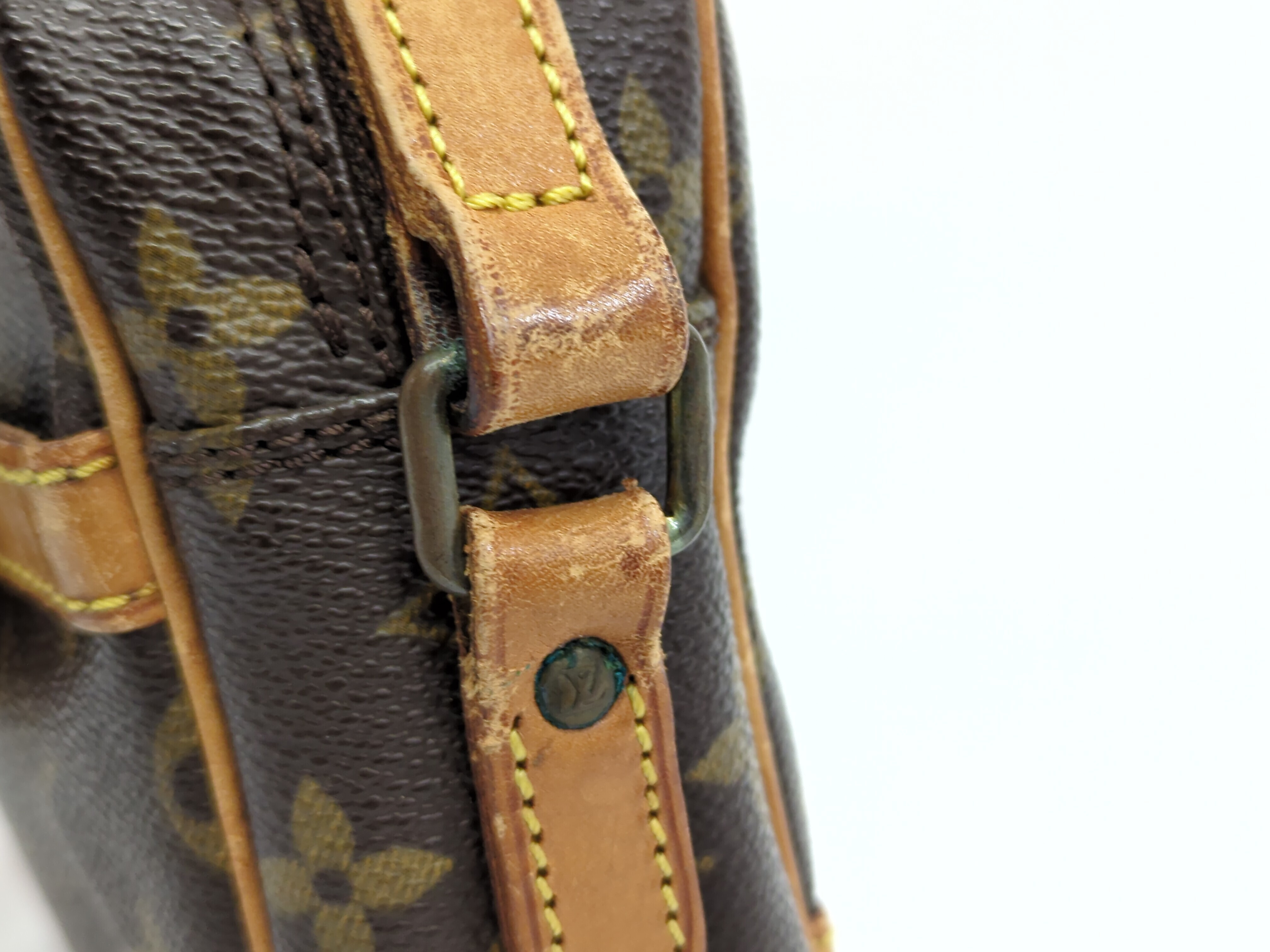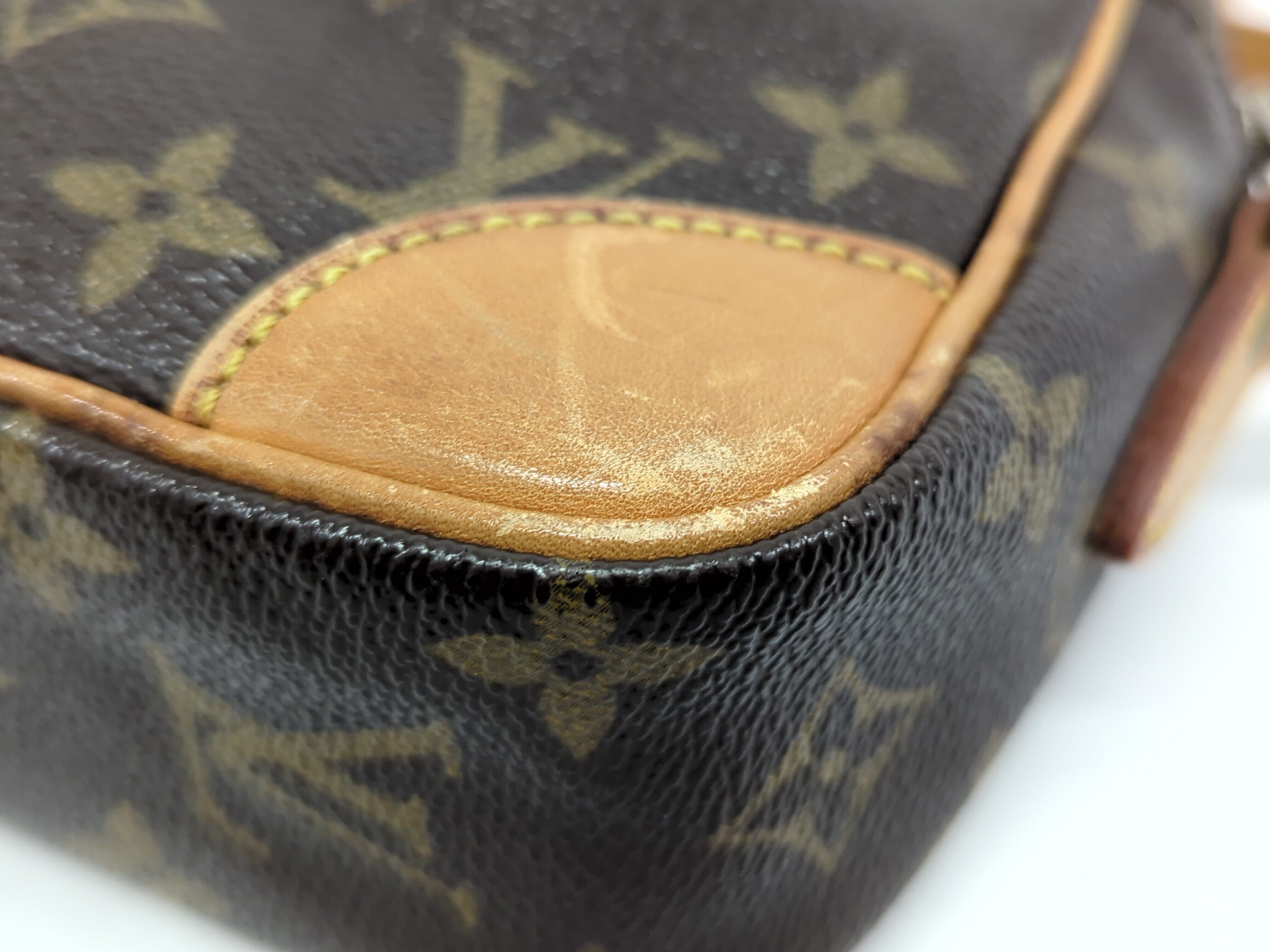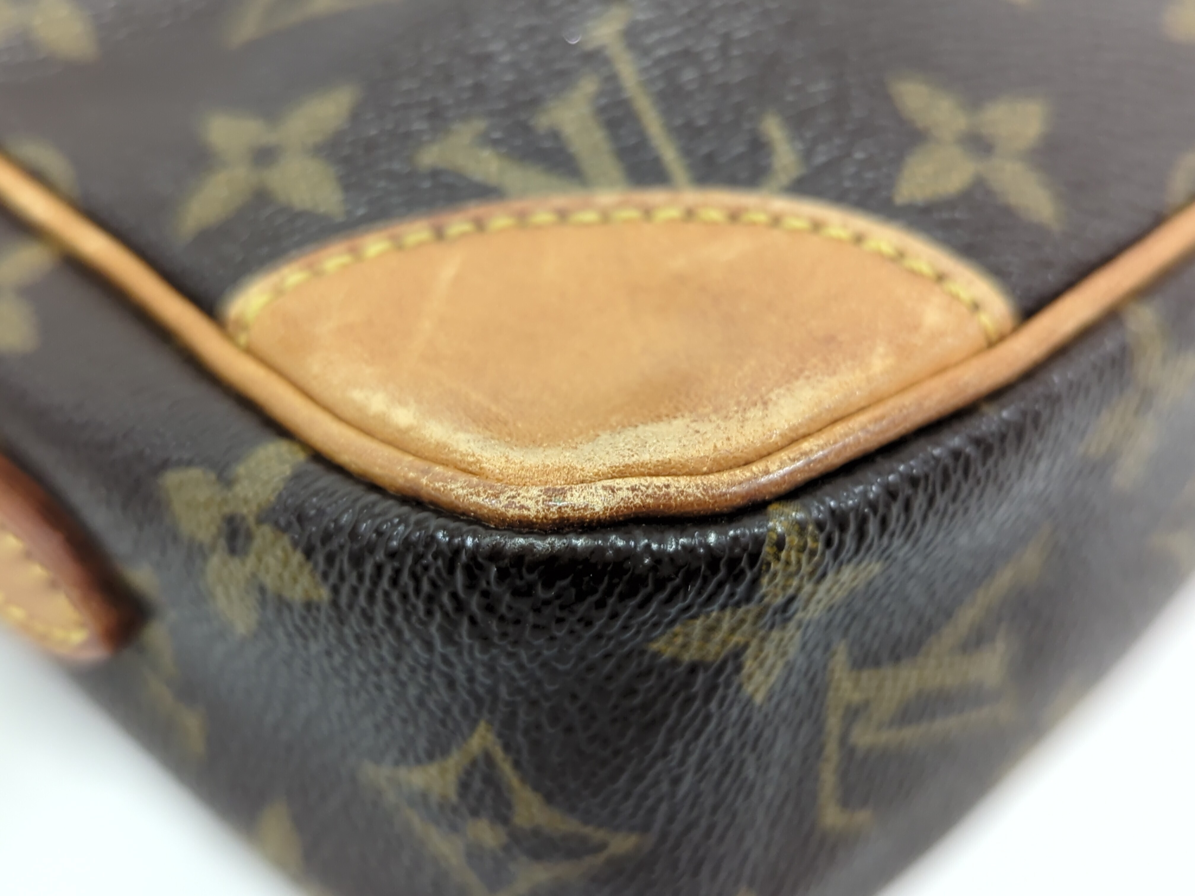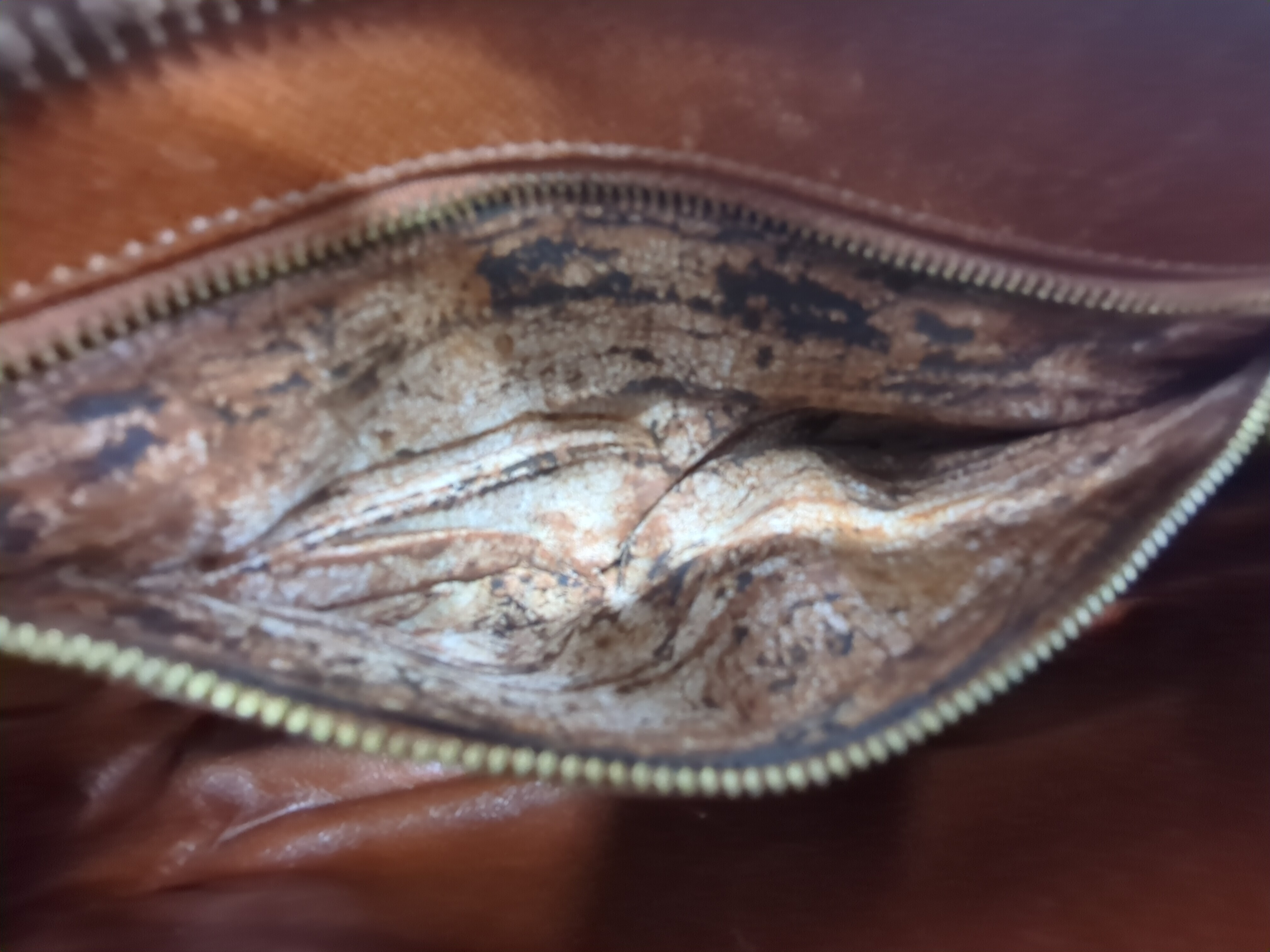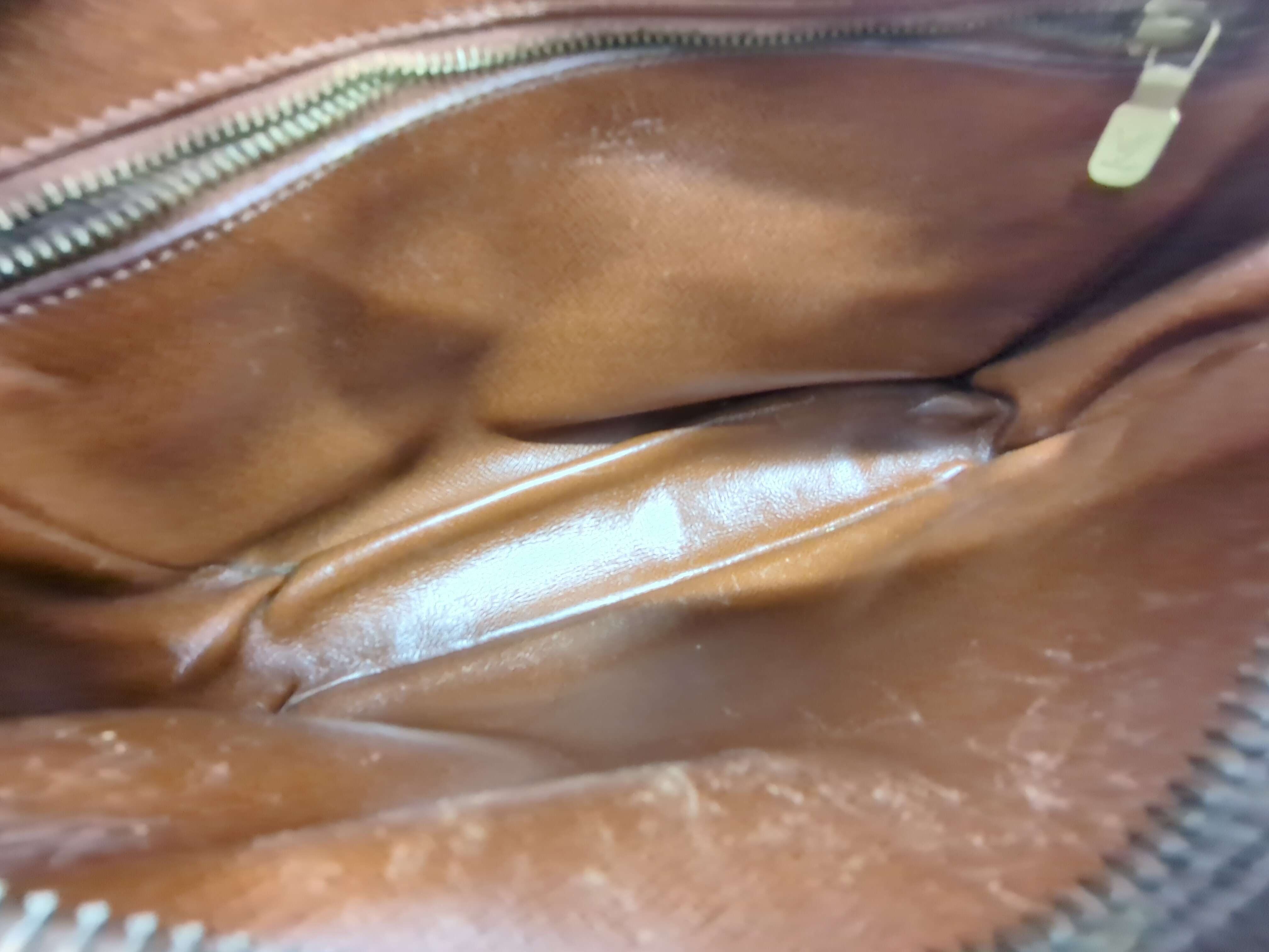 全体ヤケ擦れ(中) 角擦れ(中) 持ち手ヤケ擦れヒビ(中) 糸飛びあり付け根よれ(小) 金具剥げキズ(中) ファスナーレーン破れ(小) 内側汚れキズ(中) ポケット内側全体ベタ剥がれ 【シリアル