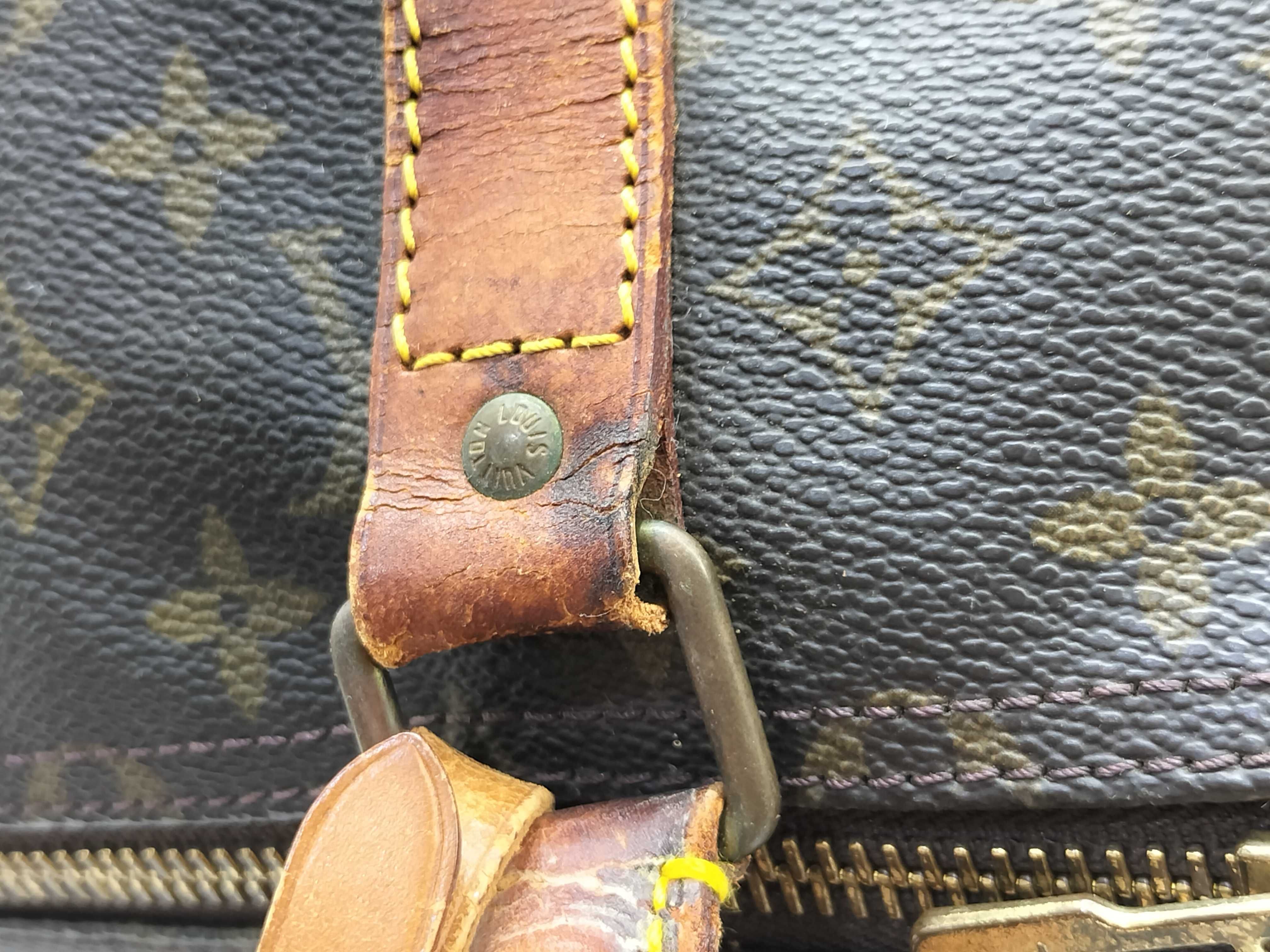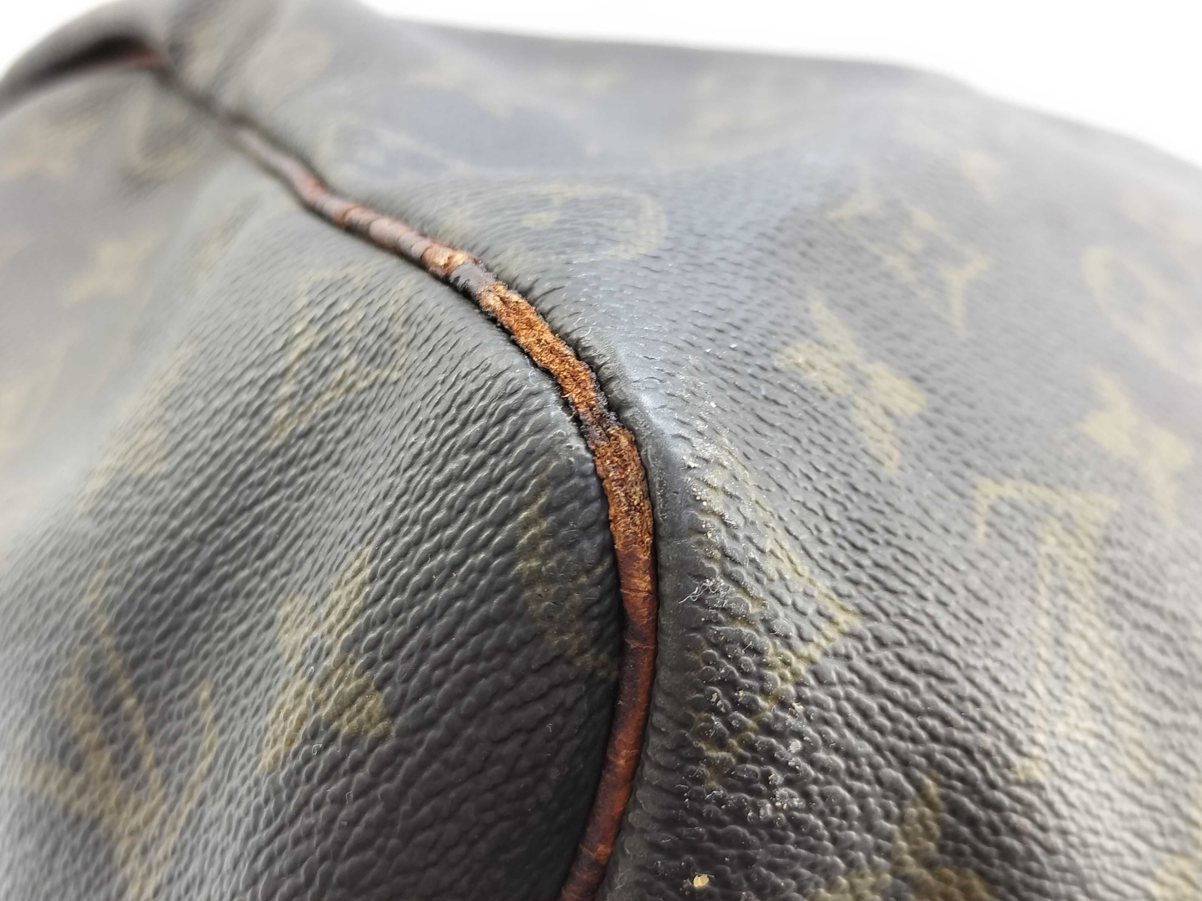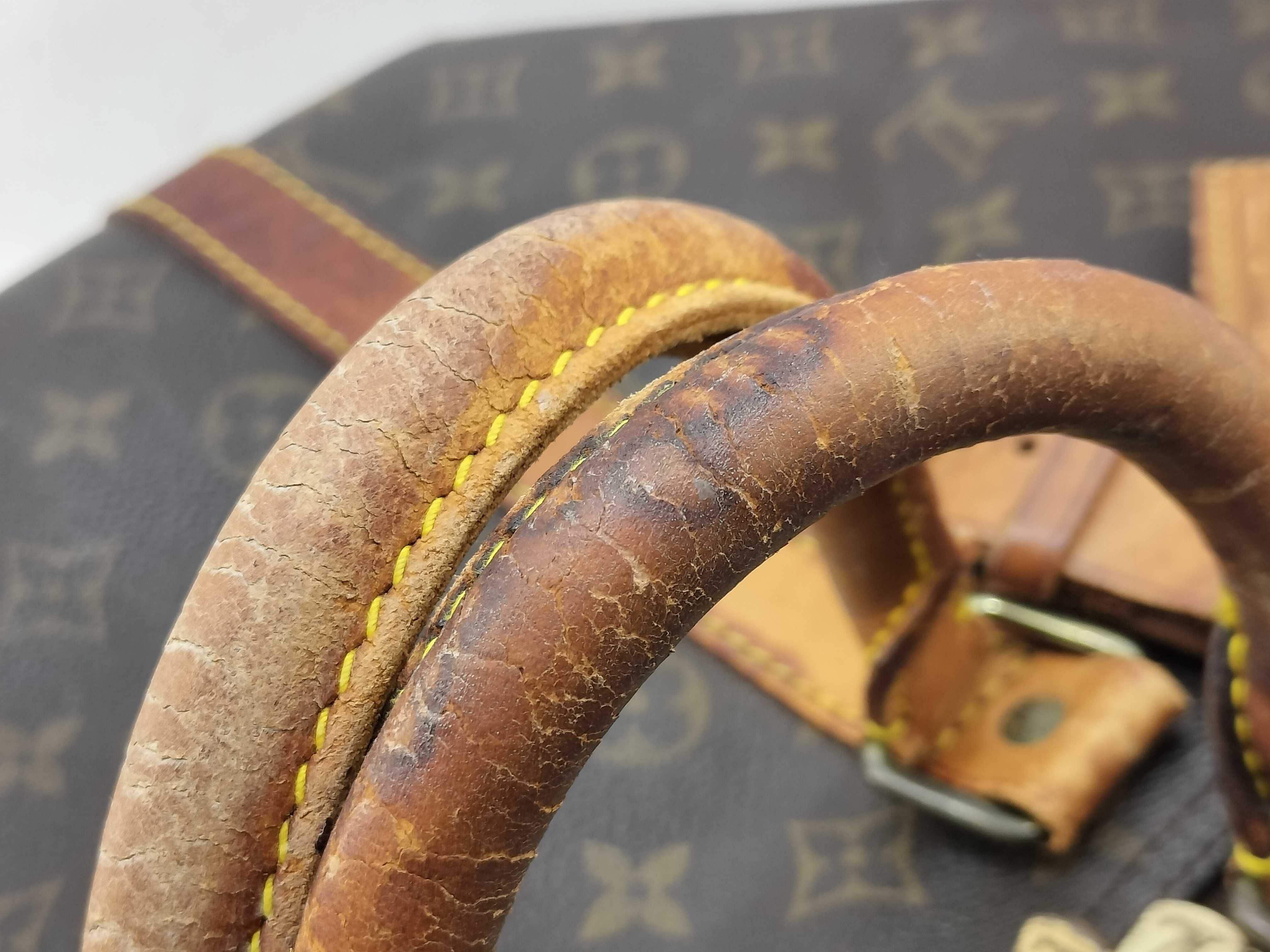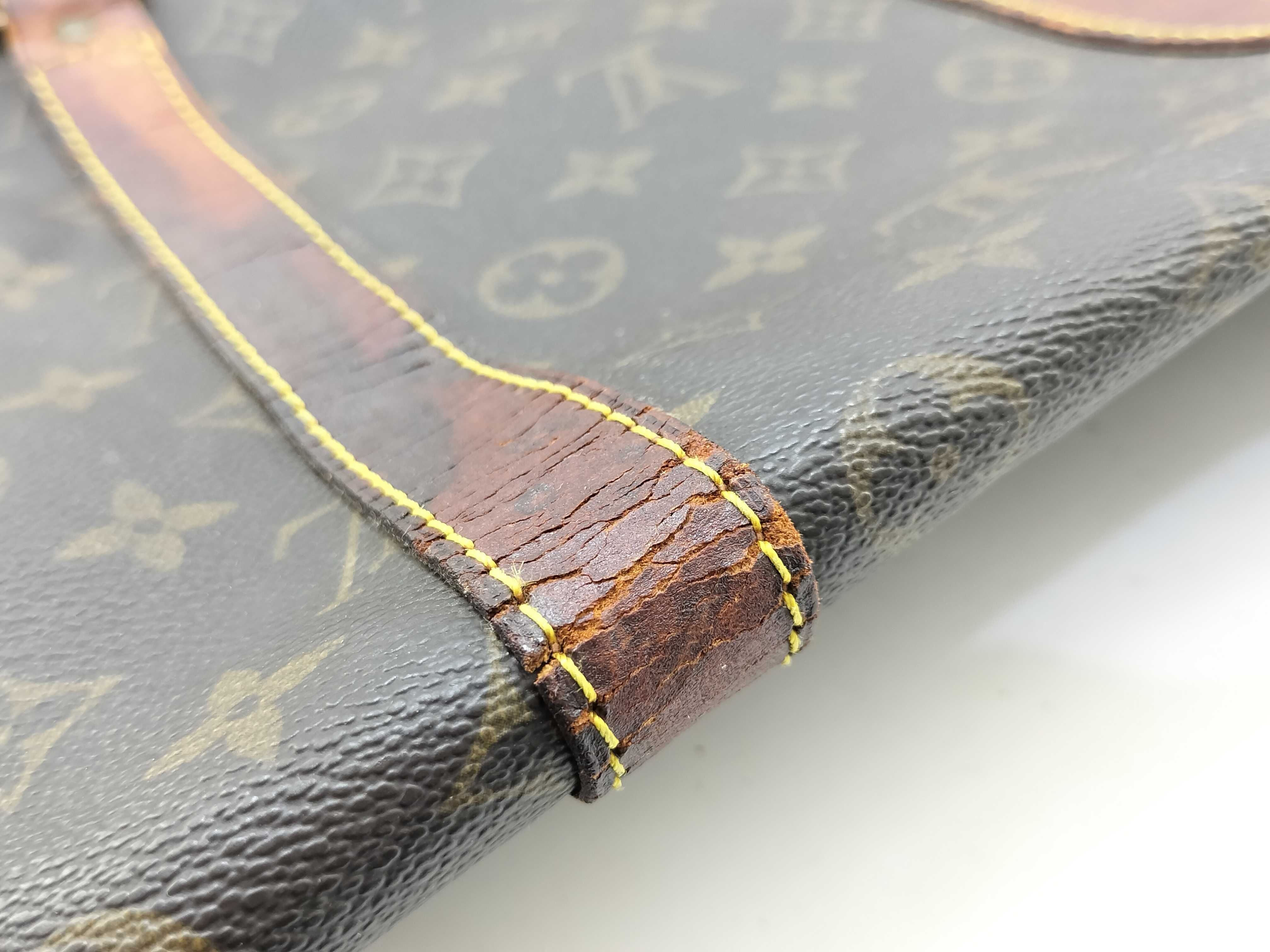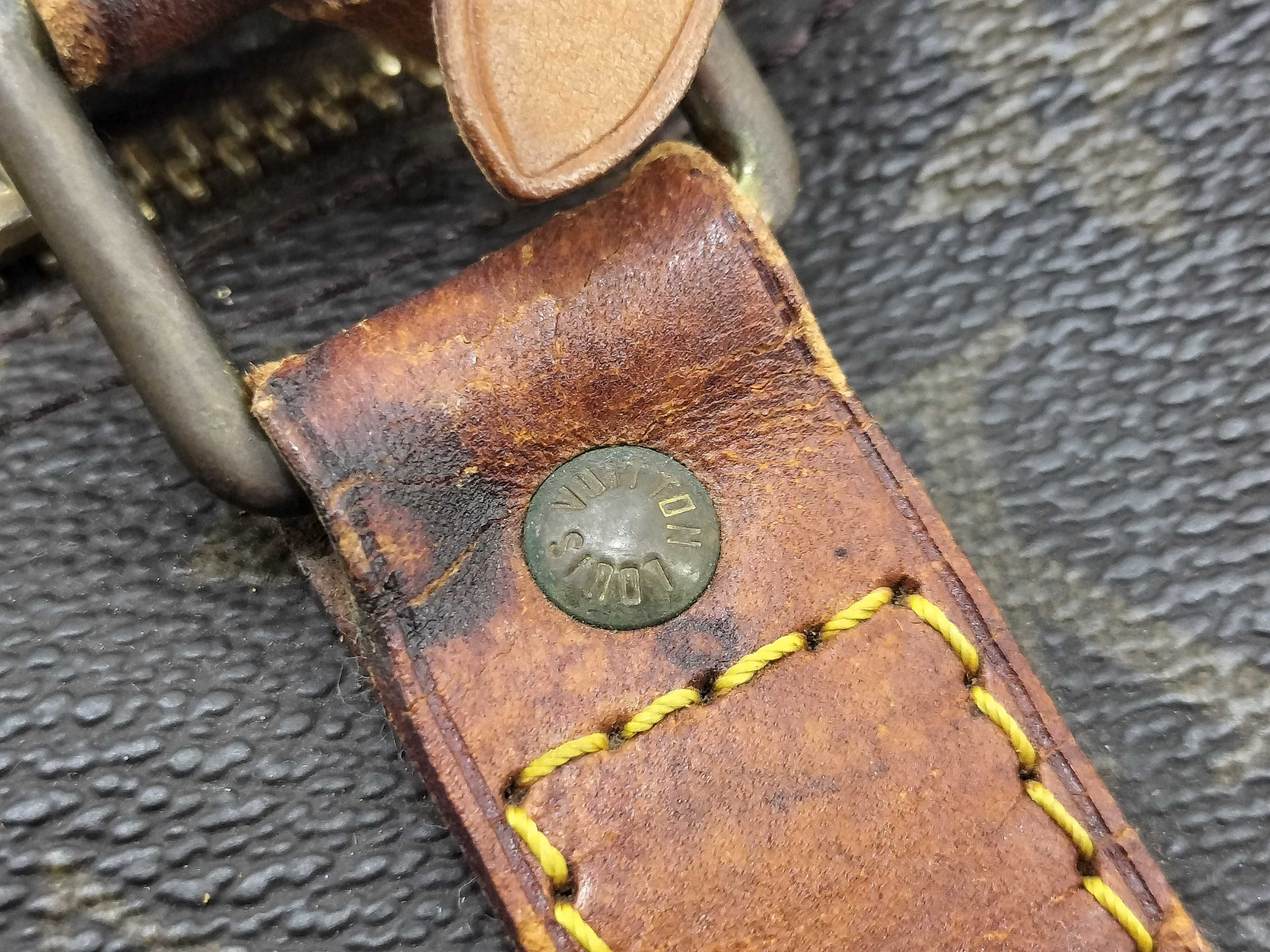 全体擦れ(中) 角擦れ(中) ヌメ革やけ汚れ(中) ヌメ革ヒビ(大) 持ち手・ショルダーひび(大) 付け根伸び切れ(中) 金具キズ(中) 内側汚れ(小) 折畳みシワ有 青錆(小) ヌメ革劣化ヒビ有 ショルダー金具破損有 モノグラム焼け変色有【付属品