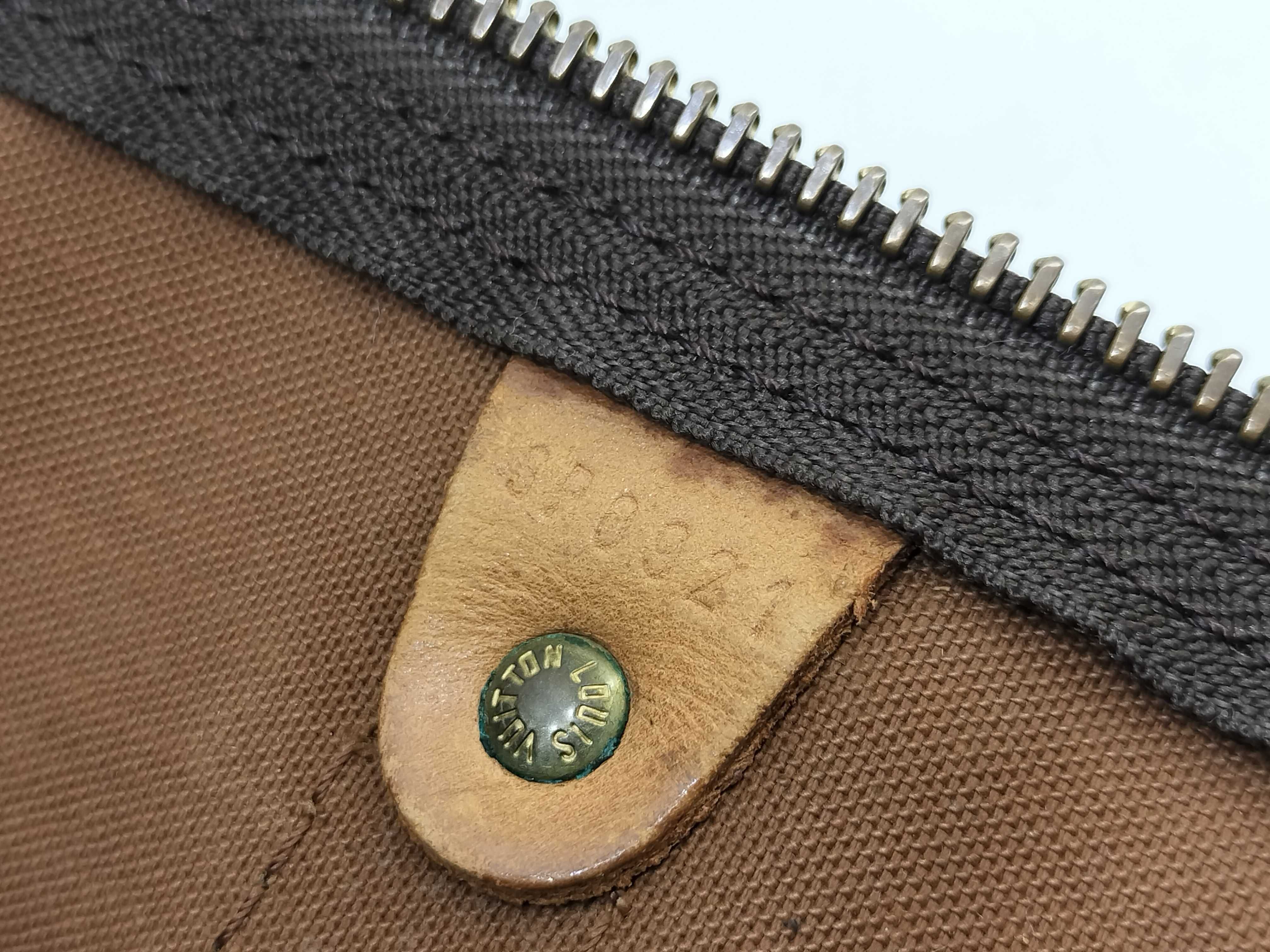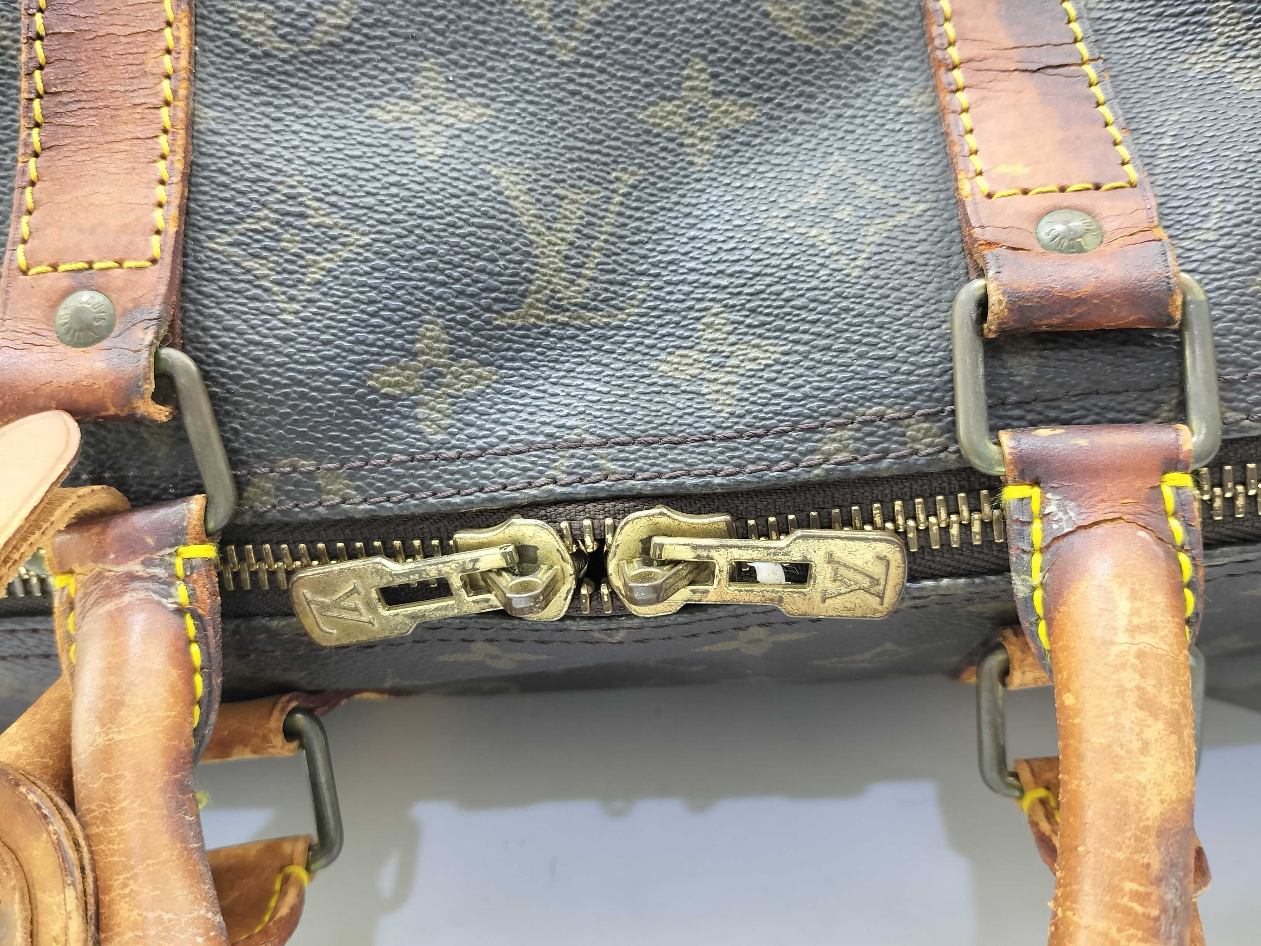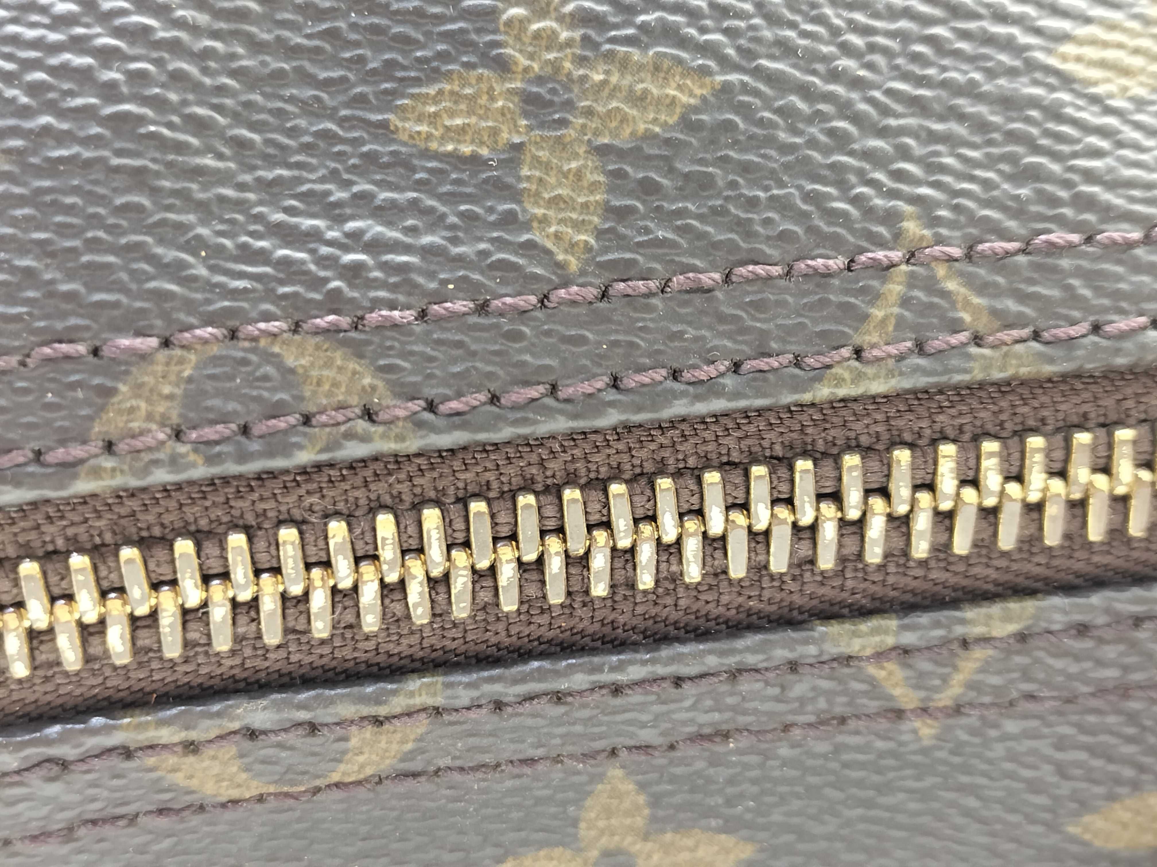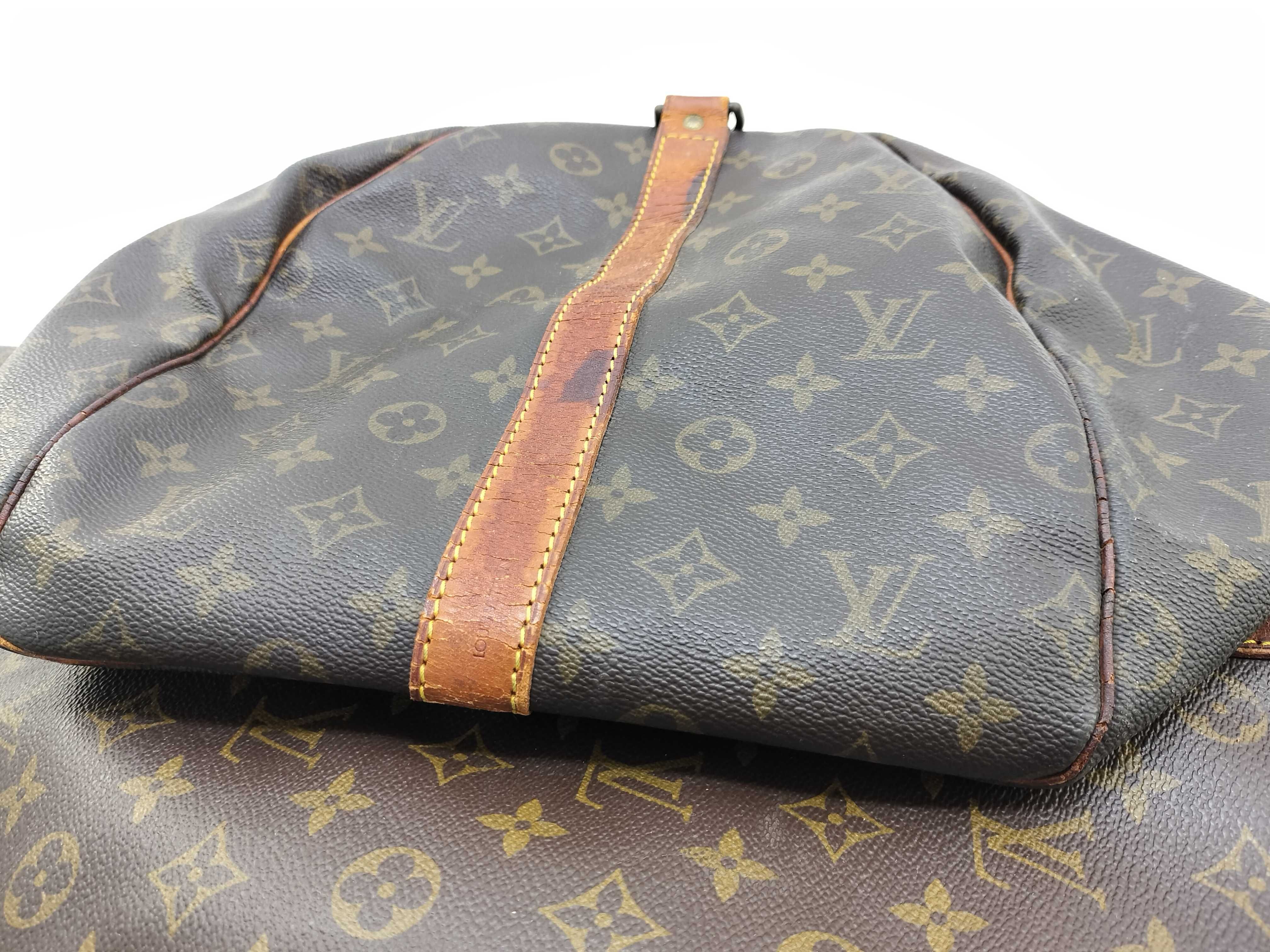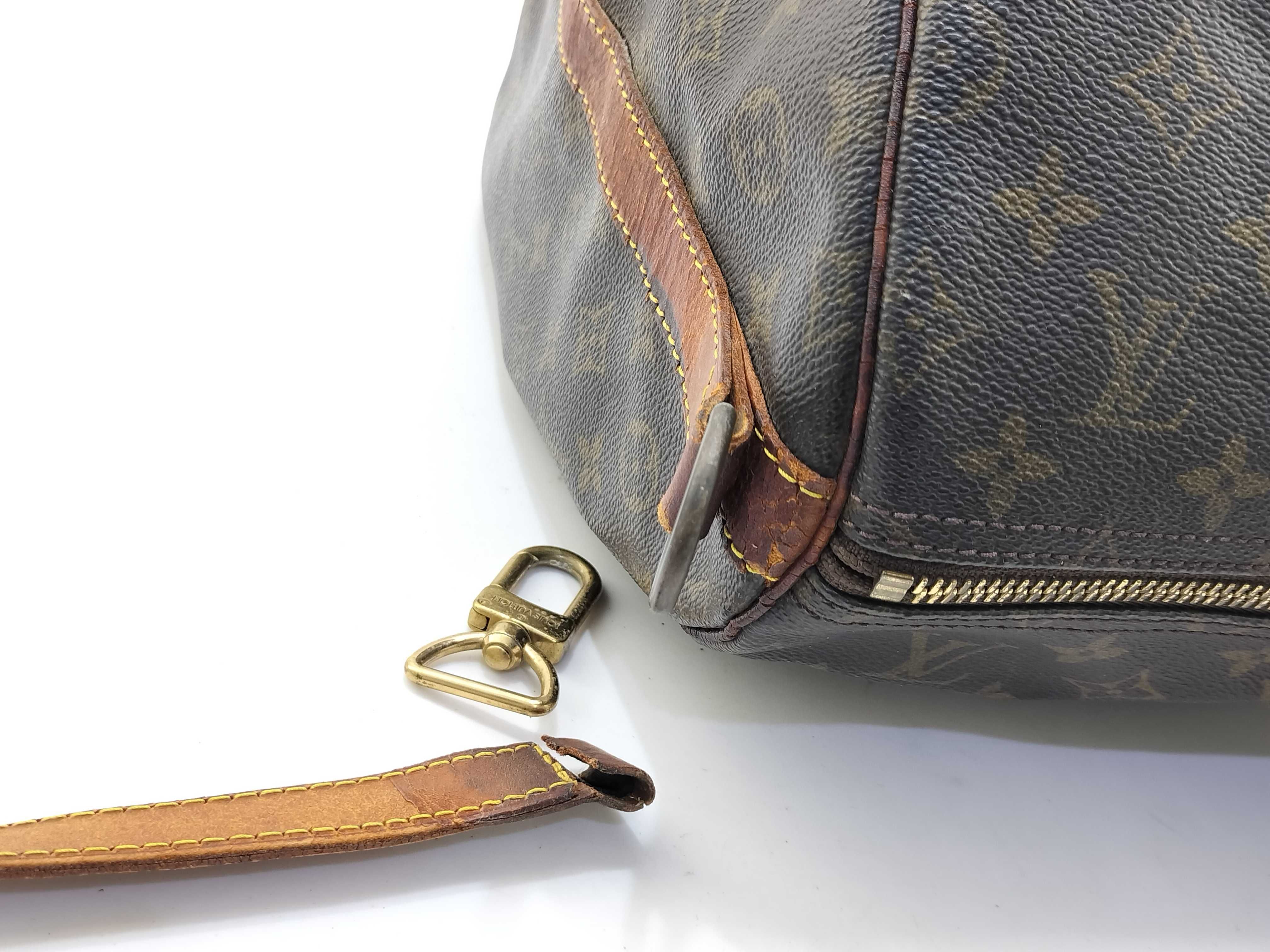 全体擦れ(中) 角擦れ(中) ヌメ革やけ汚れ(中) ヌメ革ヒビ(大) 持ち手・ショルダーひび(大) 付け根伸び切れ(中) 金具キズ(中) 内側汚れ(小) 折畳みシワ有 青錆(小) ヌメ革劣化ヒビ有 ショルダー金具破損有 モノグラム焼け変色有【付属品