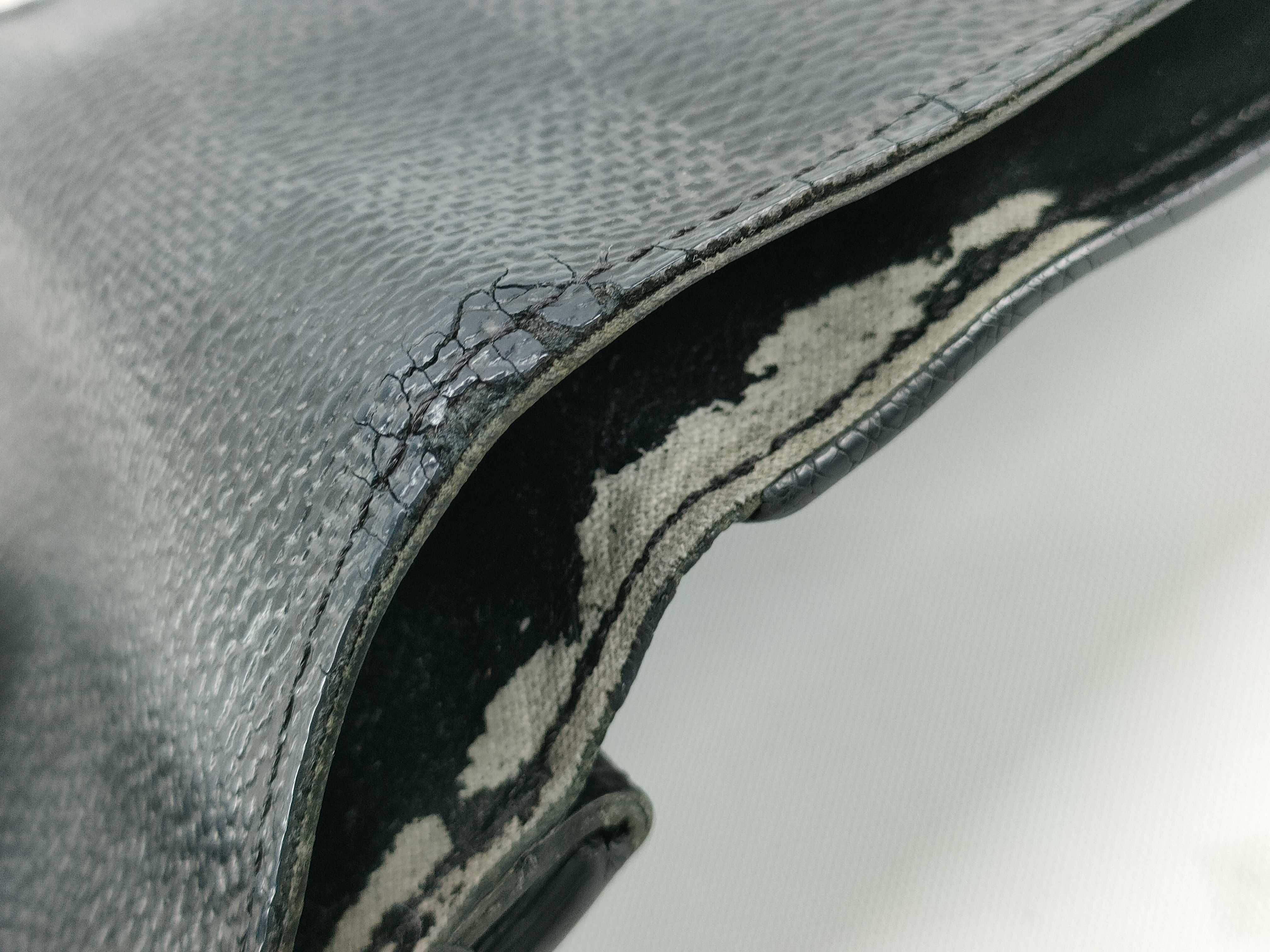 ポケット劣化剥がれ(有) 全体ヤケスレ(中) 型崩れ(小) 角スレヒビ破れ(大) 縁スレヒビ(中) 金具傷くすみ(小) 内側汚れ(中) 押し跡(小) ポケット縁切れ(中)【付属品