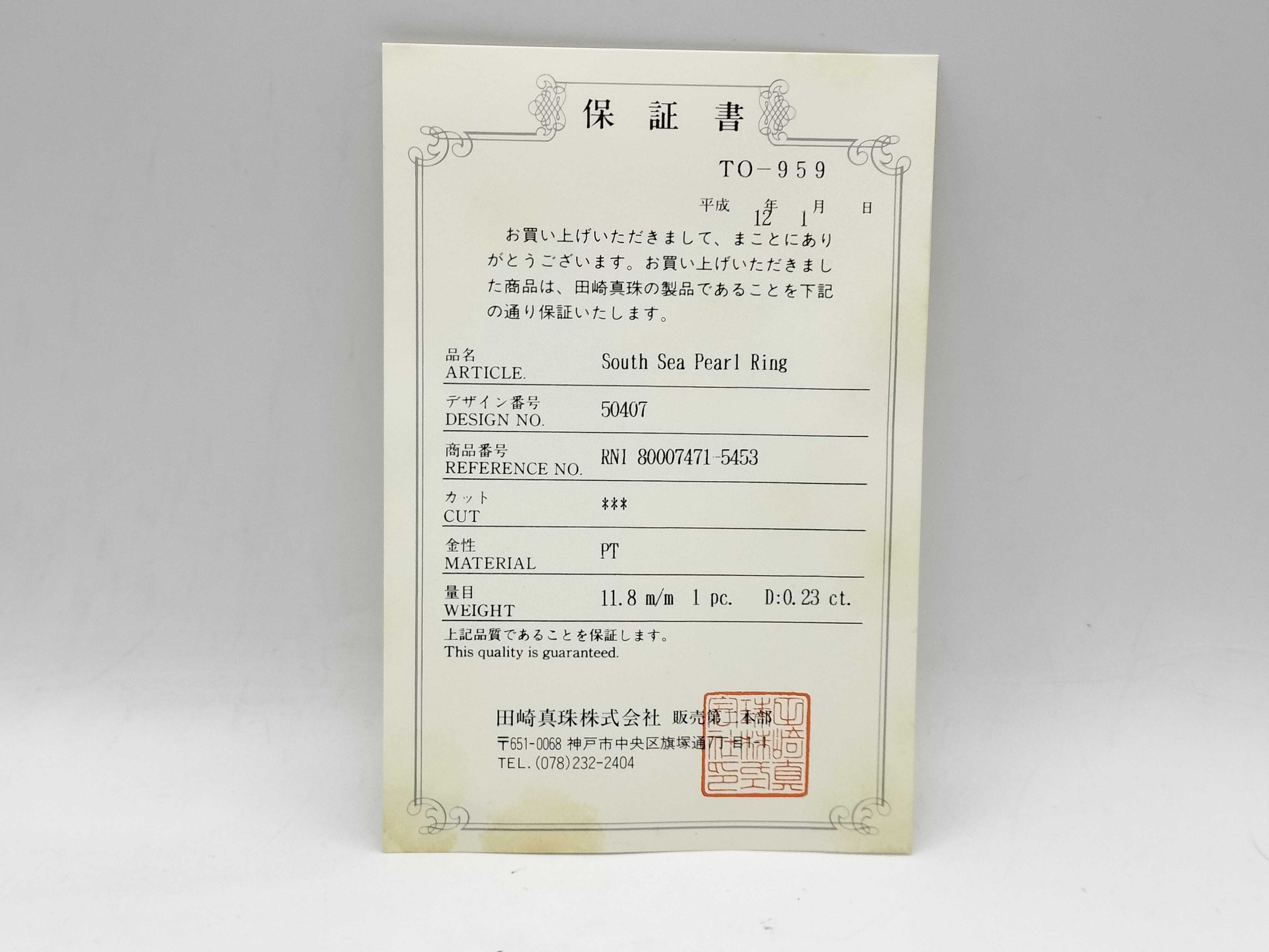 (N_0275)TASAKI 南洋パール 直径 約11.9mm D0.23ct Pt900 8.0g リング(貴金属)