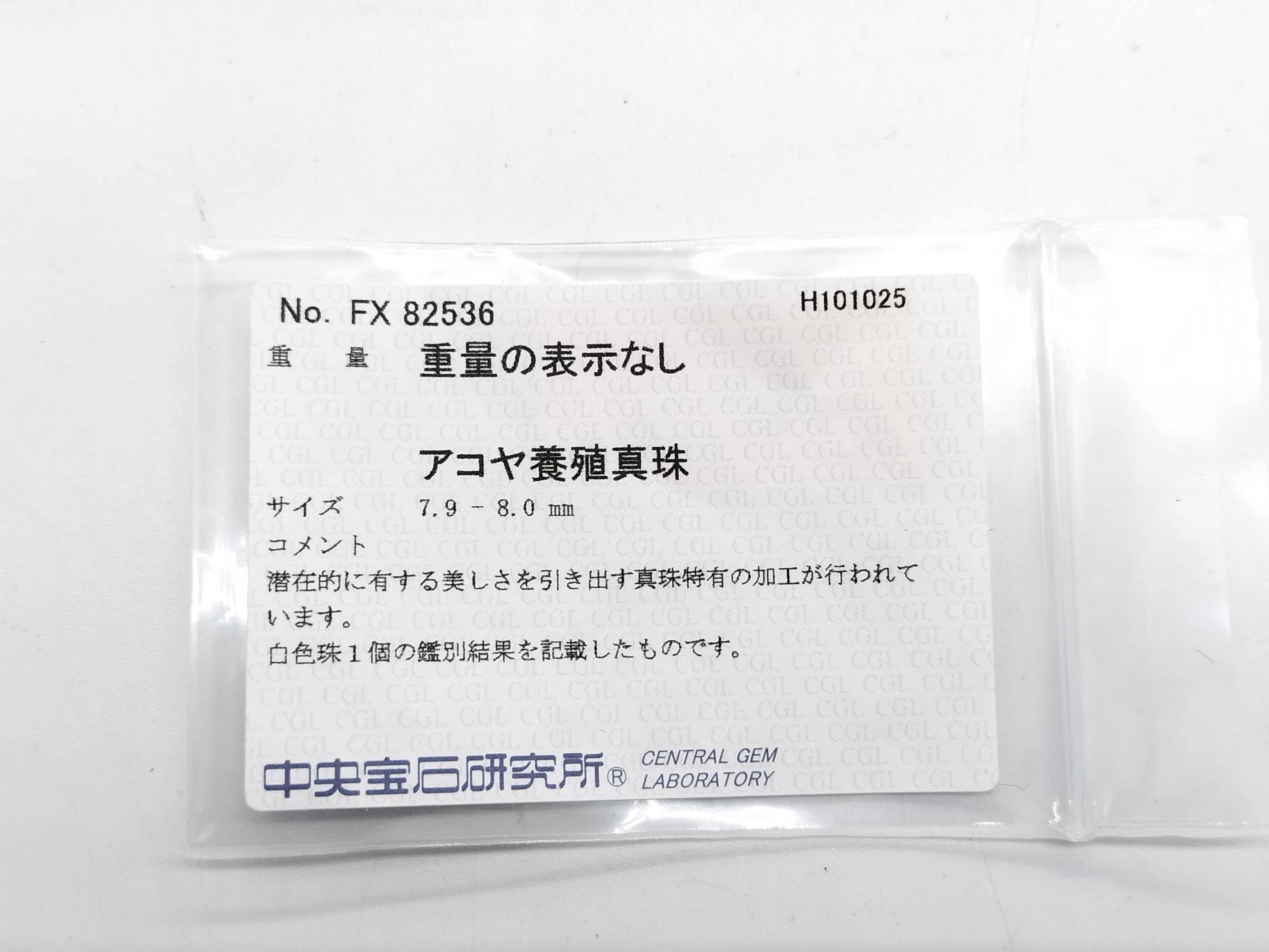 アコヤパール評価 AB (CGLソ/えくぼあり). ダイヤ評価 B (シングルカット). 留め具不良【付属品