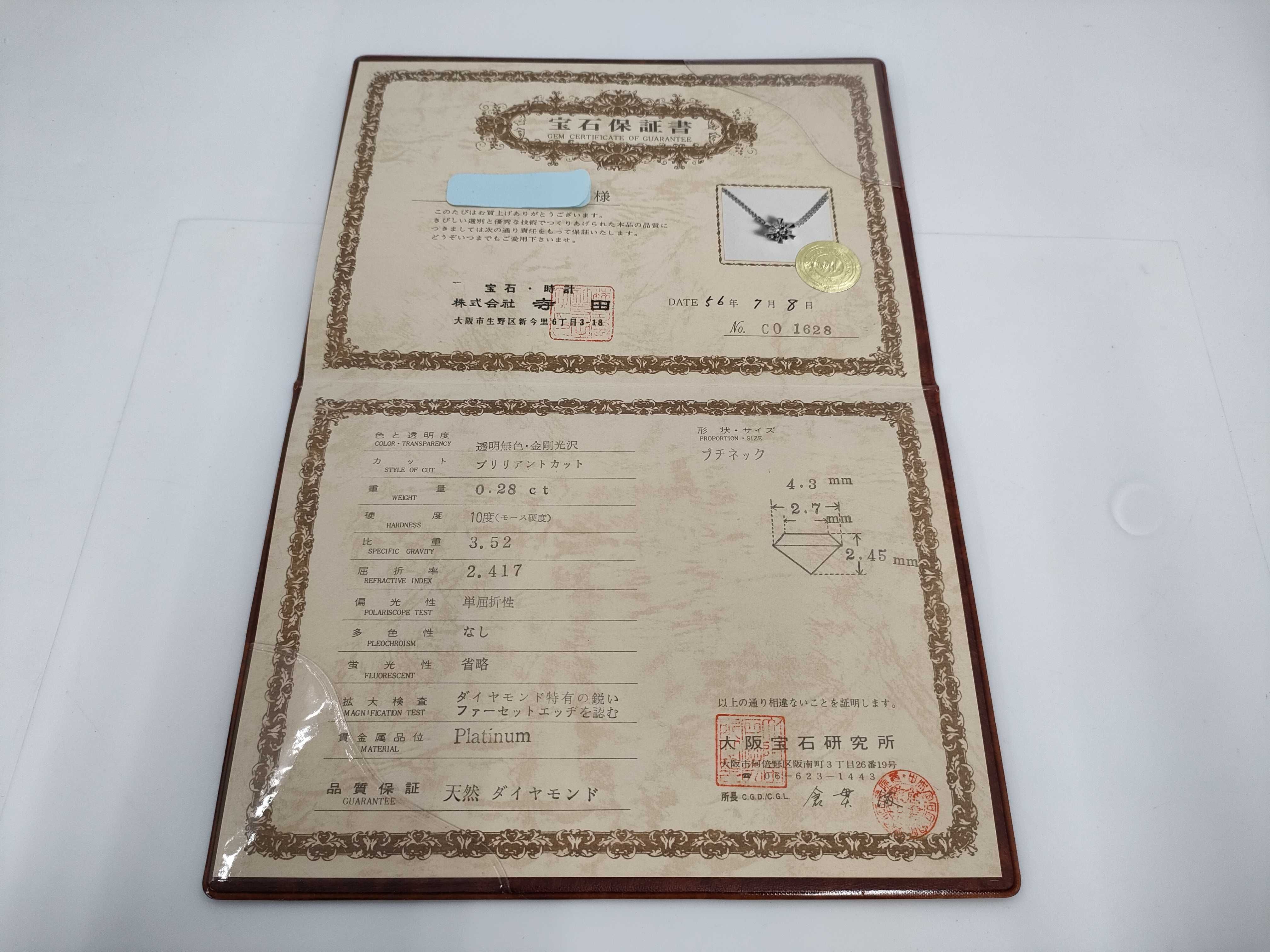 ダイヤ評価=I-SI2-GD-NONE(他鑑/グレード保証なし). トップPm刻印あり. 分析結果⇒Pt87.3% Pd10.5%. 【付属品