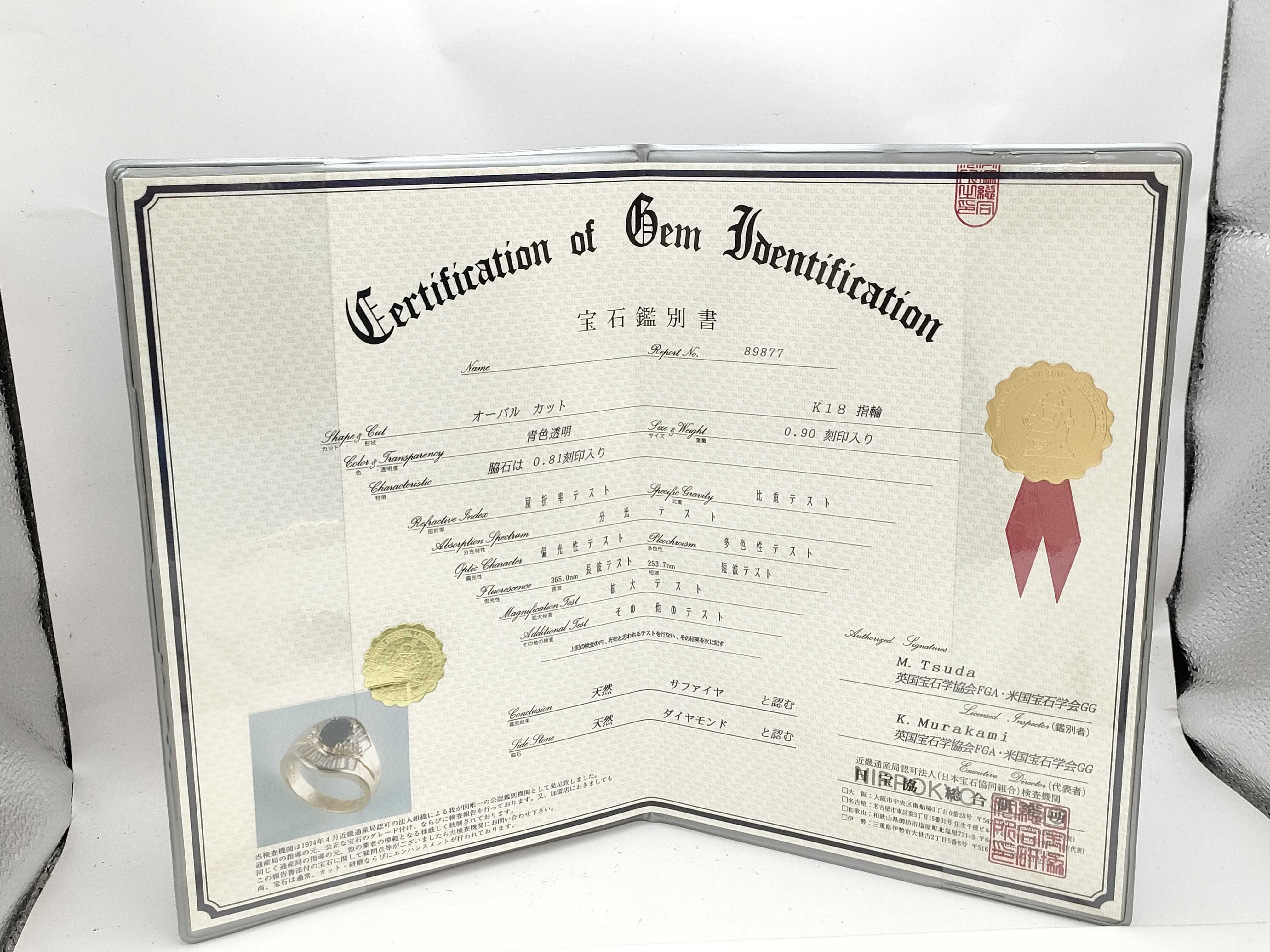 サファイア評価=B(他鑑). ダイヤ評価=C. リング歪み若干あり. 【付属品
