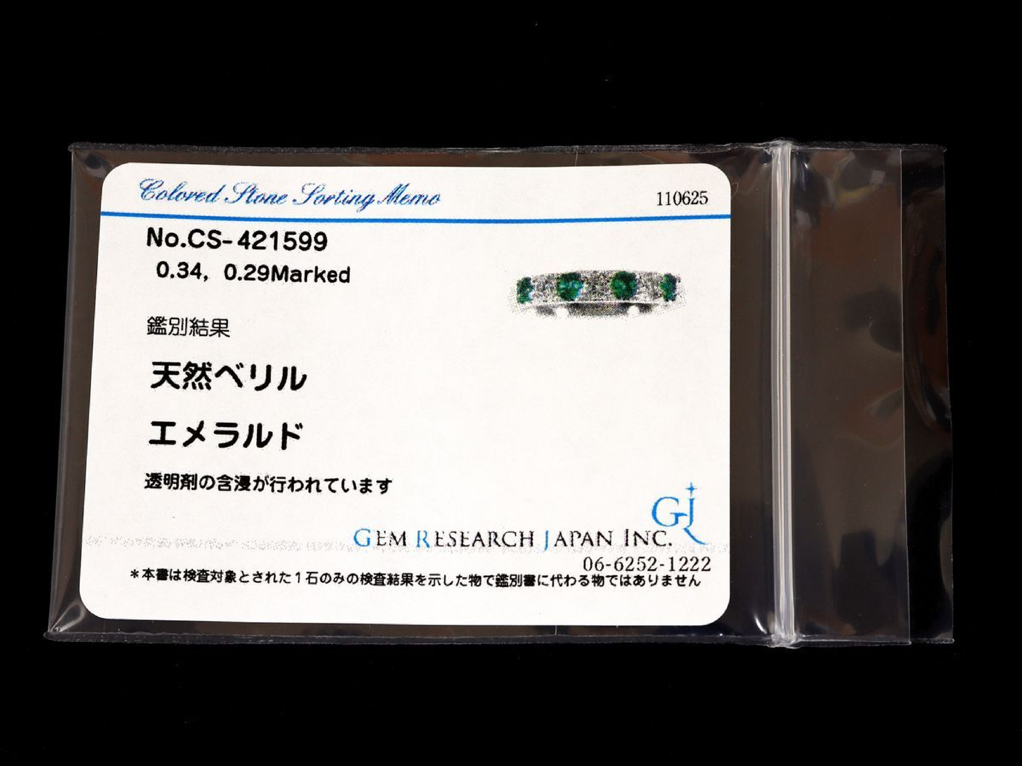 エメラルド評価=A(GRJソ). ダイヤ評価=AB. サイズ直し跡有り.【付属品