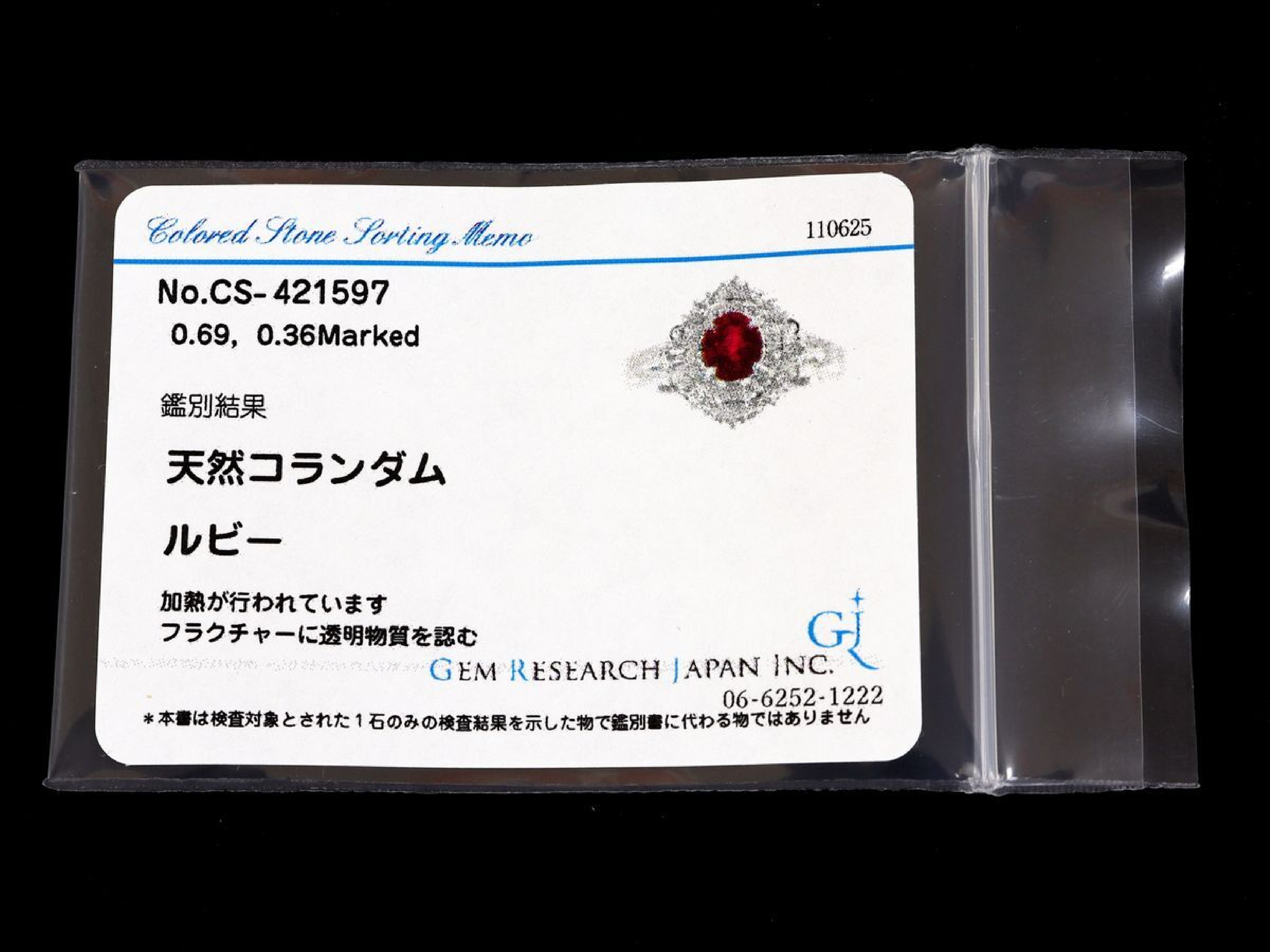 ダイヤ評価=B. ルビー ⇒ フラクチャーコメント(GRJソ).【付属品