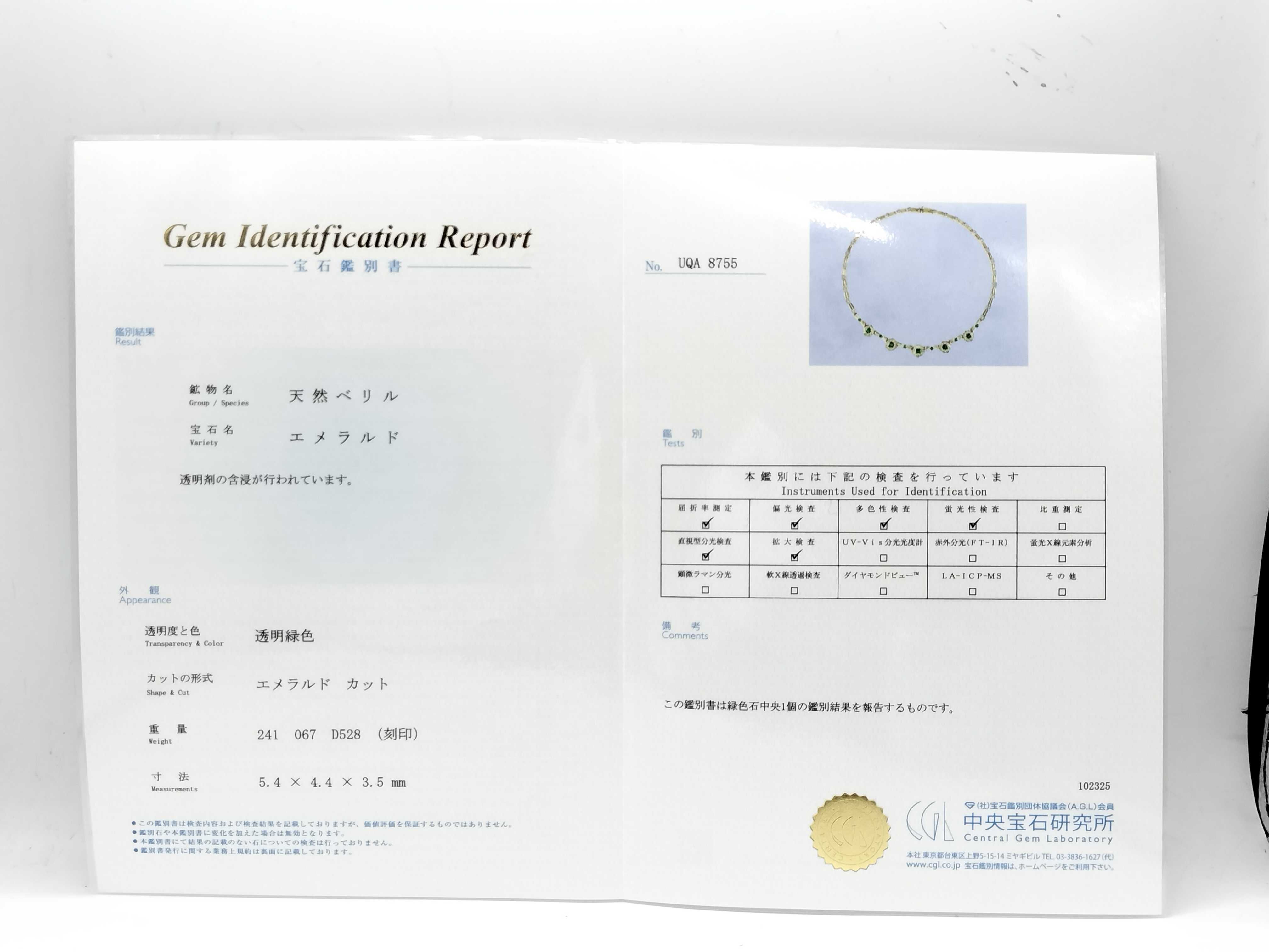 新品仕上げ済み. エメラルド評価=AB(CGL鑑/面ヒビあり). ダイヤ評価=AB. 【付属品