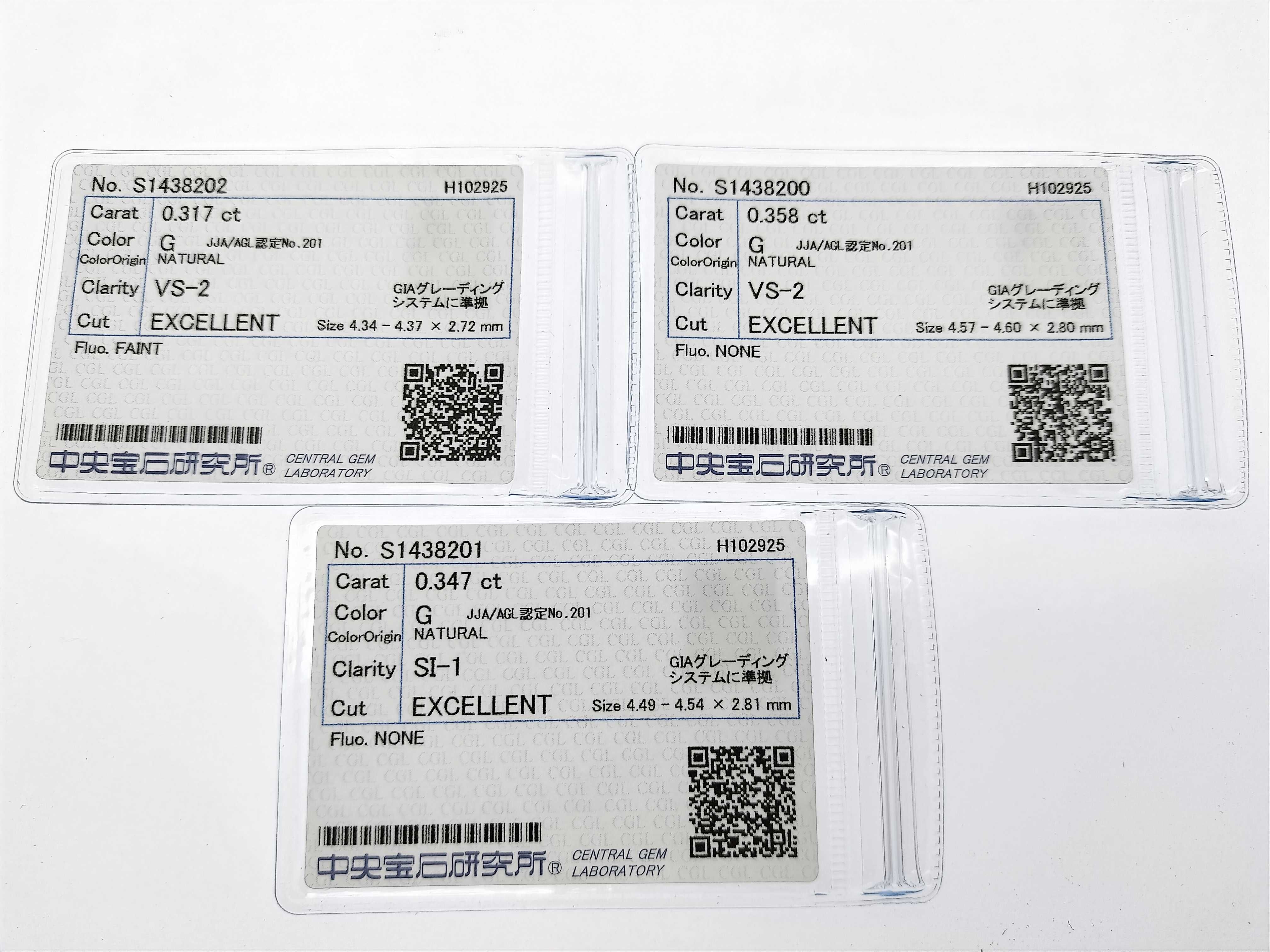 仕上げ済み. ダイヤ評価 ⇒G-VS2-EX-FAINT(0.317ct) G-VS2-EX-NONE(0.358ct) G-SI1-EX-NONE(0.347ct) CGLソ【付属品