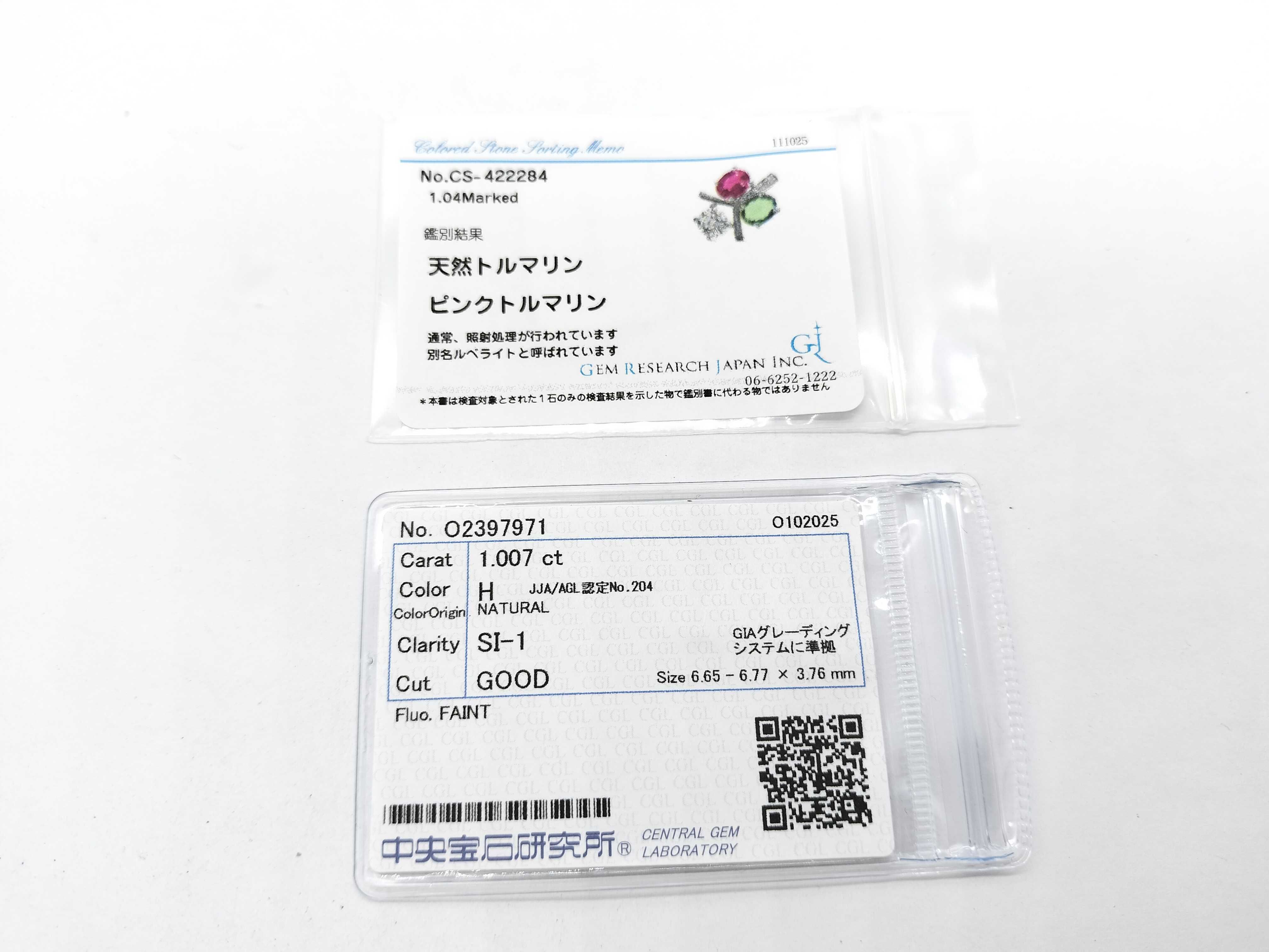 新品仕上げ済み. トルマリン評価=AB(GRJソ). 主石ダイヤ評価=H-SI1-GD-FAINT(CGLソ). 脇石ダイヤ評価=BC【付属品