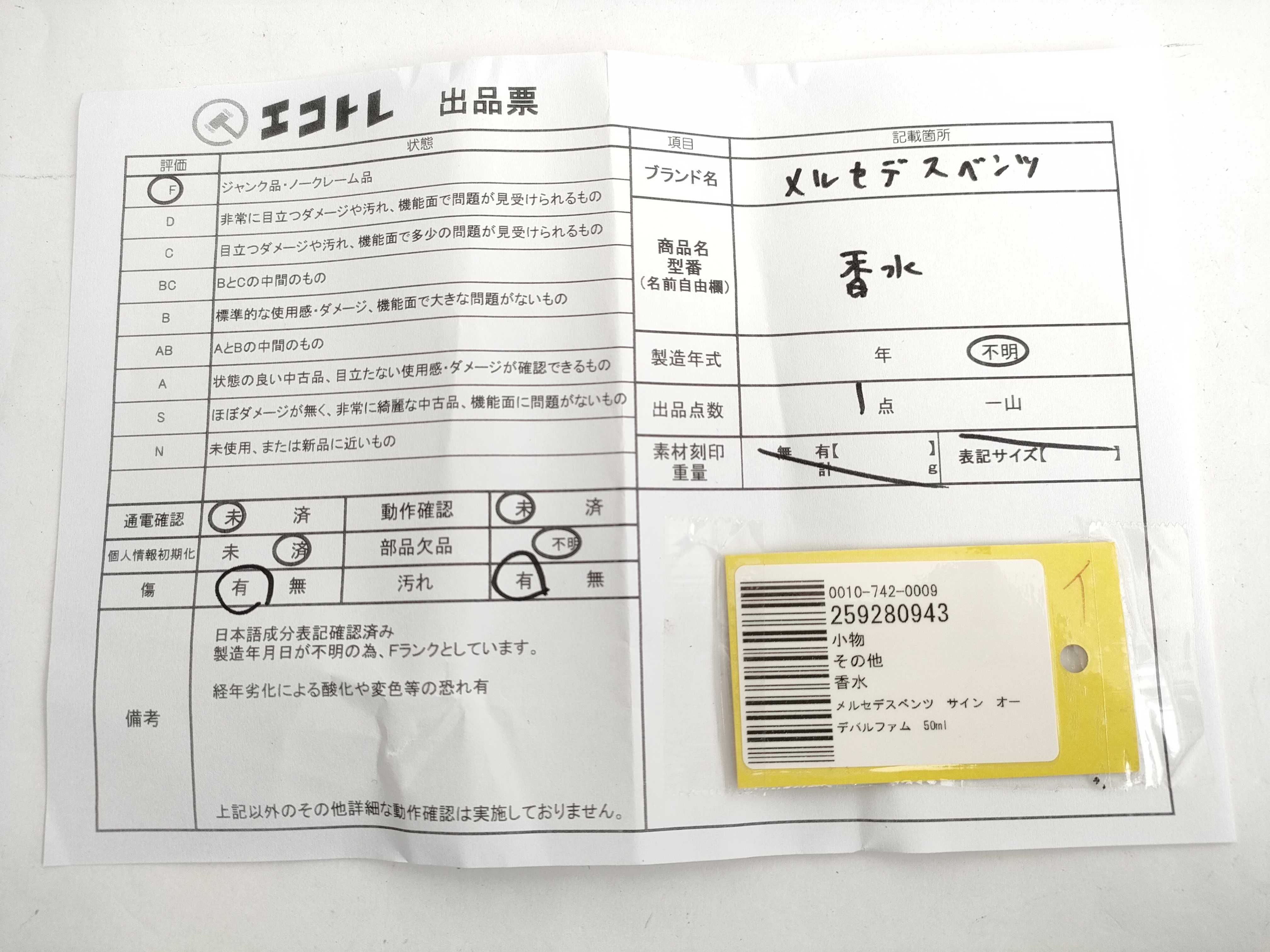 商品内容によって、JITBOXなどでの発送となる可能性がございます事ご理解下さい。年式などの商品情報詳細は写真にてご確認願います。※ご入札の際はご利用規約をよくお読みになってからのご参加お願いします。","タイプライン":"","カテゴリ":"消耗品","形状コード":"香水","付属品コード":"","シリアル・シール・型番":""