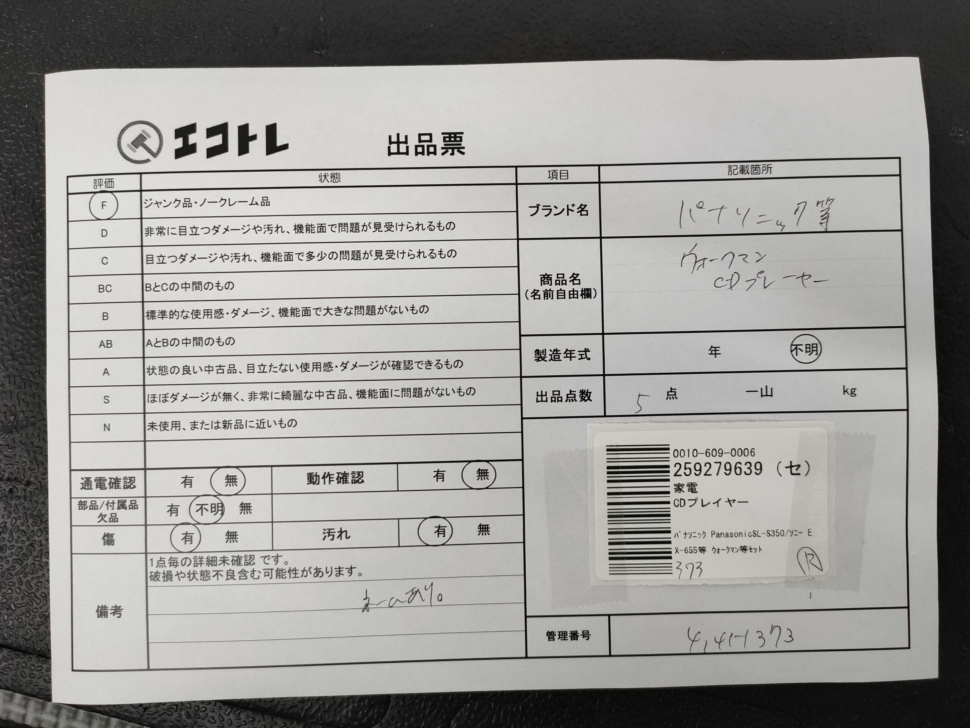 商品内容によって、JITBOXなどでの発送となる可能性がございます事ご理解下さい。年式などの商品情報詳細は写真にてご確認願います。※ご入札の際はご利用規約をよくお読みになってからのご参加お願いします。","タイプライン":"","カテゴリ":"家電","形状コード":"オーディオ","付属品コード":"","シリアル・シール・型番":""