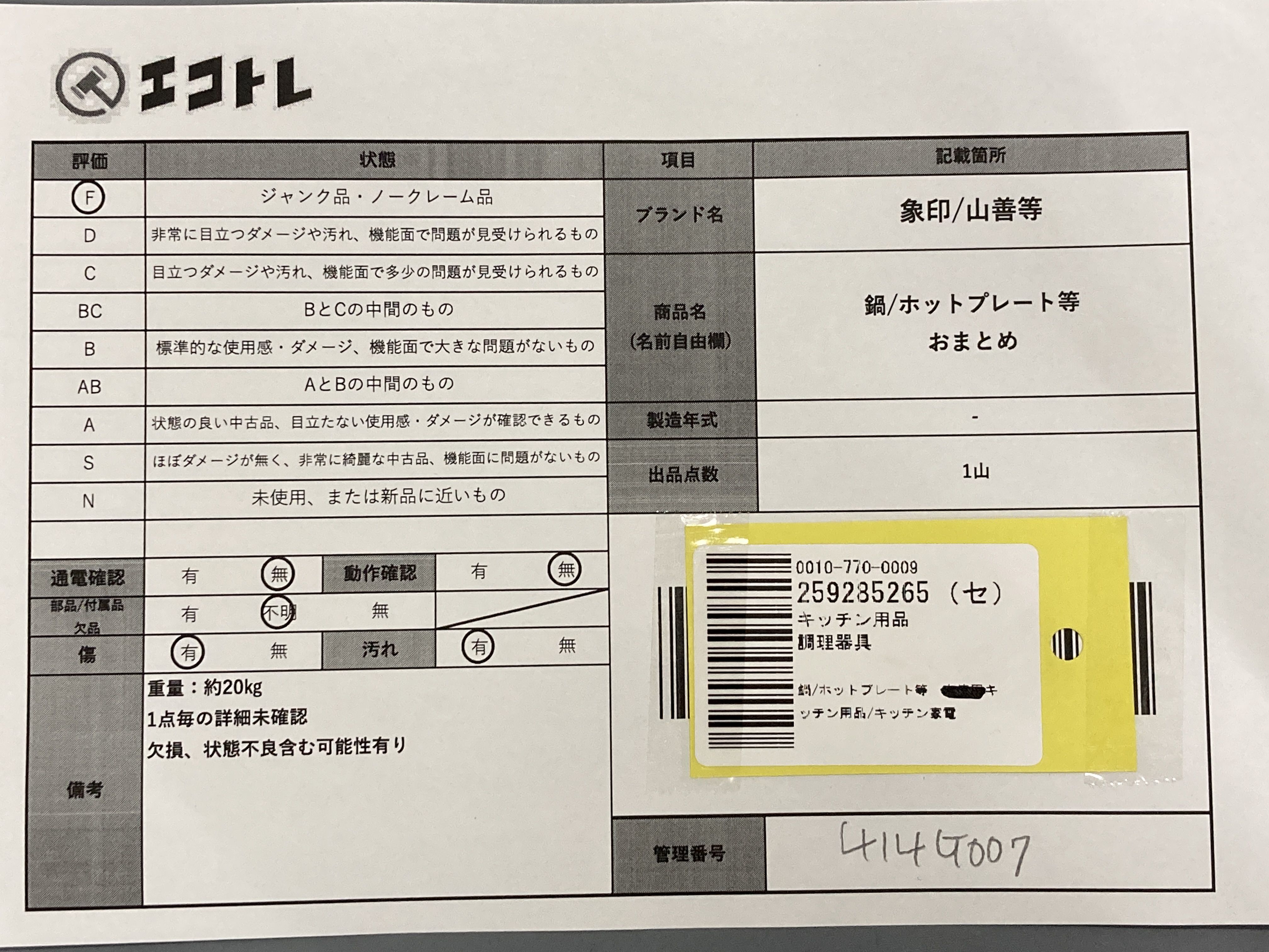 商品内容によって、JITBOXなどでの発送となる可能性がございます事ご理解下さい。年式などの商品情報詳細は写真にてご確認願います。※ご入札の際はご利用規約をよくお読みになってからのご参加お願いします。","タイプライン":"","カテゴリ":"家電","形状コード":"キッチン","付属品コード":"","シリアル・シール・型番":""