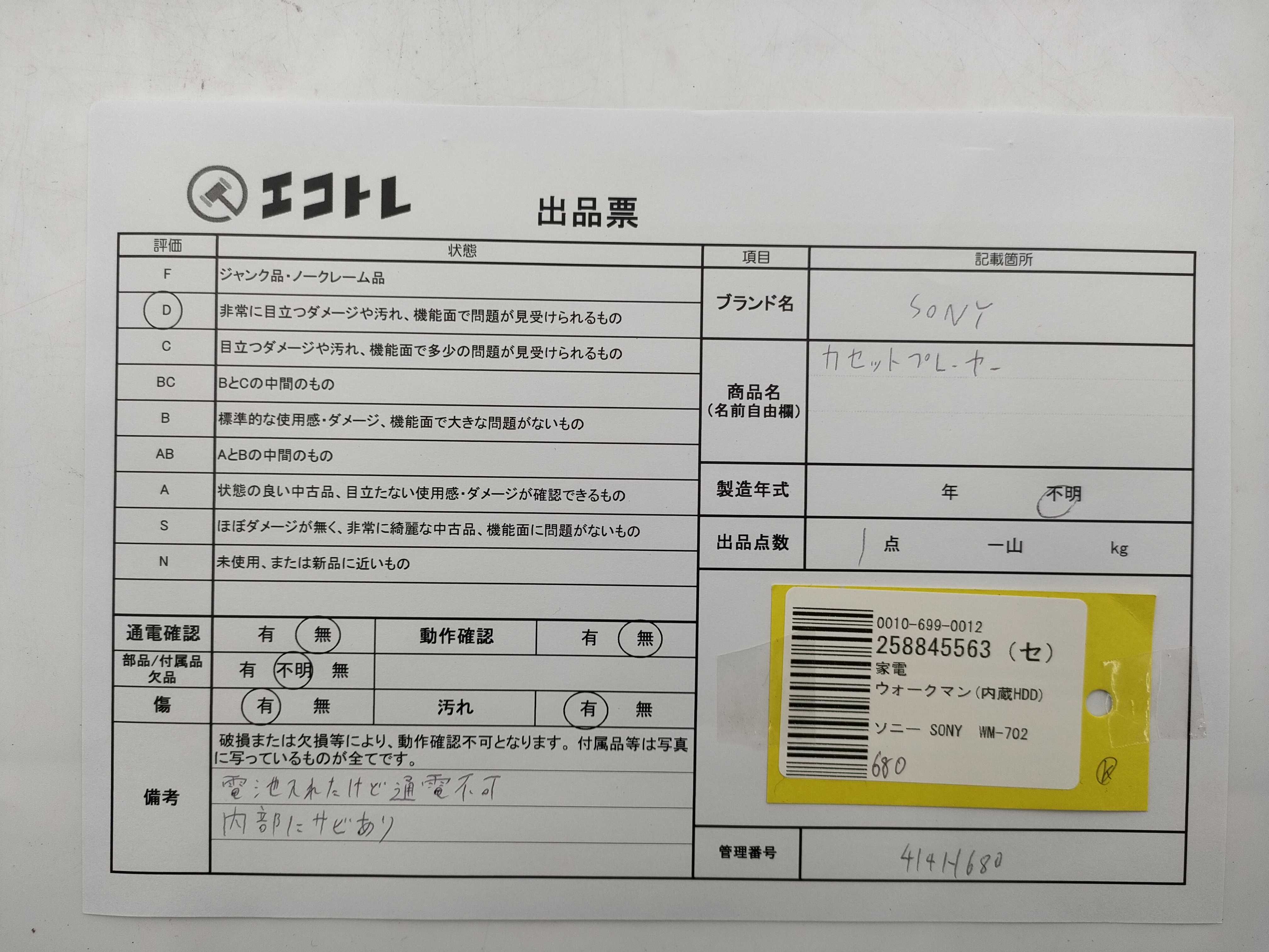 商品内容によって、JITBOXなどでの発送となる可能性がございます事ご理解下さい。年式などの商品情報詳細は写真にてご確認願います。※ご入札の際はご利用規約をよくお読みになってからのご参加お願いします。","タイプライン":"","カテゴリ":"家電","形状コード":"オーディオ","付属品コード":"","シリアル・シール・型番":""