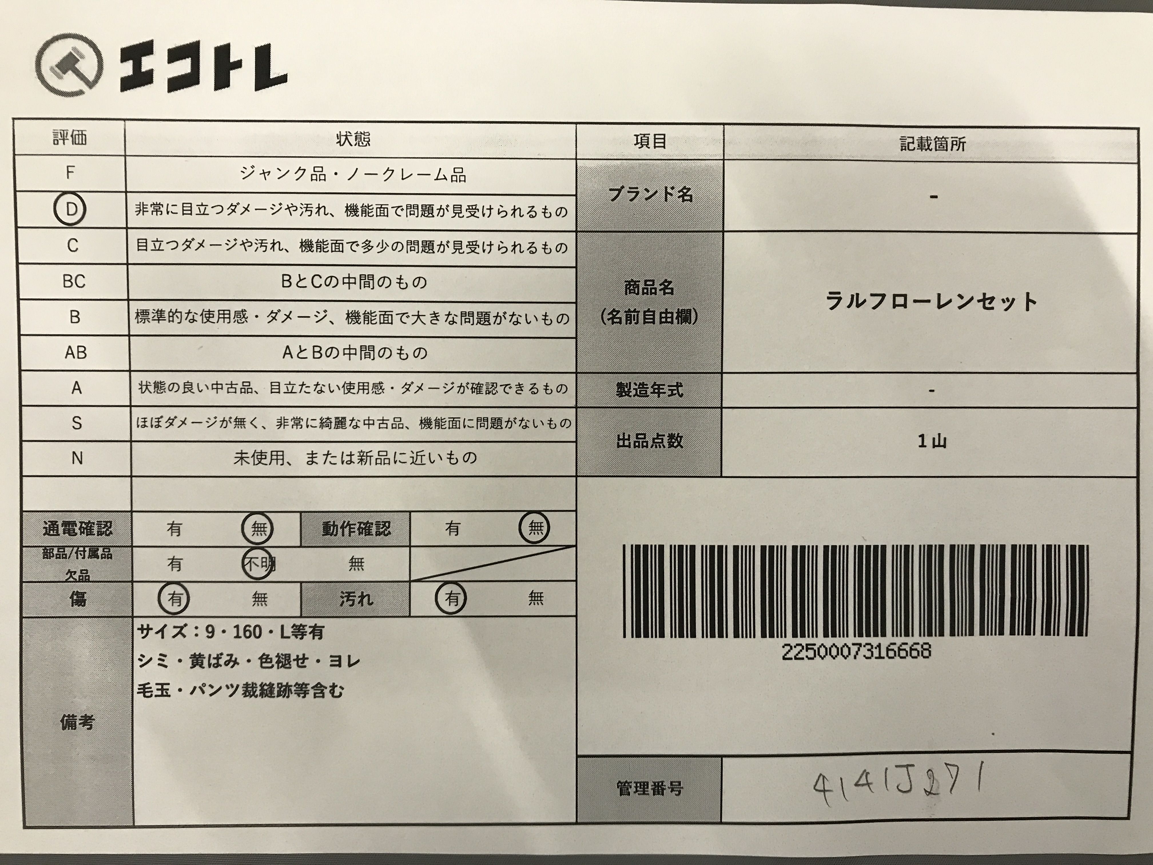 商品内容によって、JITBOXなどでの発送となる可能性がございます事ご理解下さい。年式などの商品情報詳細は写真にてご確認願います。※ご入札の際はご利用規約をよくお読みになってからのご参加お願いします。","タイプライン":"","カテゴリ":"アパレル","形状コード":"トップス","付属品コード":"","シリアル・シール・型番":""