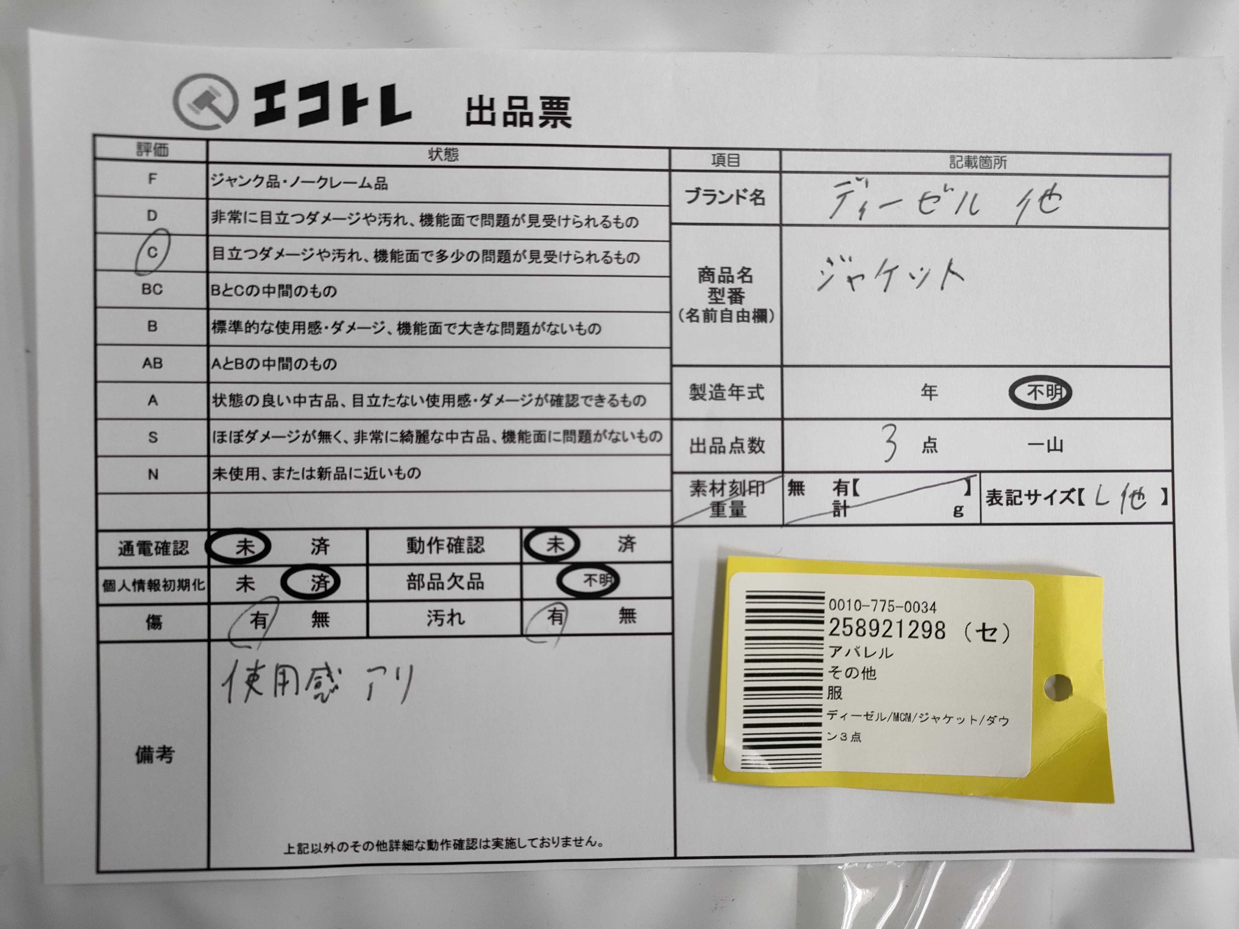 商品内容によって、JITBOXなどでの発送となる可能性がございます事ご理解下さい。年式などの商品情報詳細は写真にてご確認願います。※ご入札の際はご利用規約をよくお読みになってからのご参加お願いします。","タイプライン":"","カテゴリ":"アパレル","形状コード":"ジャケット","付属品コード":"","シリアル・シール・型番":""