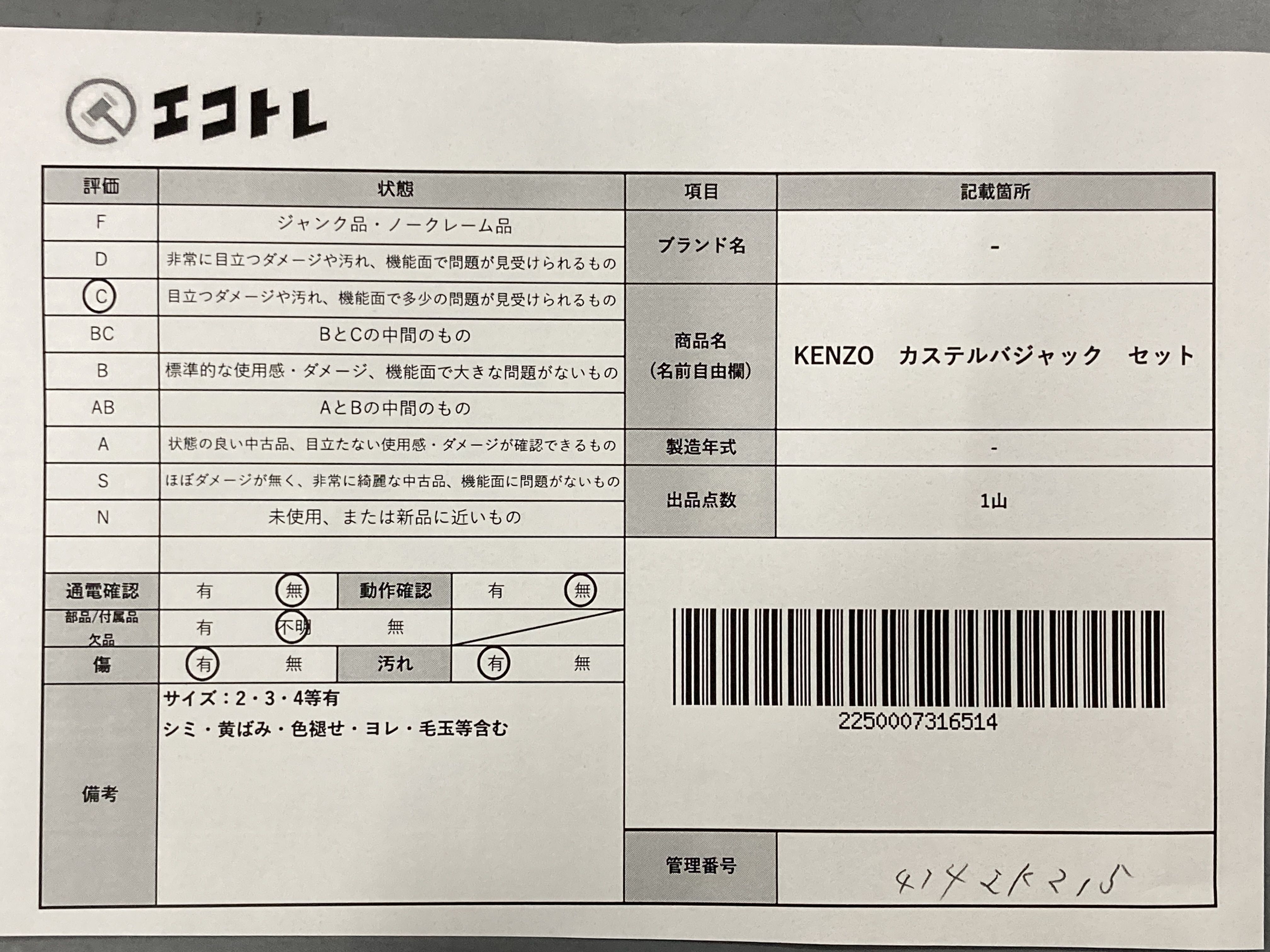 商品内容によって、JITBOXなどでの発送となる可能性がございます事ご理解下さい。年式などの商品情報詳細は写真にてご確認願います。※ご入札の際はご利用規約をよくお読みになってからのご参加お願いします。","タイプライン":"","カテゴリ":"アパレル","形状コード":"トップス","付属品コード":"","シリアル・シール・型番":""