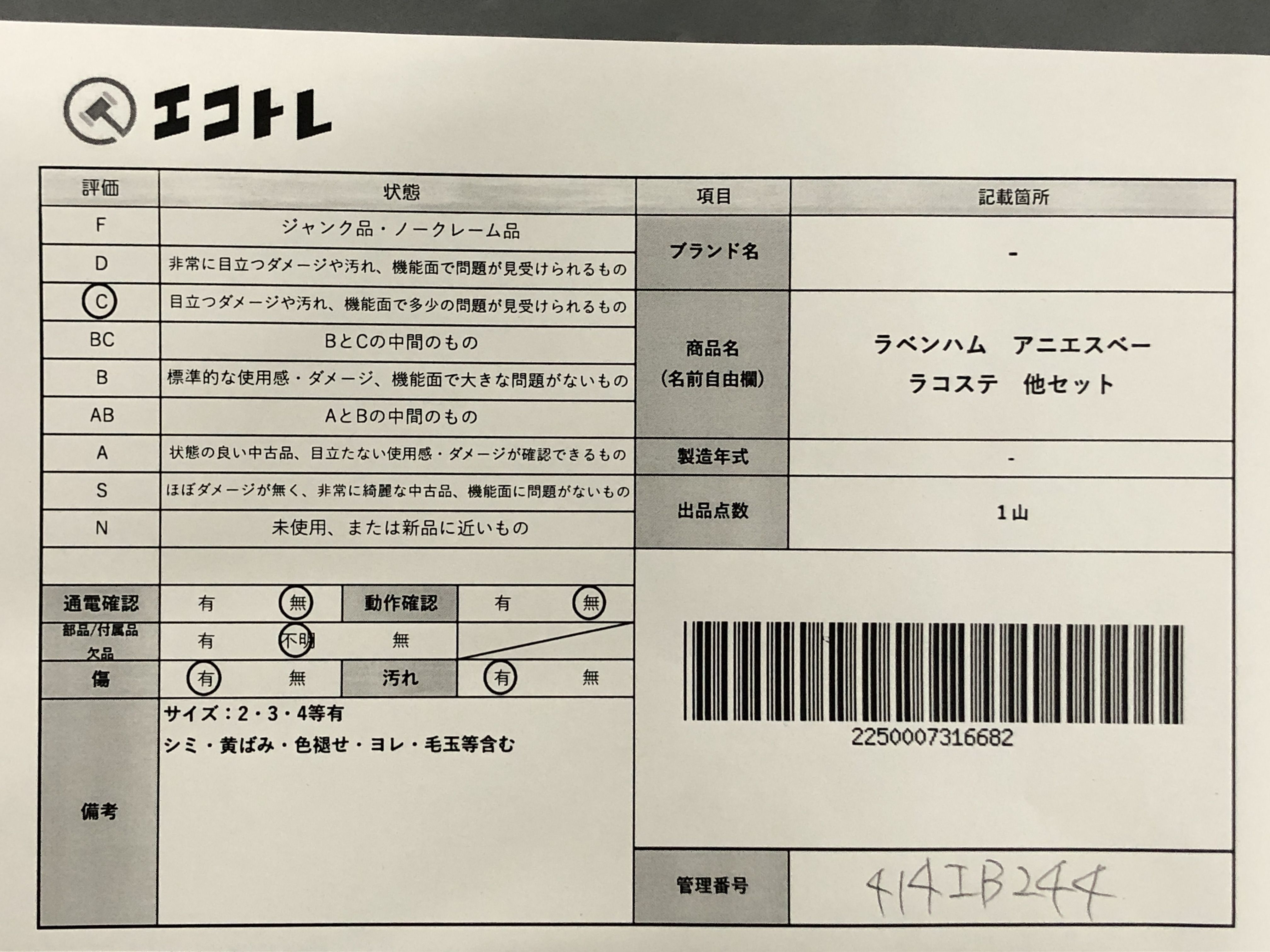 商品内容によって、JITBOXなどでの発送となる可能性がございます事ご理解下さい。年式などの商品情報詳細は写真にてご確認願います。※ご入札の際はご利用規約をよくお読みになってからのご参加お願いします。","タイプライン":"","カテゴリ":"アパレル","形状コード":"トップス","付属品コード":"","シリアル・シール・型番":""