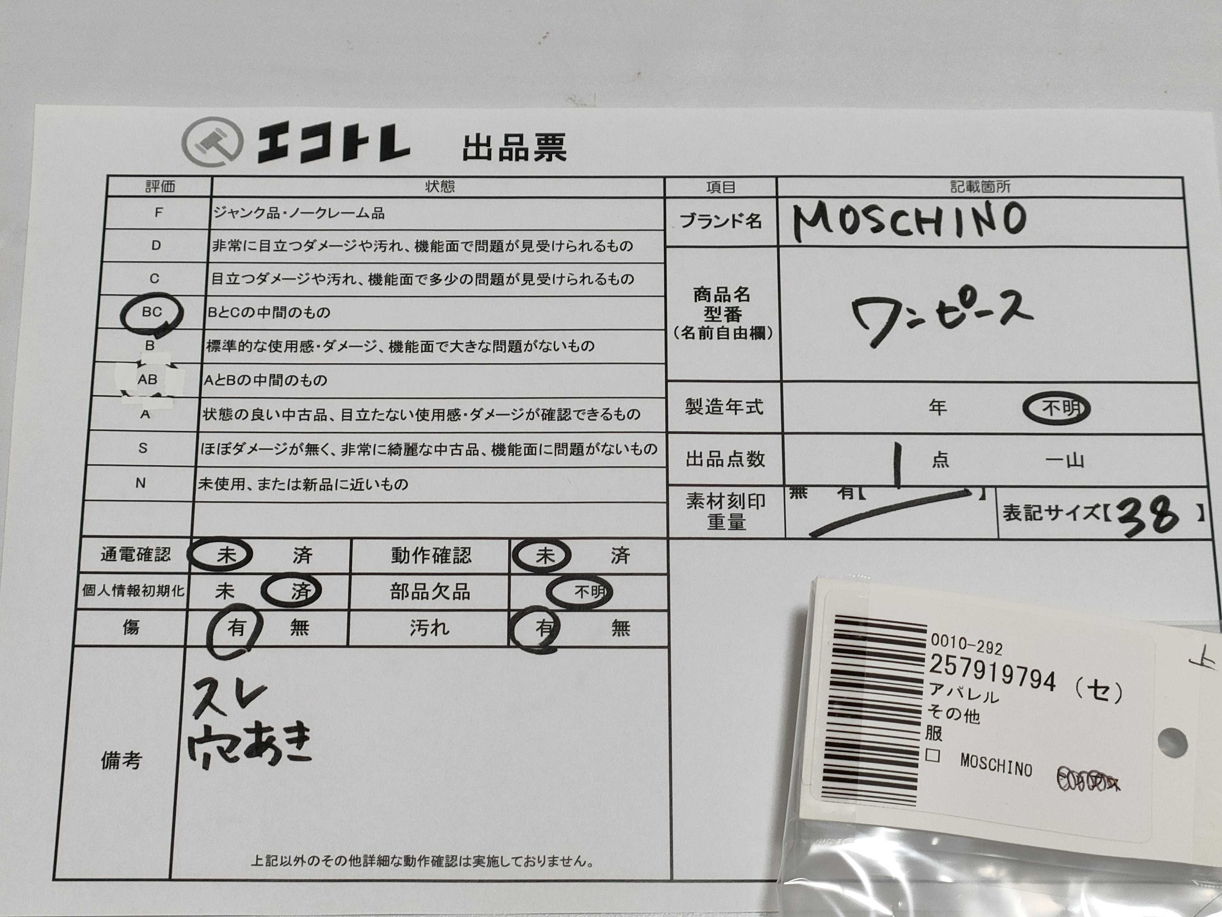 商品内容によって、JITBOXなどでの発送となる可能性がございます事ご理解下さい。年式などの商品情報詳細は写真にてご確認願います。※ご入札の際はご利用規約をよくお読みになってからのご参加お願いします。","タイプライン":"","カテゴリ":"アパレル","形状コード":"ワンピース","付属品コード":"","シリアル・シール・型番":""