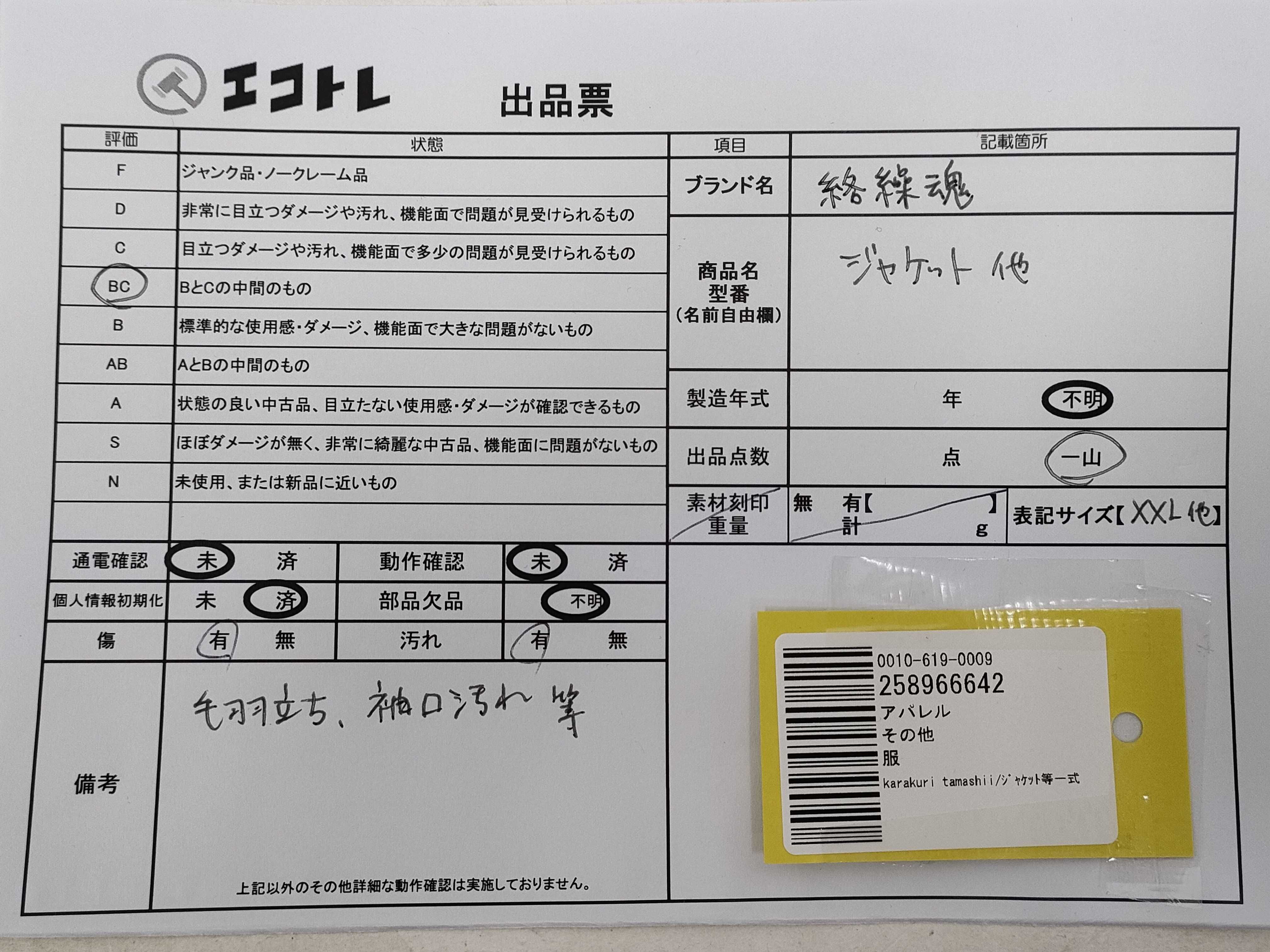商品内容によって、JITBOXなどでの発送となる可能性がございます事ご理解下さい。年式などの商品情報詳細は写真にてご確認願います。※ご入札の際はご利用規約をよくお読みになってからのご参加お願いします。","タイプライン":"","カテゴリ":"アパレル","形状コード":"ジャケット","付属品コード":"","シリアル・シール・型番":""
