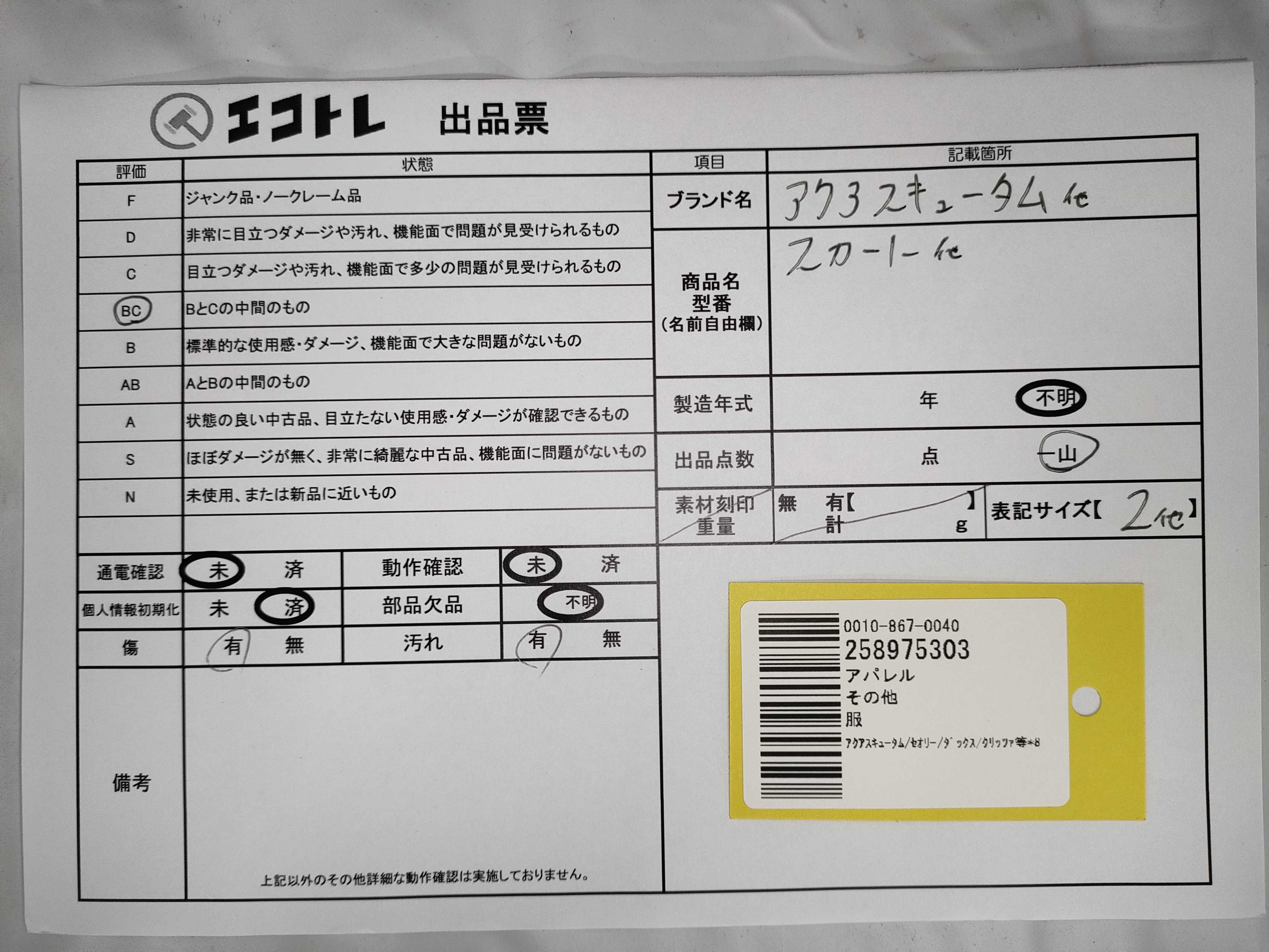 商品内容によって、JITBOXなどでの発送となる可能性がございます事ご理解下さい。年式などの商品情報詳細は写真にてご確認願います。※ご入札の際はご利用規約をよくお読みになってからのご参加お願いします。","タイプライン":"","カテゴリ":"アパレル","形状コード":"スカート","付属品コード":"","シリアル・シール・型番":""