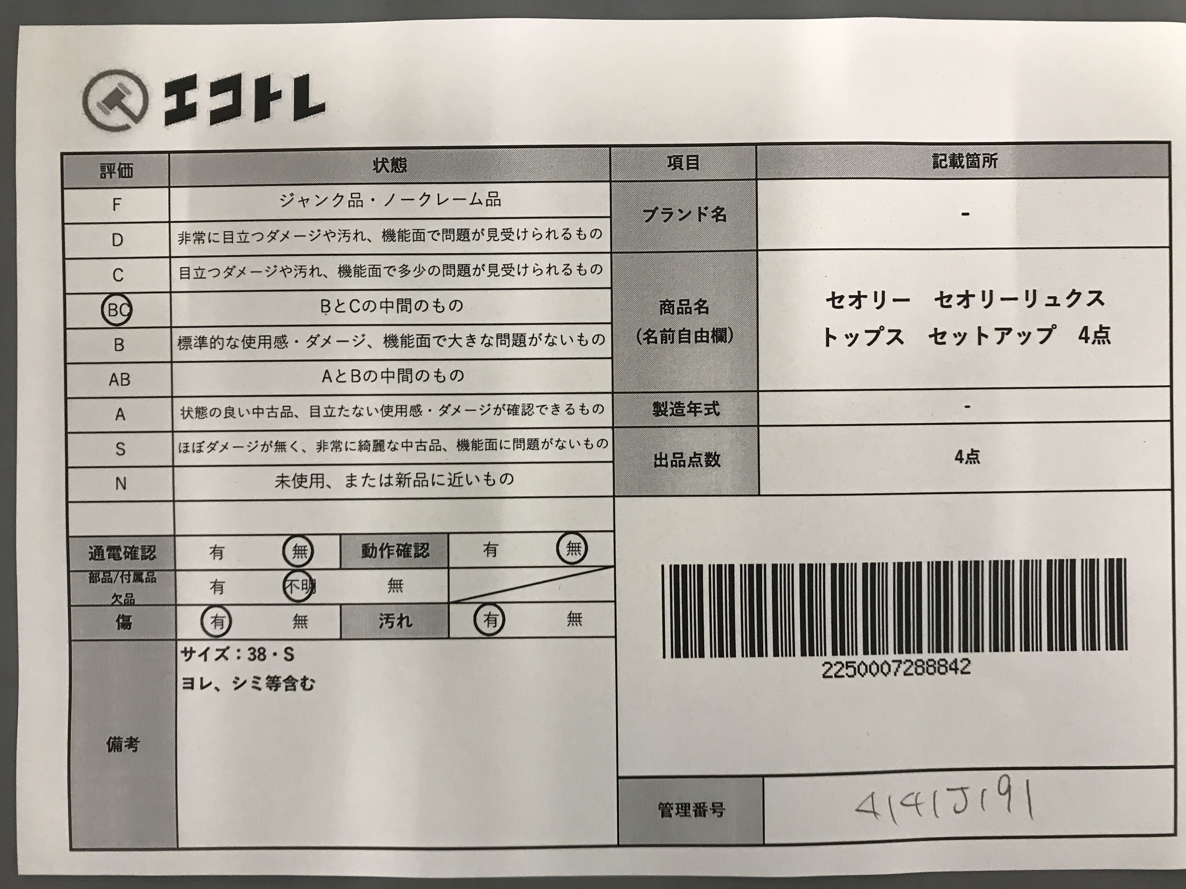 商品内容によって、JITBOXなどでの発送となる可能性がございます事ご理解下さい。年式などの商品情報詳細は写真にてご確認願います。※ご入札の際はご利用規約をよくお読みになってからのご参加お願いします。","タイプライン":"","カテゴリ":"アパレル","形状コード":"トップス","付属品コード":"","シリアル・シール・型番":""