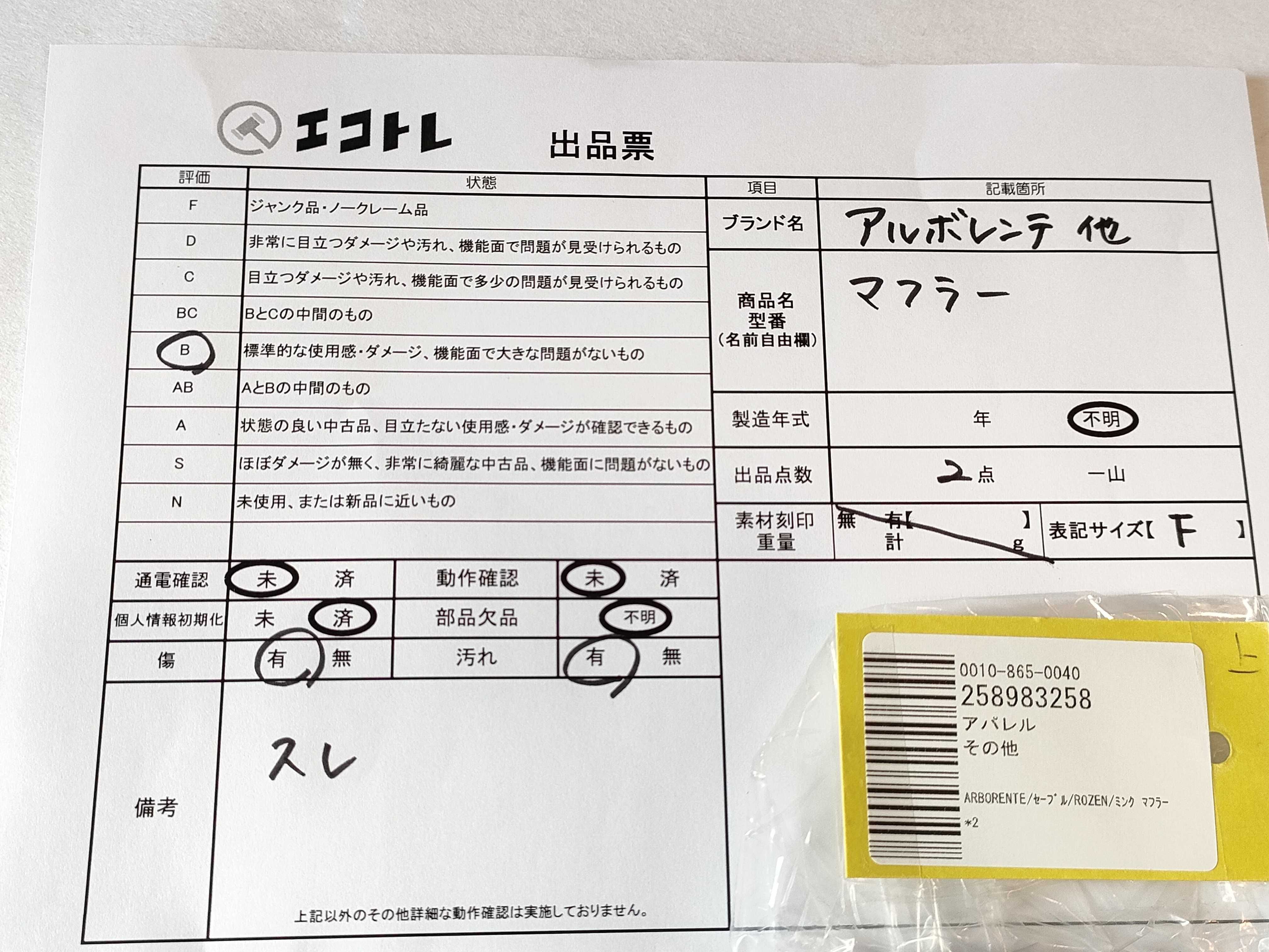 商品内容によって、JITBOXなどでの発送となる可能性がございます事ご理解下さい。年式などの商品情報詳細は写真にてご確認願います。※ご入札の際はご利用規約をよくお読みになってからのご参加お願いします。","タイプライン":"","カテゴリ":"アパレル","形状コード":"マフラー","付属品コード":"","シリアル・シール・型番":""