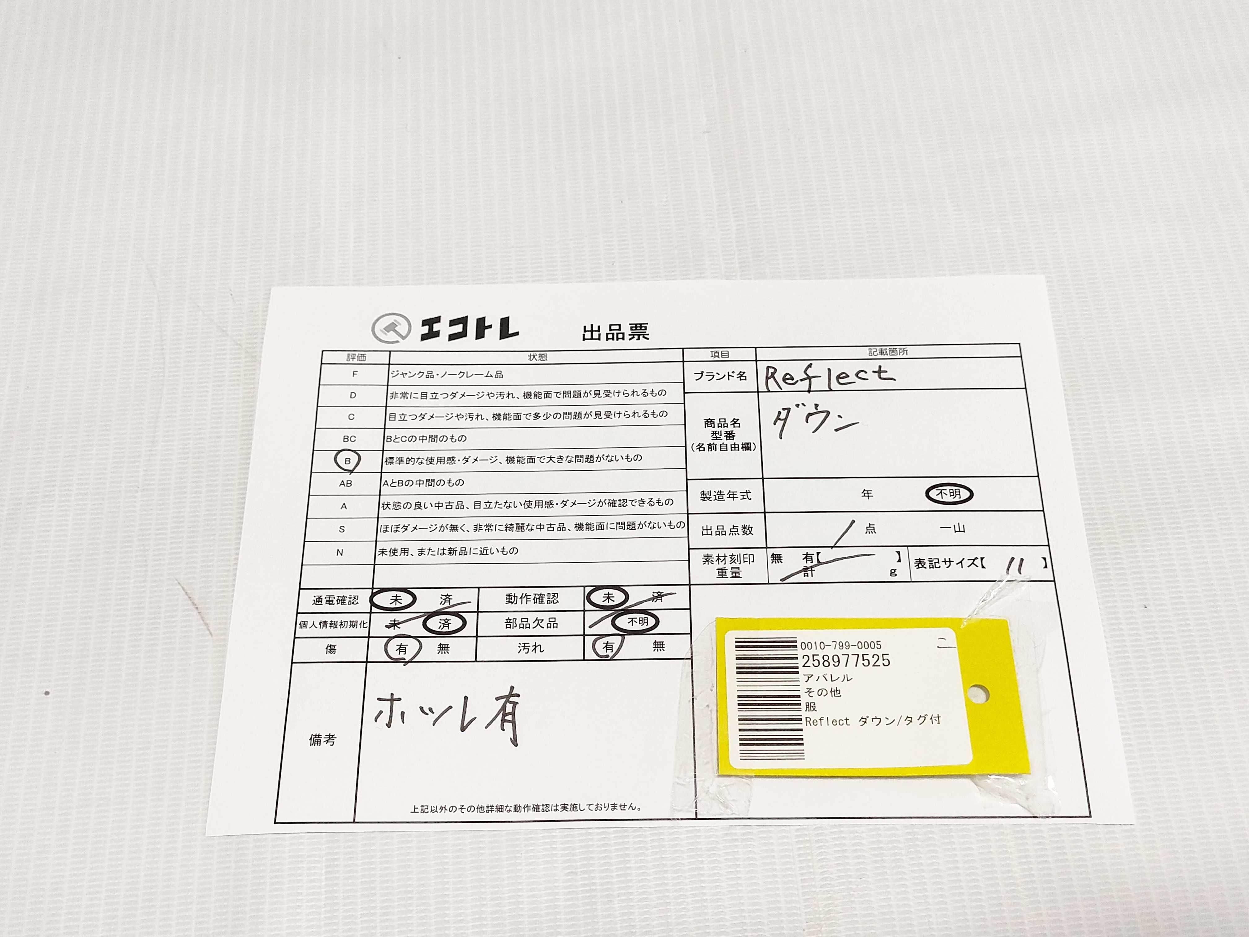 (A_0457)▼Reflect ダウン/タグ付 その他アパレル