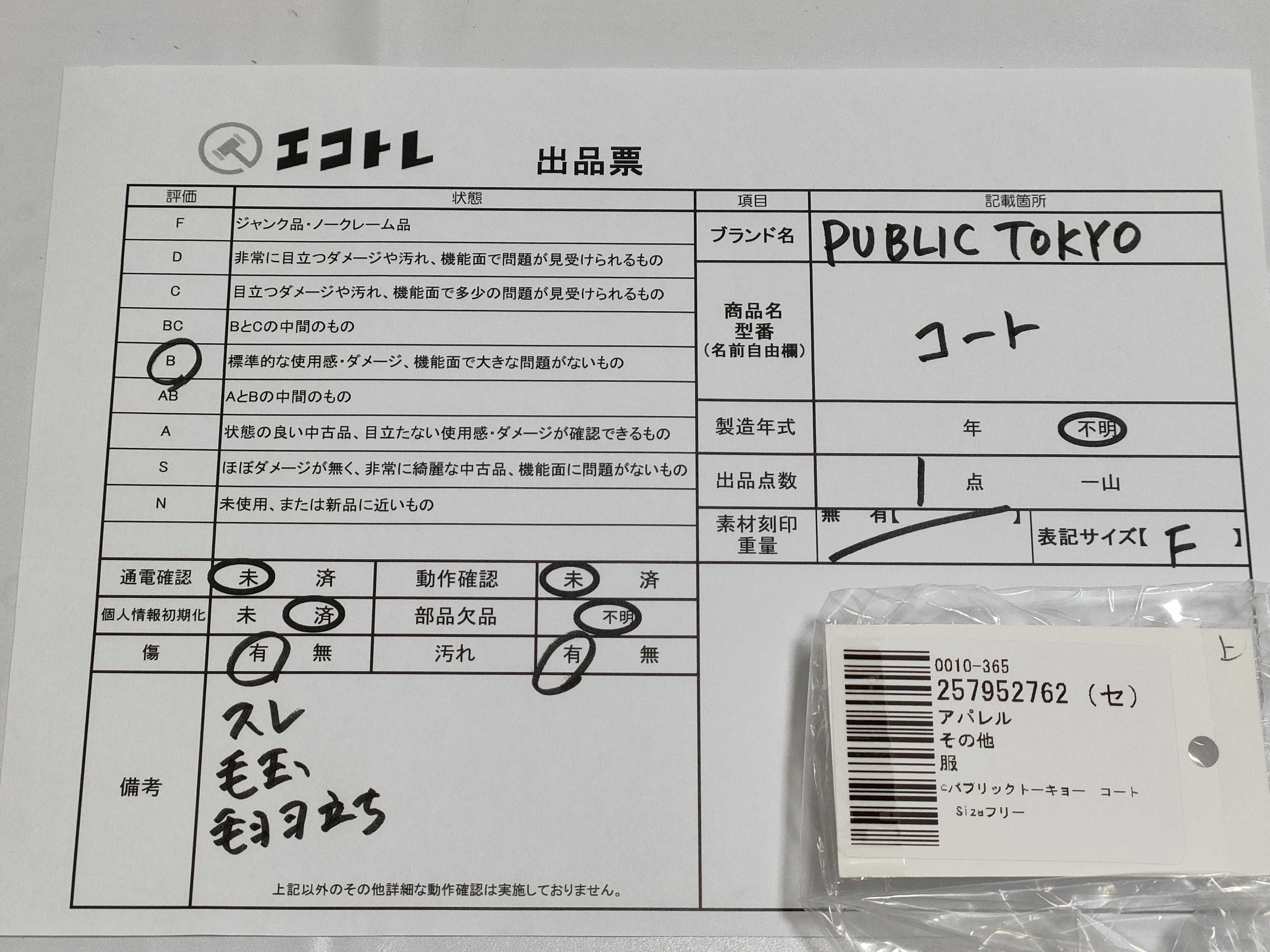 商品内容によって、JITBOXなどでの発送となる可能性がございます事ご理解下さい。年式などの商品情報詳細は写真にてご確認願います。※ご入札の際はご利用規約をよくお読みになってからのご参加お願いします。","タイプライン":"","カテゴリ":"アパレル","形状コード":"コート","付属品コード":"","シリアル・シール・型番":""