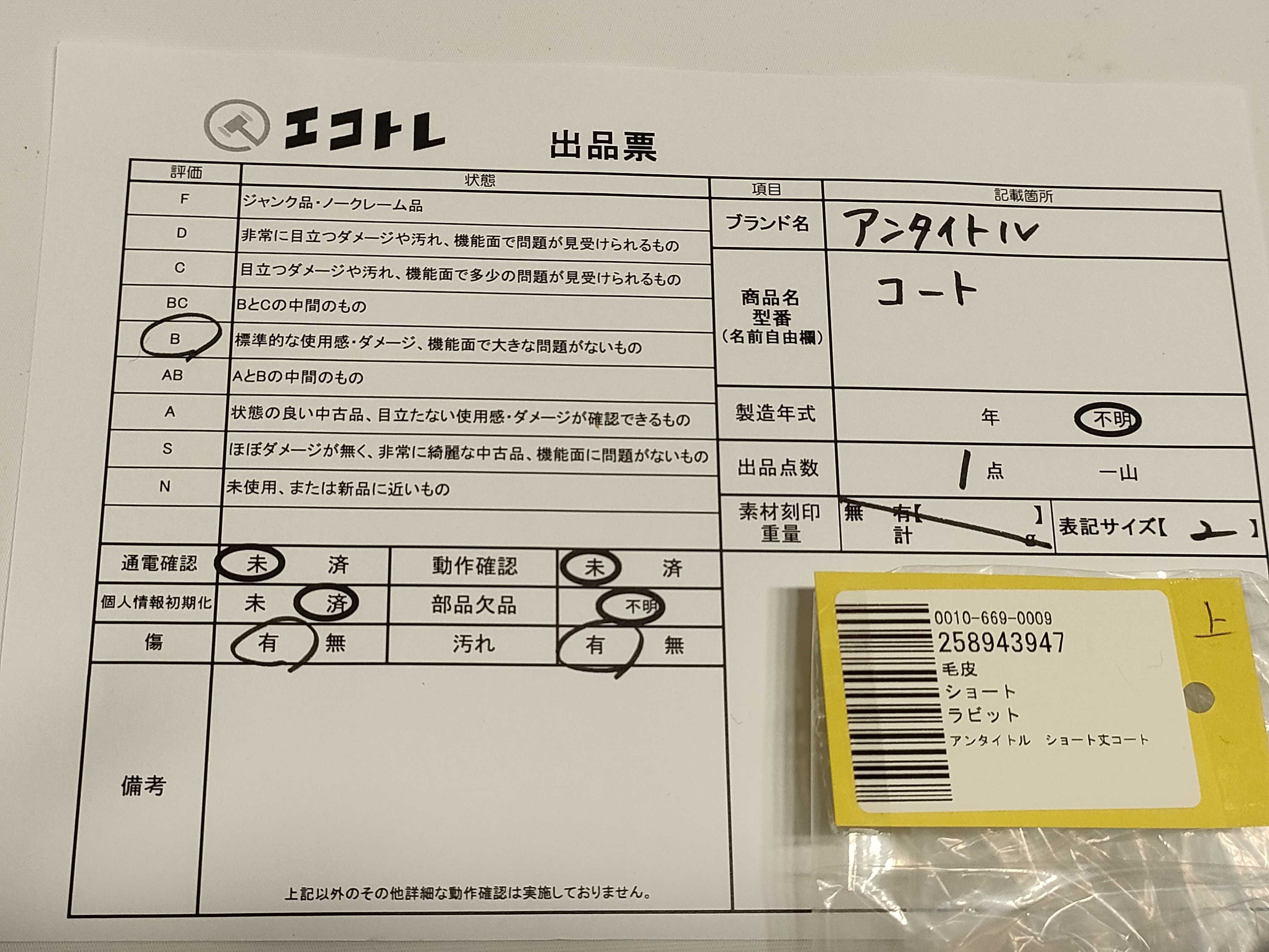商品内容によって、JITBOXなどでの発送となる可能性がございます事ご理解下さい。年式などの商品情報詳細は写真にてご確認願います。※ご入札の際はご利用規約をよくお読みになってからのご参加お願いします。","タイプライン":"","カテゴリ":"アパレル","形状コード":"コート","付属品コード":"","シリアル・シール・型番":""