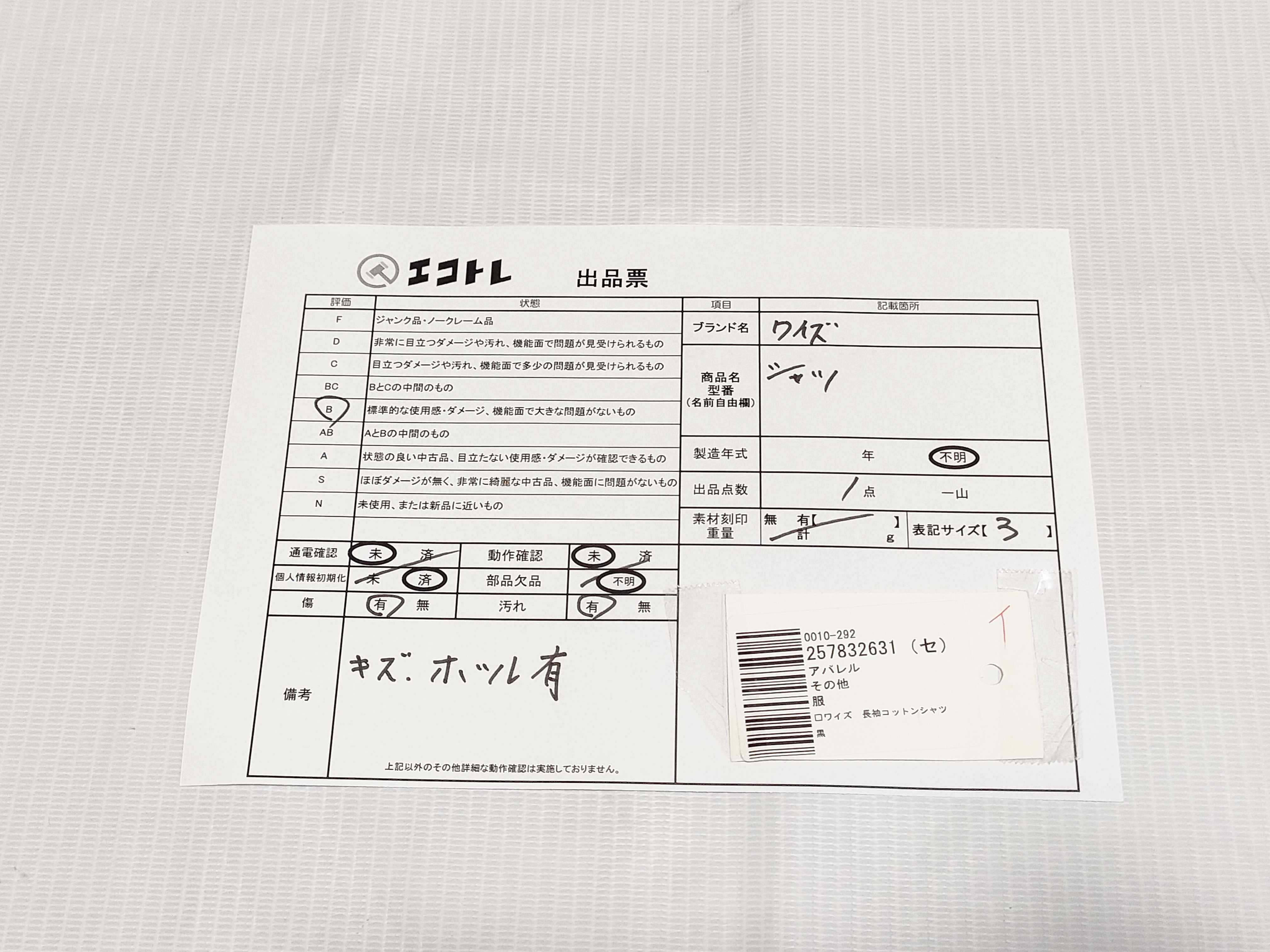 商品内容によって、JITBOXなどでの発送となる可能性がございます事ご理解下さい。年式などの商品情報詳細は写真にてご確認願います。※ご入札の際はご利用規約をよくお読みになってからのご参加お願いします。","タイプライン":"","カテゴリ":"アパレル","形状コード":"シャツ","付属品コード":"","シリアル・シール・型番":""
