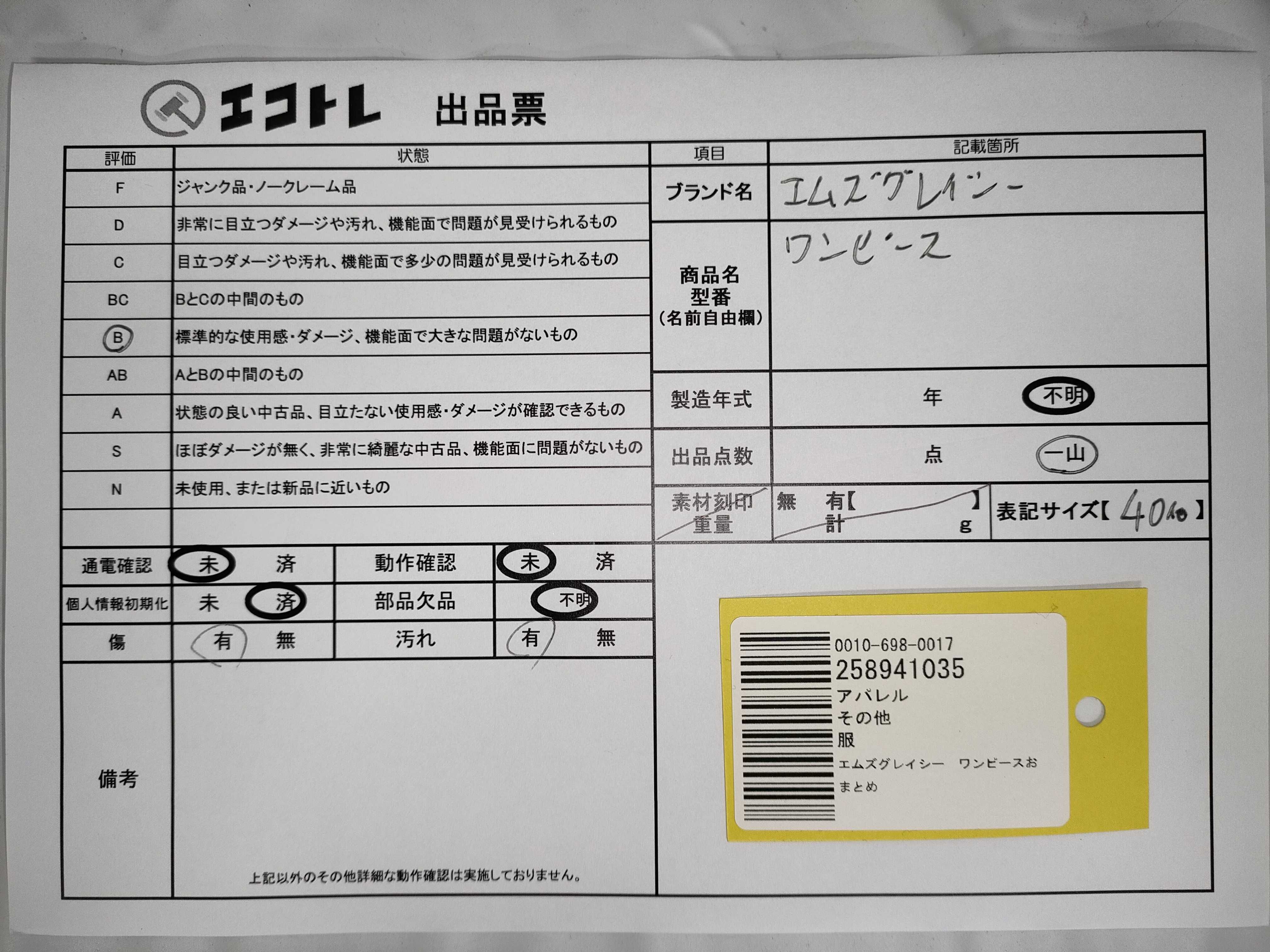 商品内容によって、JITBOXなどでの発送となる可能性がございます事ご理解下さい。年式などの商品情報詳細は写真にてご確認願います。※ご入札の際はご利用規約をよくお読みになってからのご参加お願いします。","タイプライン":"","カテゴリ":"アパレル","形状コード":"ワンピース","付属品コード":"","シリアル・シール・型番":""
