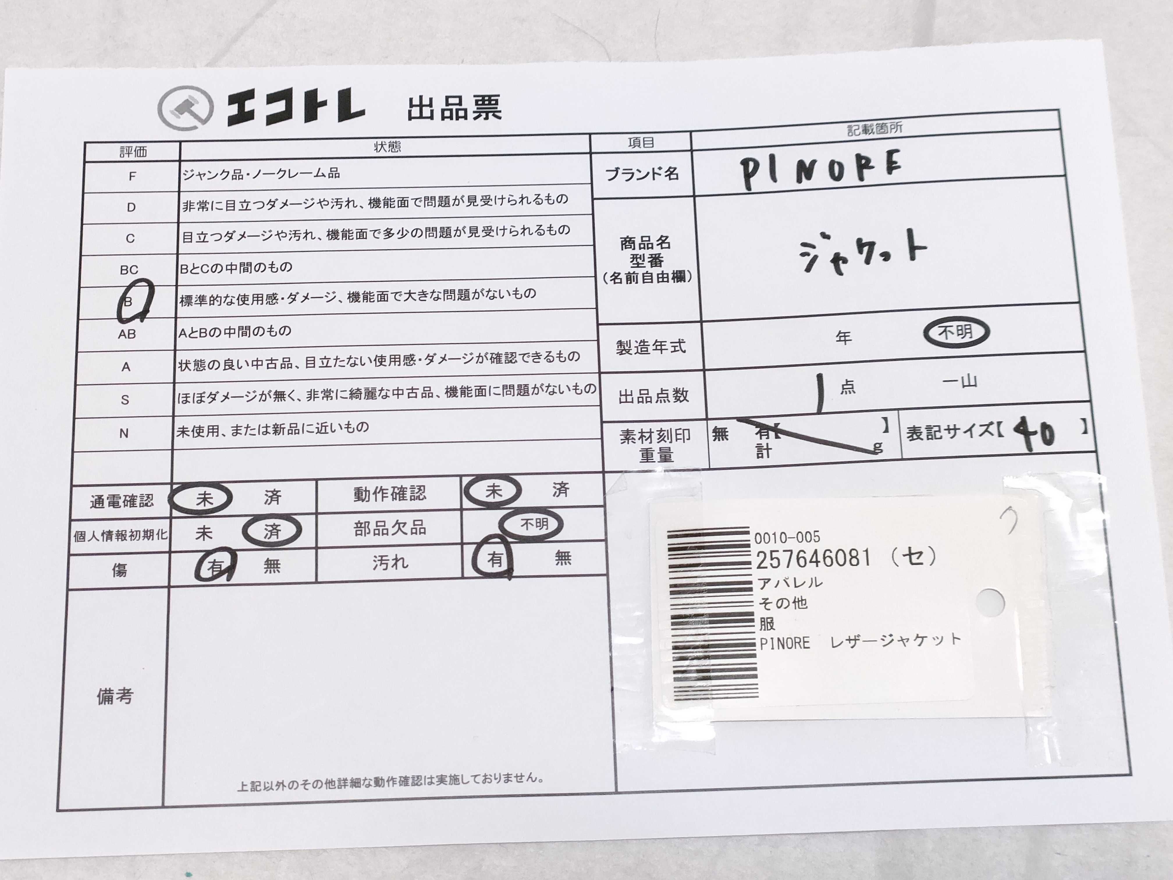 商品内容によって、JITBOXなどでの発送となる可能性がございます事ご理解下さい。年式などの商品情報詳細は写真にてご確認願います。※ご入札の際はご利用規約をよくお読みになってからのご参加お願いします。","タイプライン":"","カテゴリ":"アパレル","形状コード":"ジャケット","付属品コード":"","シリアル・シール・型番":""